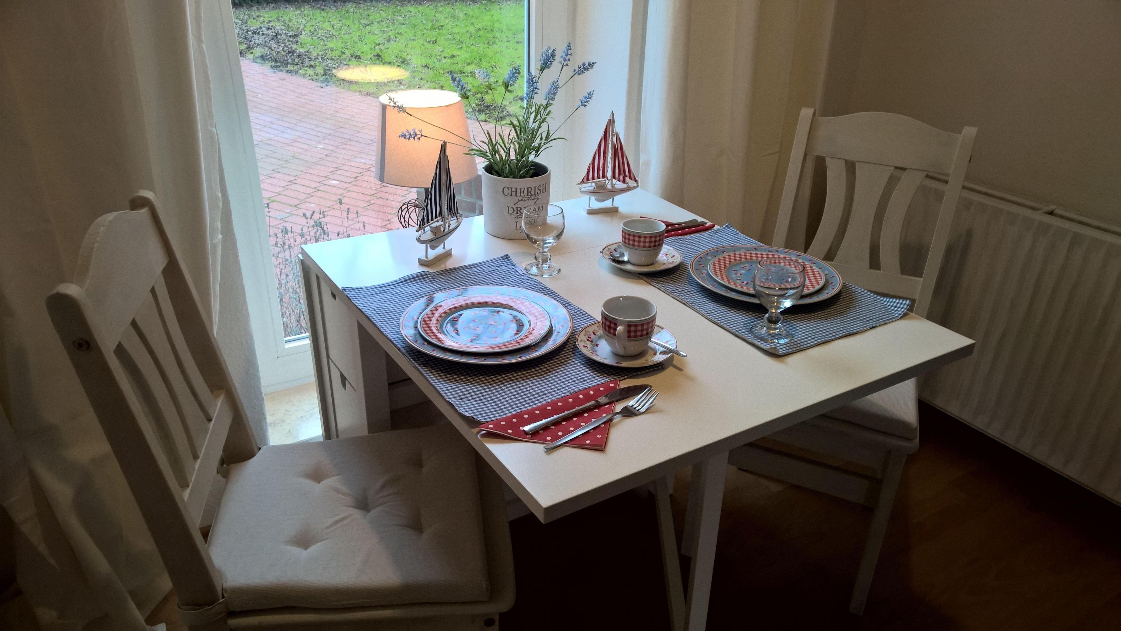 Die Ferienwohnung ist hell und modern eingerichtet. Die Küche ist komplett mit Kaffeemaschine, Wasserkocher, Eierkocher, Toaster und Geschirr ausgestattet.