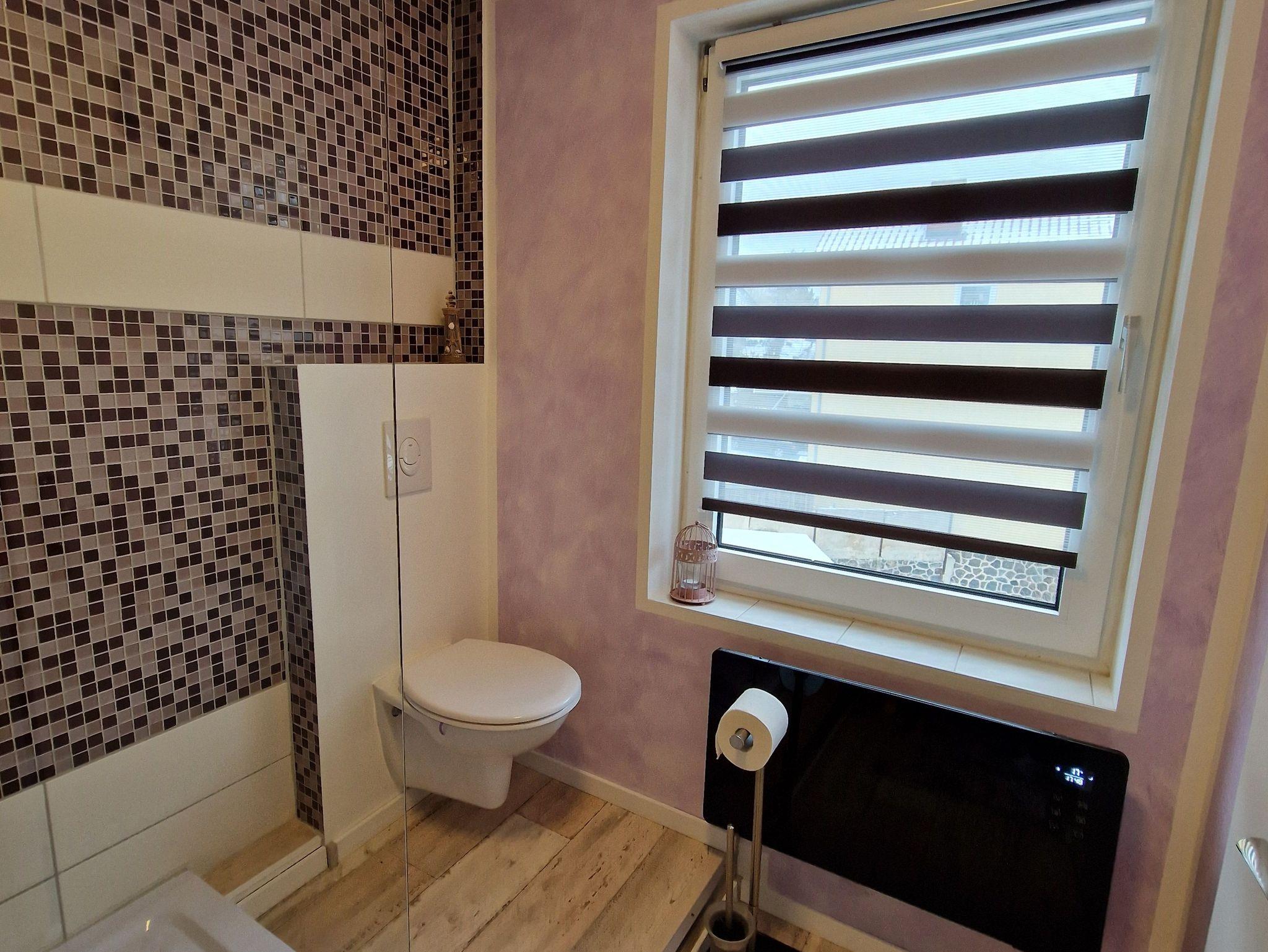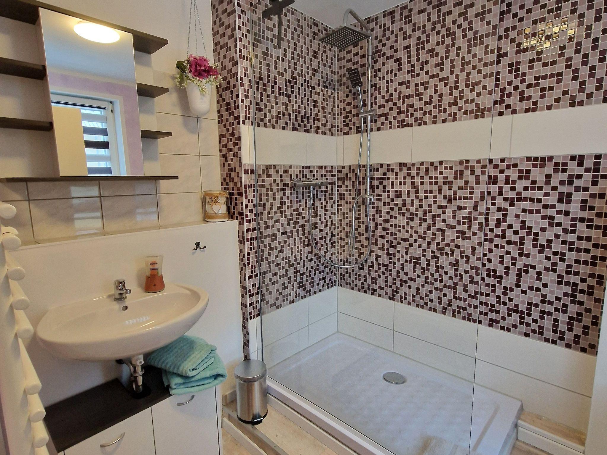 Das Badezimmer des Appartements besticht durch seine moderne Gestaltung und hochwertige Ausstattung. Eine geräumige Dusche, elegante Armaturen und flauschige Handtücher sorgen für ein luxuriöses Wohlfühlerlebnis.