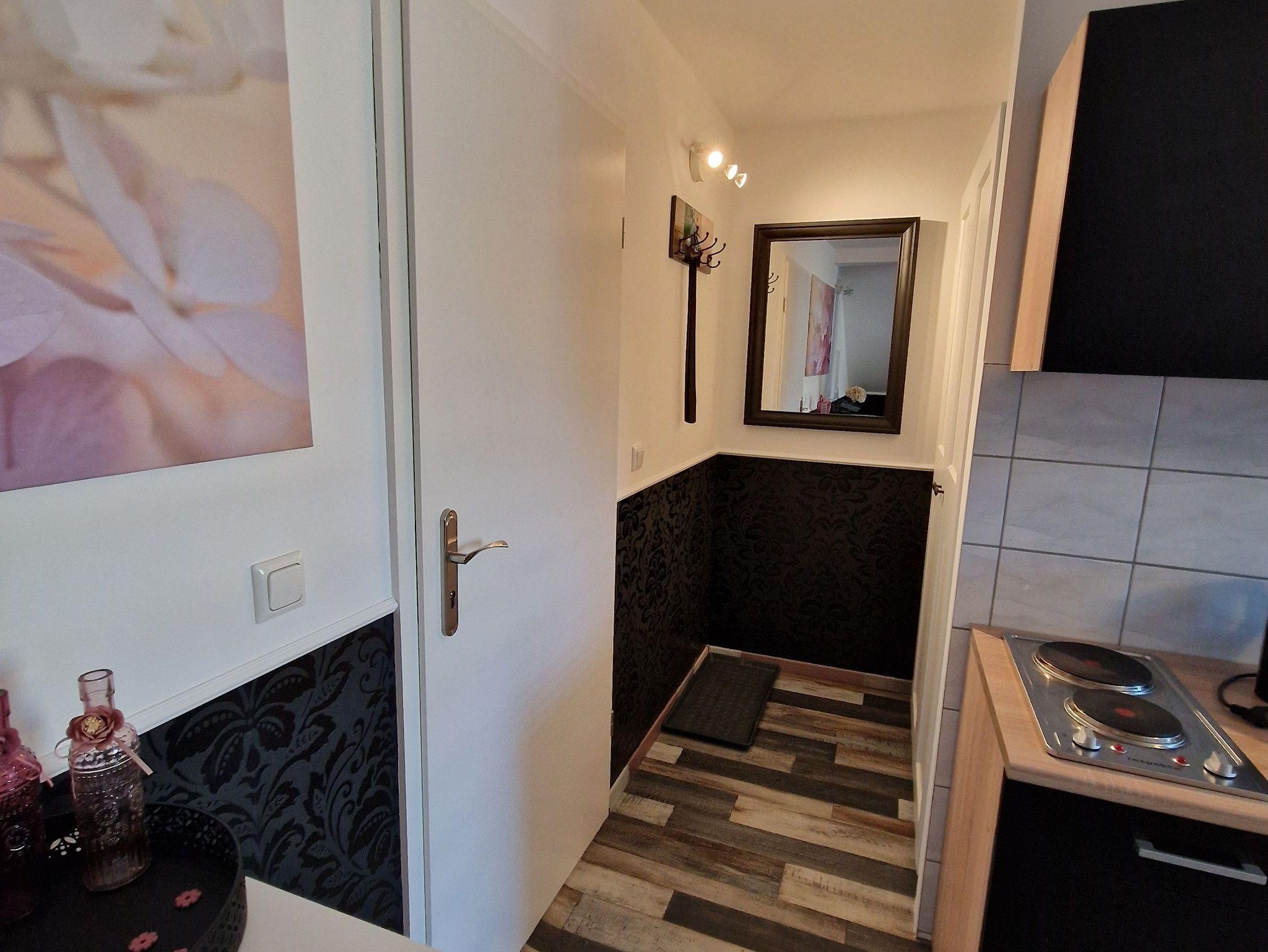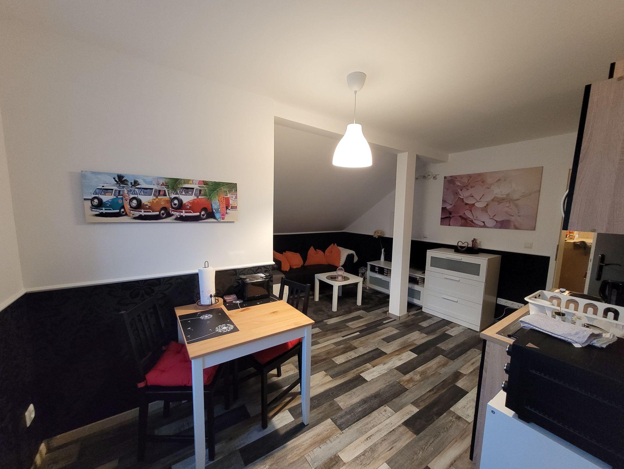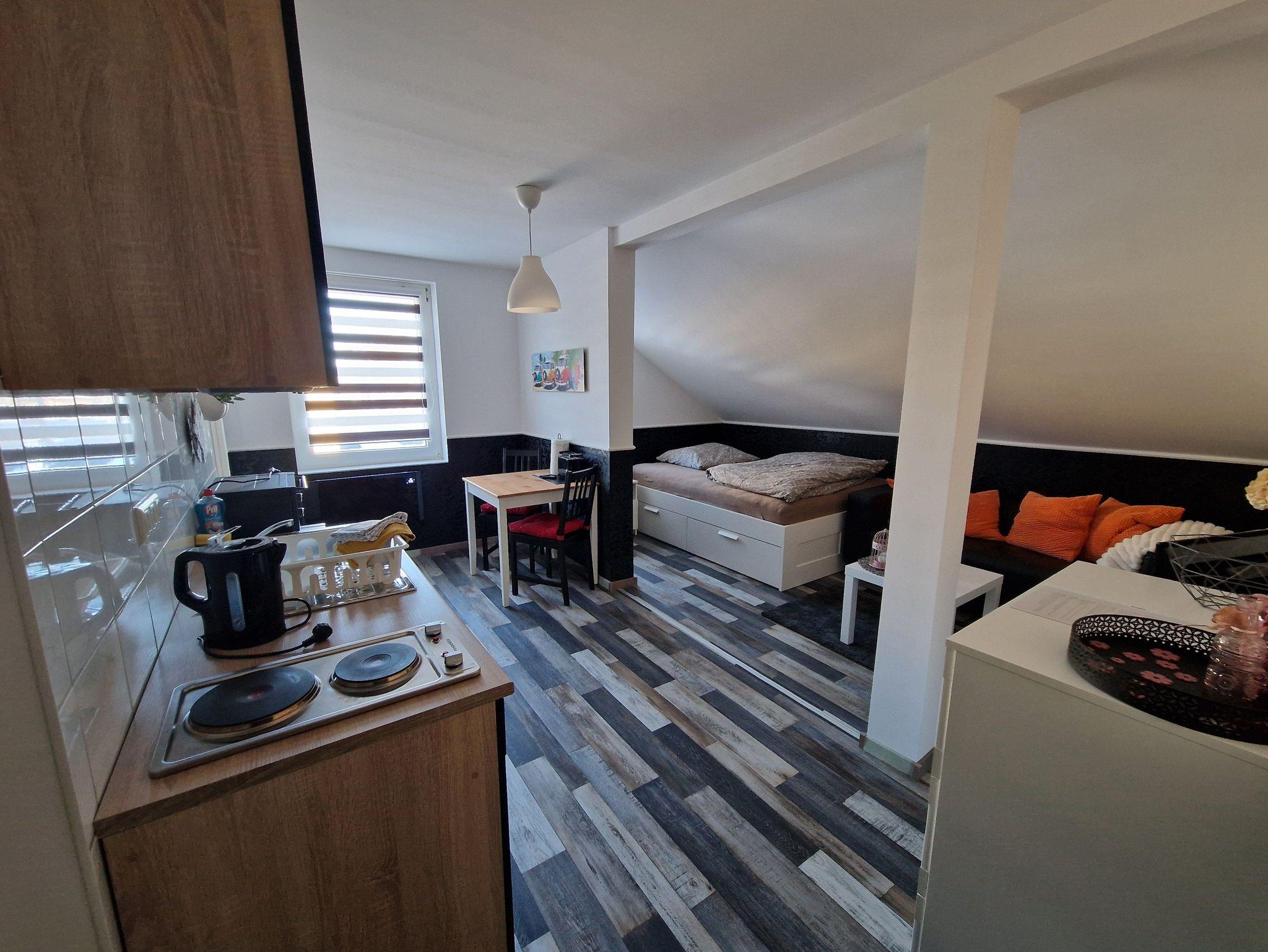 Die kleine Küche des Appartements lädt dazu ein, Köstlichkeiten aus Topf und Pfanne zuzubereiten. Geräte und moderne Annehmlichkeiten stehen Ihnen zur Verfügung, um Ihren Aufenthalt so angenehm wie möglich zu gestalten. Ein Essbereich in der Nähe der Küche bietet den perfekten Platz, um gemeinsame Mahlzeiten einzunehmen.