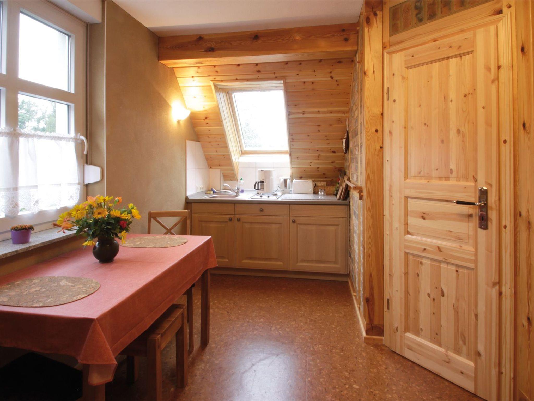 Neuwertige Ferienwohnung im Ferienhaus Backhaus mit einem separatem Schlafraum und zwei Aufbettungsmöglichkeiten, Wohnraum mit Küchenzeile und Bad mit DU/WC.