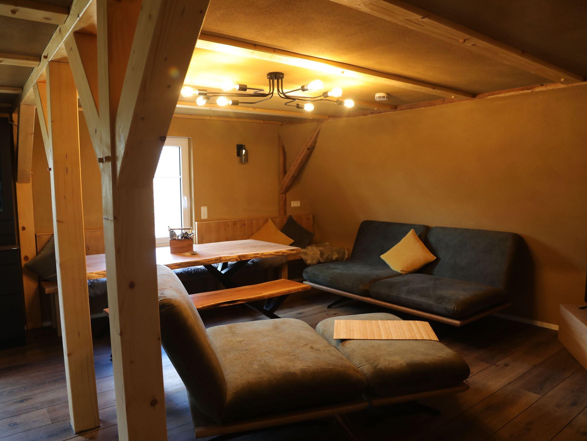 Der urige Wohnraum hält hier eine Couch mit Schlaffunktion ( 130 cm x 200 cm) bereit, auf der, auf Extrawunsch und gegen Aufpreis, zwei zusätzliche Gäste übernachten können.