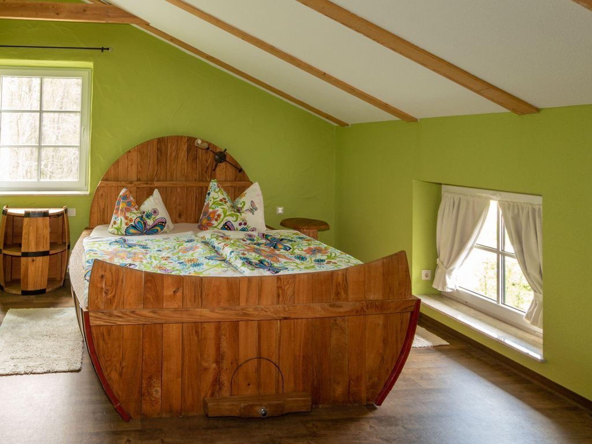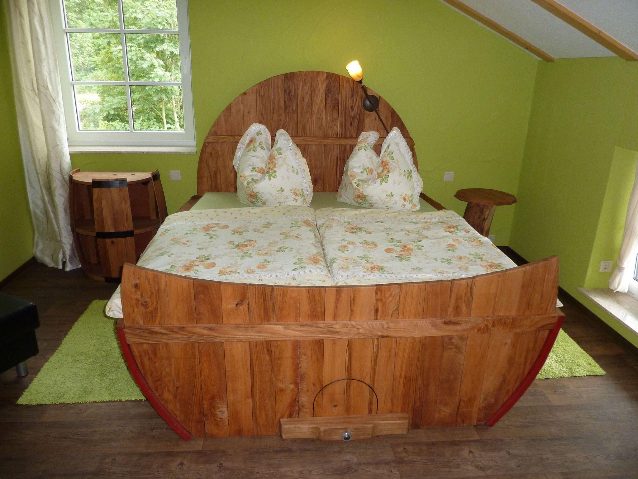 Die FeWo Fass 1 ist 55 m² groß und für 2 Personen geeignet. Der großzügig gestaltete Wohnbereich hat eine integrierte Küche, einen Schlafraum mit einem originell gestalteten Fass-Bett (2,00m x 1,80m) und ein modernes Bad. Es sind 2 Aufbettungen möglich. Frühstück in Absprache mit dem Vermieter zubuchbar.