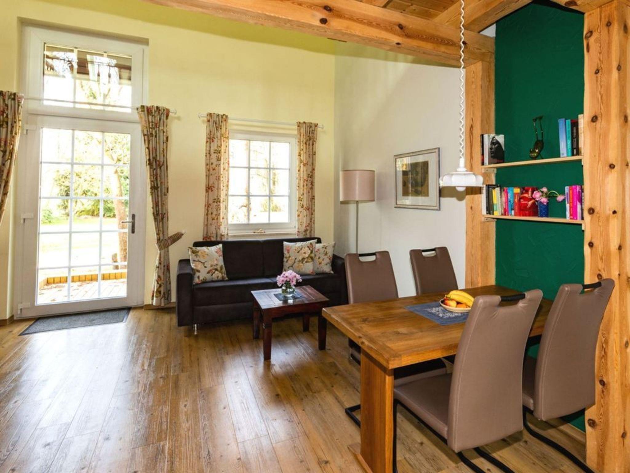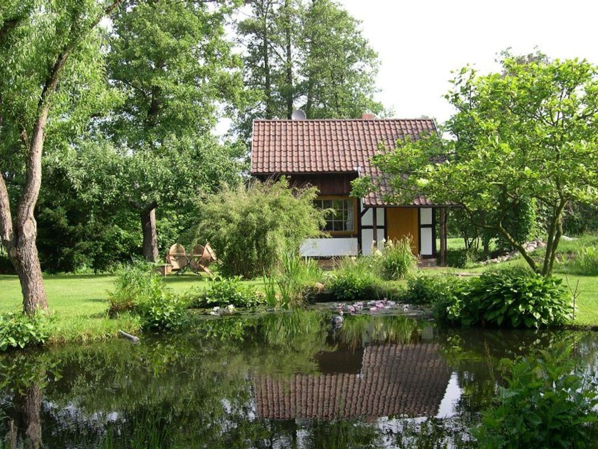 Die Ferienanlage Froschkönig liegt auf einem großen gepflegten Grundstück. In der Ferienwohnung 1 befindet sich im Erdgeschoss der Wohnraum mit gemütlicher Sitzecke, Essplatz und Küchenzeile sowie das Bad mit DU/WC. Das Erdgeschoss ist barrierefrei gestaltet. Der Schlafbereich mit Doppelbett ist auf der offenen Galerie untergebracht. Zur Ferienwohnung gehört eine Terrasse mit Gartenmöbeln umgeben von wunderschönen alten Bäumen.