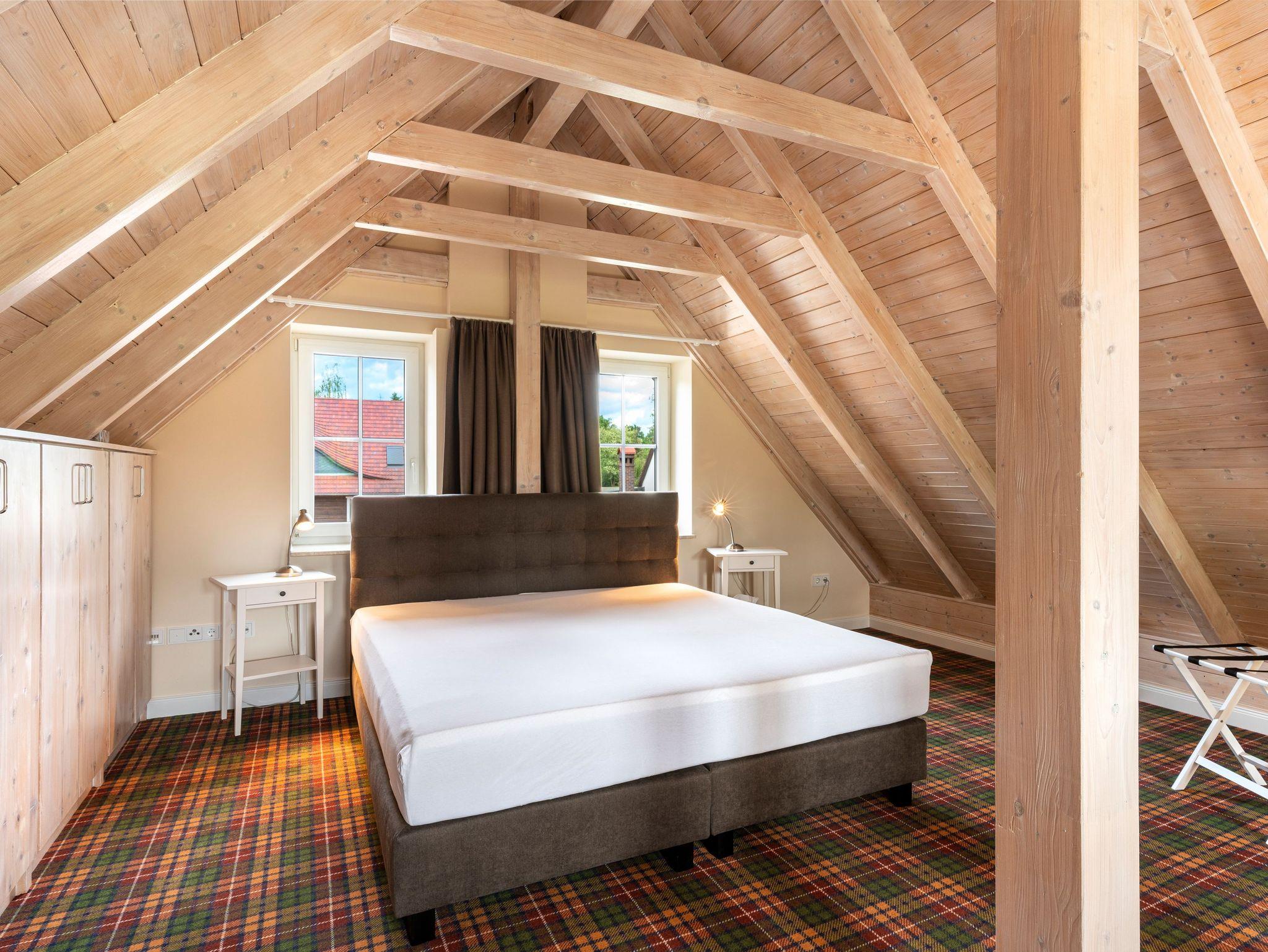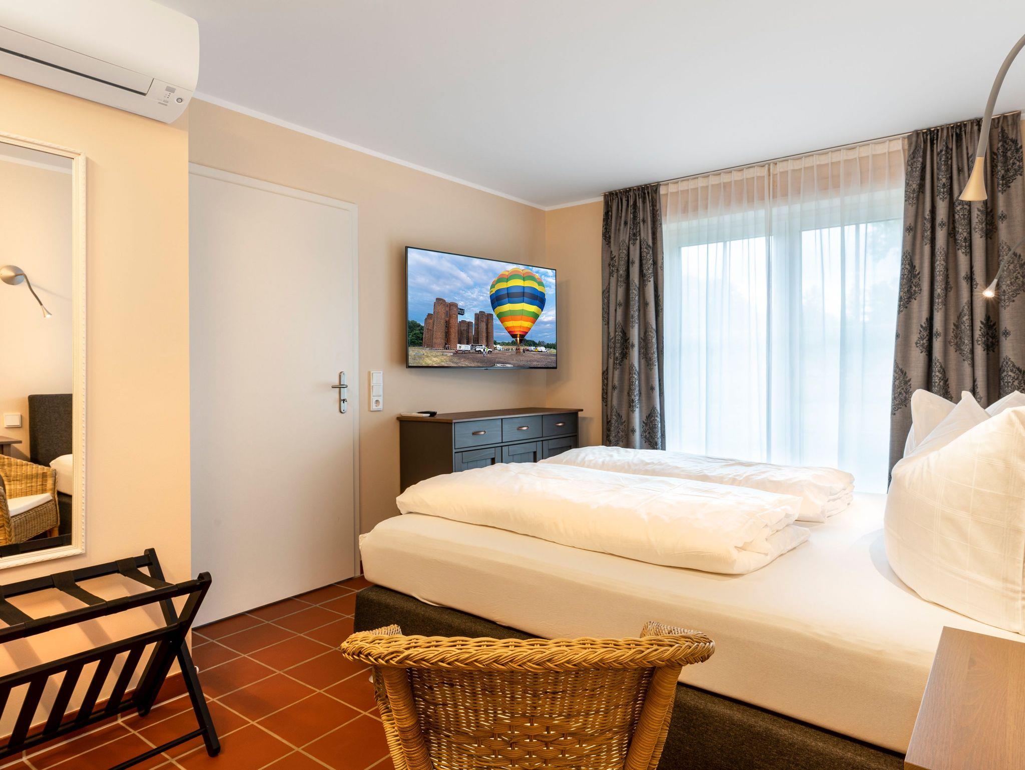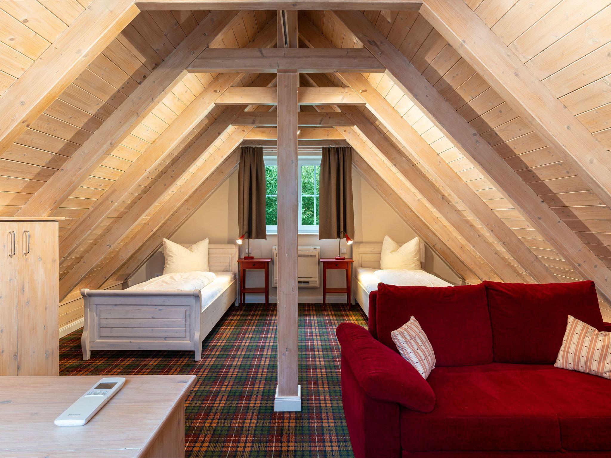 In den zwei Ferienzimmern in dem Nebengebäude auf dem Grundstück ist zusätzlich Platz für bis zu 4 weitere Personen. Es verfügt über ein eigenes, großes Bad mit Dusche und WC. Im EG befindet sich ein klassisches Doppelzimmer mit Boxspringbett, Sie haben von dort einen direkten Terrassenzugang. Im OG finden Sie 2 Einzelbetten.
