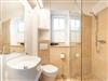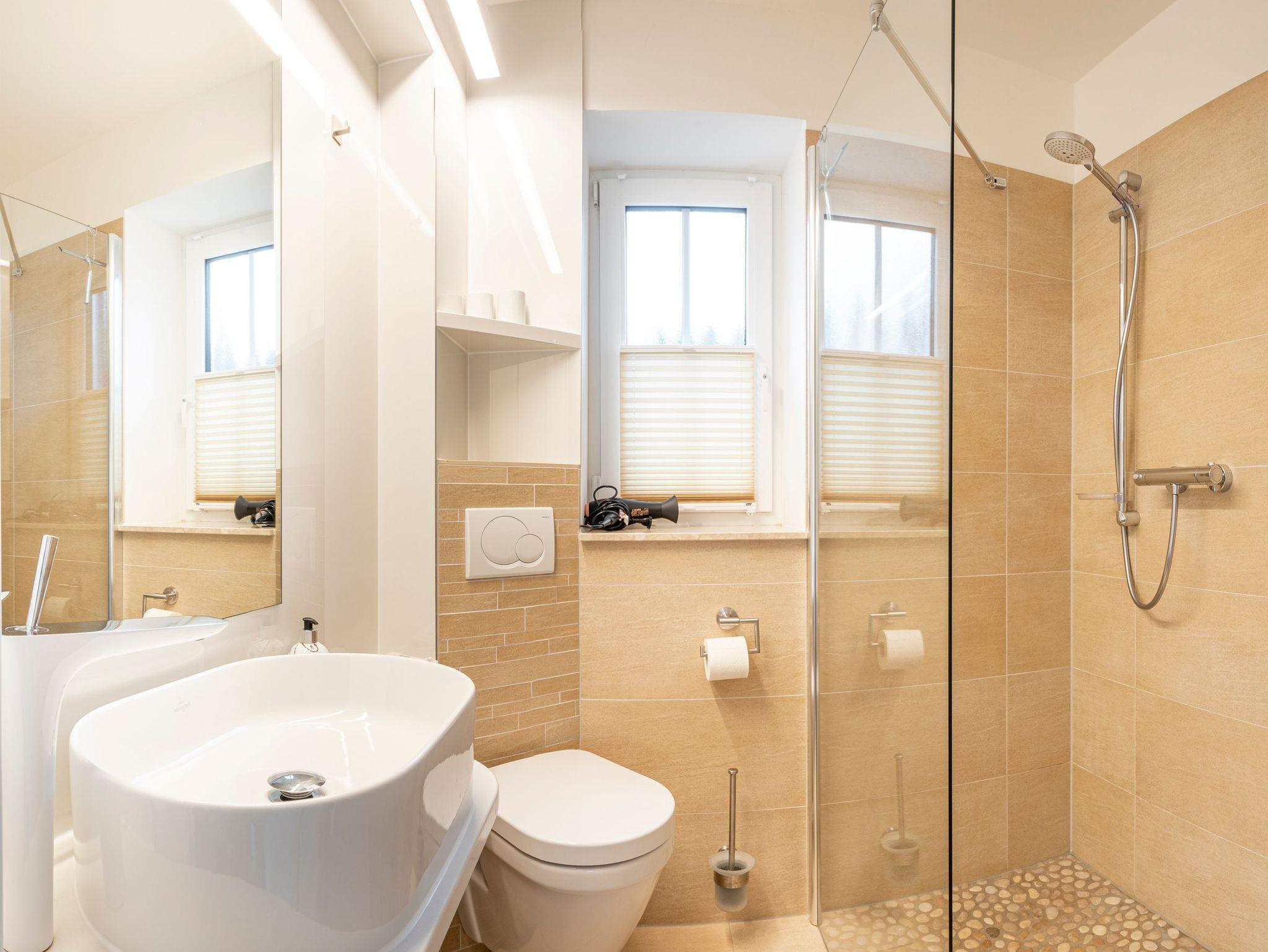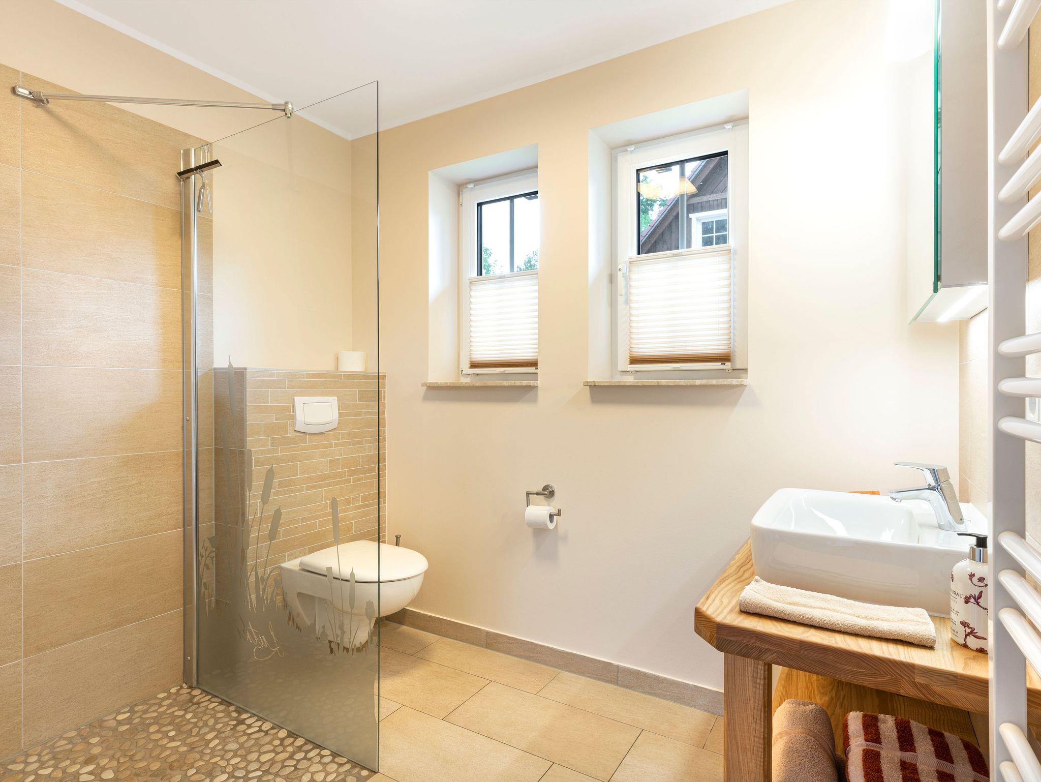 Das Nebengebäude für bis zu 4 weitere Personen verfügt über ein eigenes, großes Bad mit Dusche und WC. Im EG befindet sich ein klassisches Doppelzimmer mit Boxspringbett, sie haben von dort einen direkten Terrassenzugang. Im OG finden sie 2 Einzelbetten.