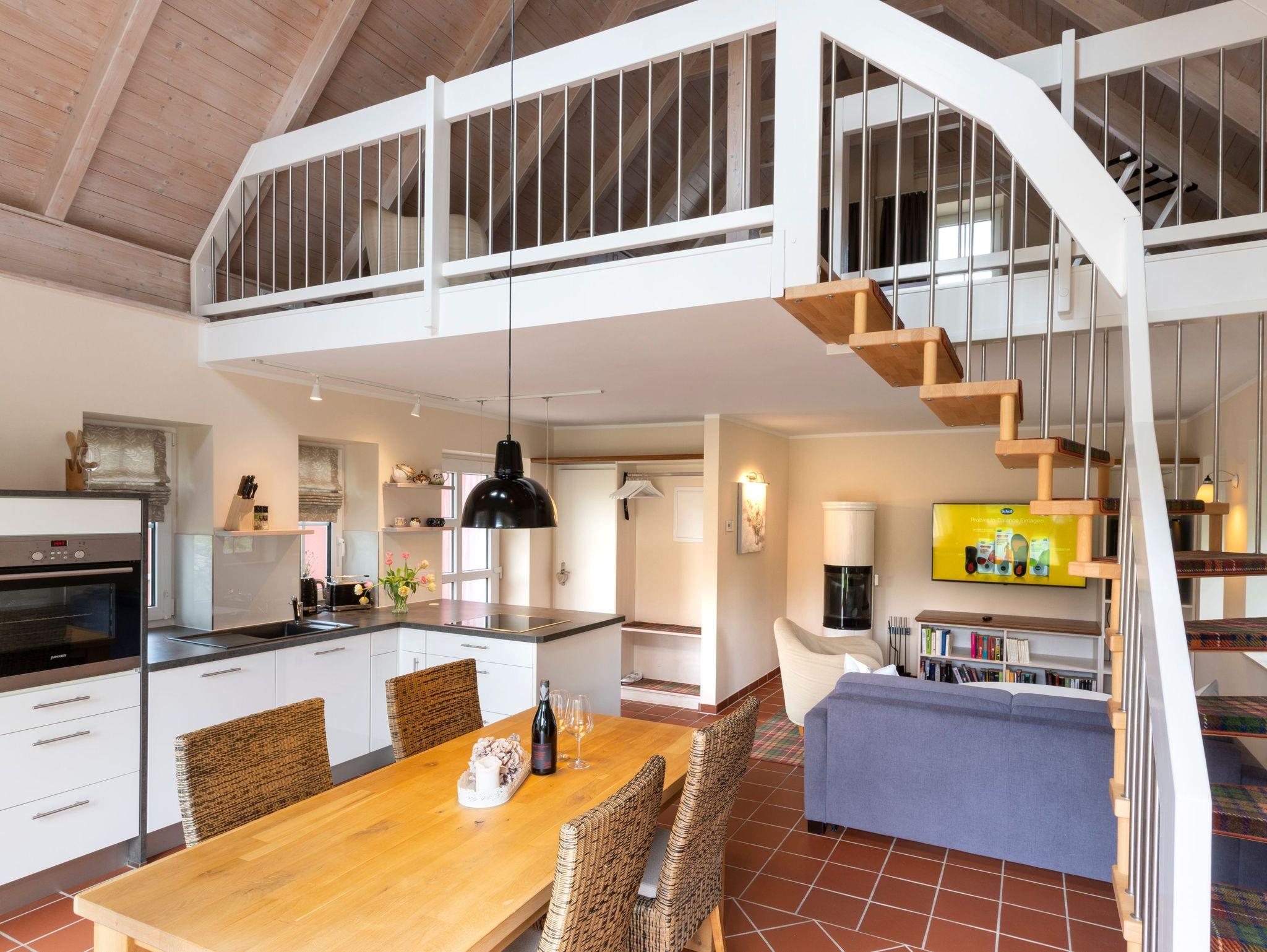 Im Ferienhaus finden Sie neben einem gemütlichem Wohnraum mit Kaminofen moderne sanitäre Einrichtungen und eine professionelle Einbauküche vor. Sie schlafen im Ferienhaus auf der Galerie in einem wunderbaren Boxspringbett und verbringen Ihre Nächte in absoluter Ruhe.