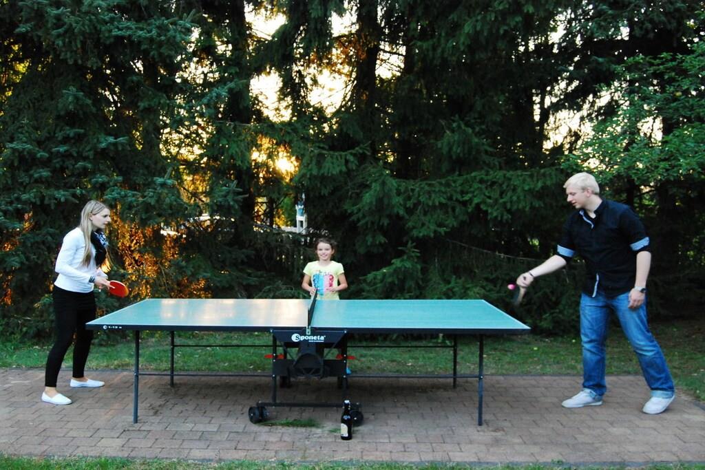 Stueetage: (Stue(enkeltsovesofa, Fjernsyn, radio, varme), Køkken(kakkelovn, kogeplade, elkedel, brødrister, kaffemaskine, ovn, opvaskemaskine , køleskab, fryser, varme), soveværelse(tremmeseng), soveværelse(tremmeseng), soveværelse(tremmeseng), badeværelse(bruser, sauna, håndvask, toilet, varme, føntørrer, Håndklæder inkl.)) pejs, terrasse, have, havemøbler, Parasol, bordtennisbord