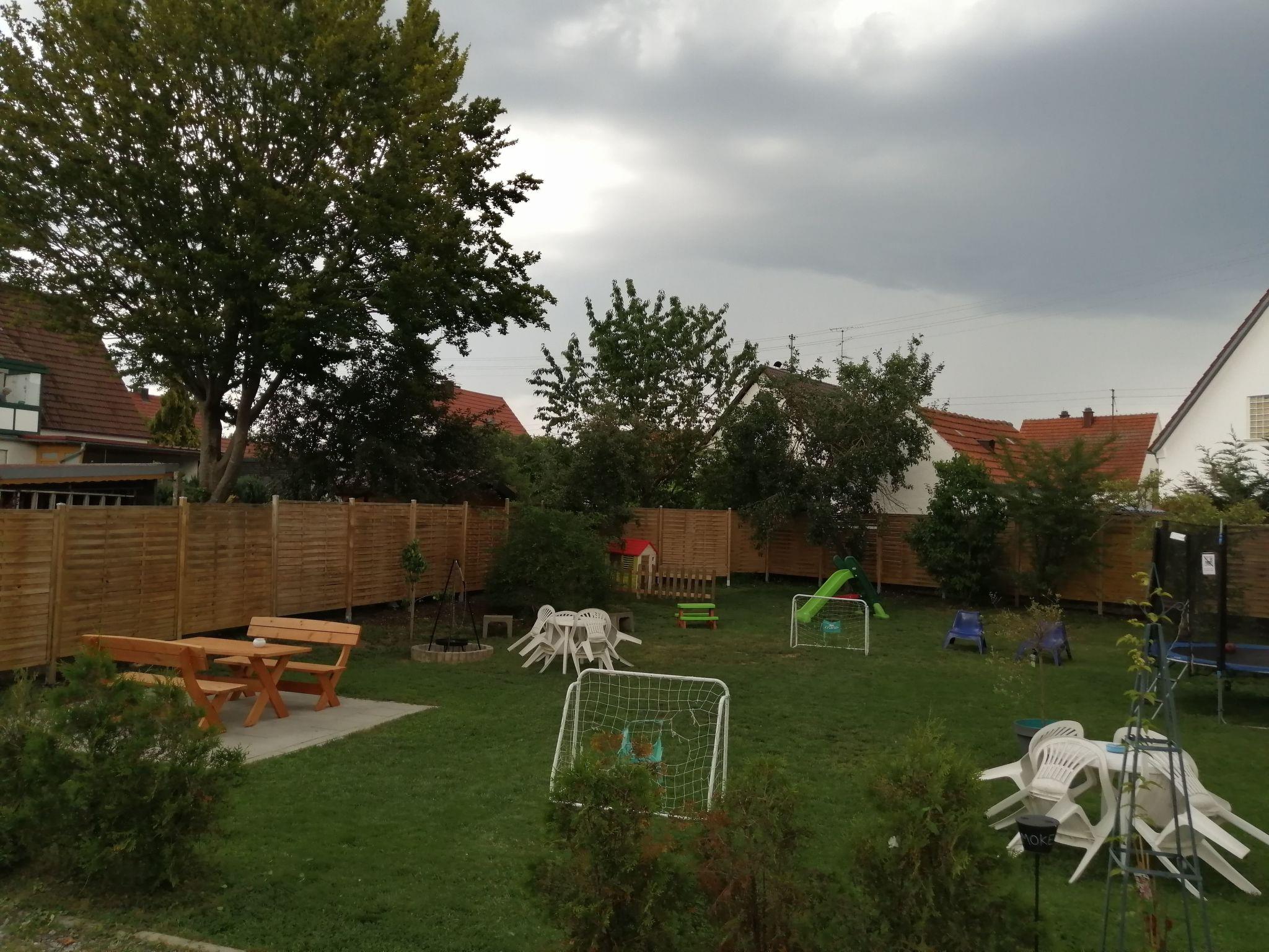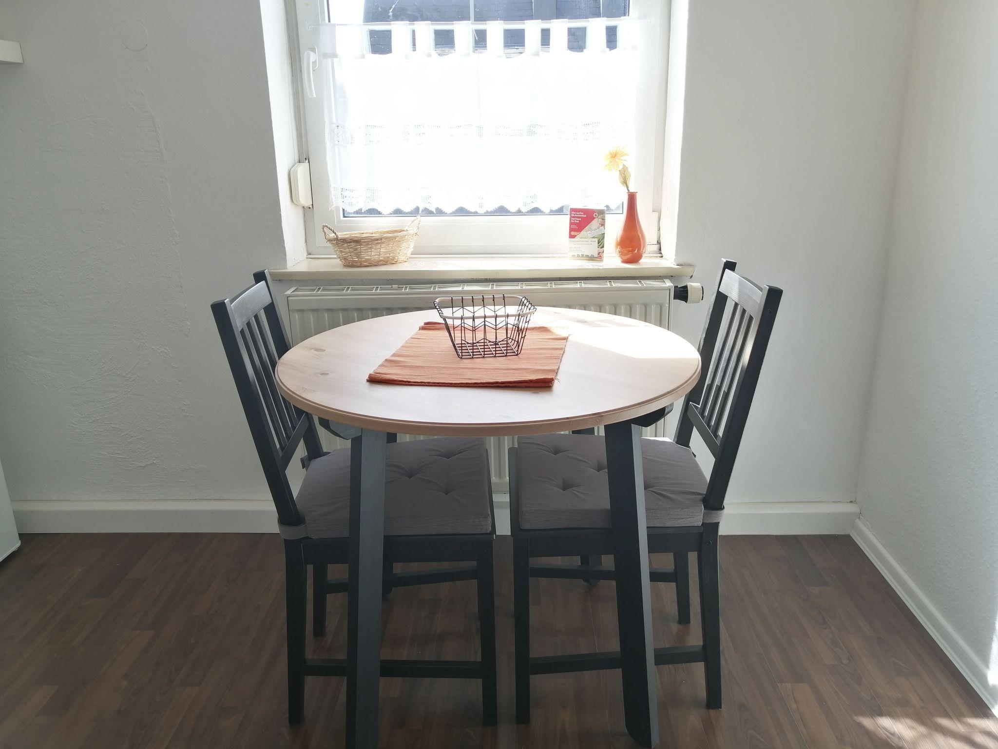 Our flat 5 (top floor flat) has 1 bedroom and a small living room with a sofa bed, each with a flat screen TV, a living/dining kitchen and a bathroom with shower. The new kitchen is fully equipped. Bed linen and towels are included in the price. The large garden behind the house with trampoline and football goals is part of our offer. The supervised car park (video-monitored) is located on our private property. Free Wi-Fi can be used throughout the house. We can provide you with a baby cot and a high chair (please let us know if required). Shopping facilities such as a bakery (approx. 300m, also open on Sundays) as well as Aldi, Rewe and a drugstore can be reached in a few minutes on foot and are only approx. 400m away. In the town centre, which you can also easily reach on foot, you will find pizzerias, restaurants, cafés and bars.