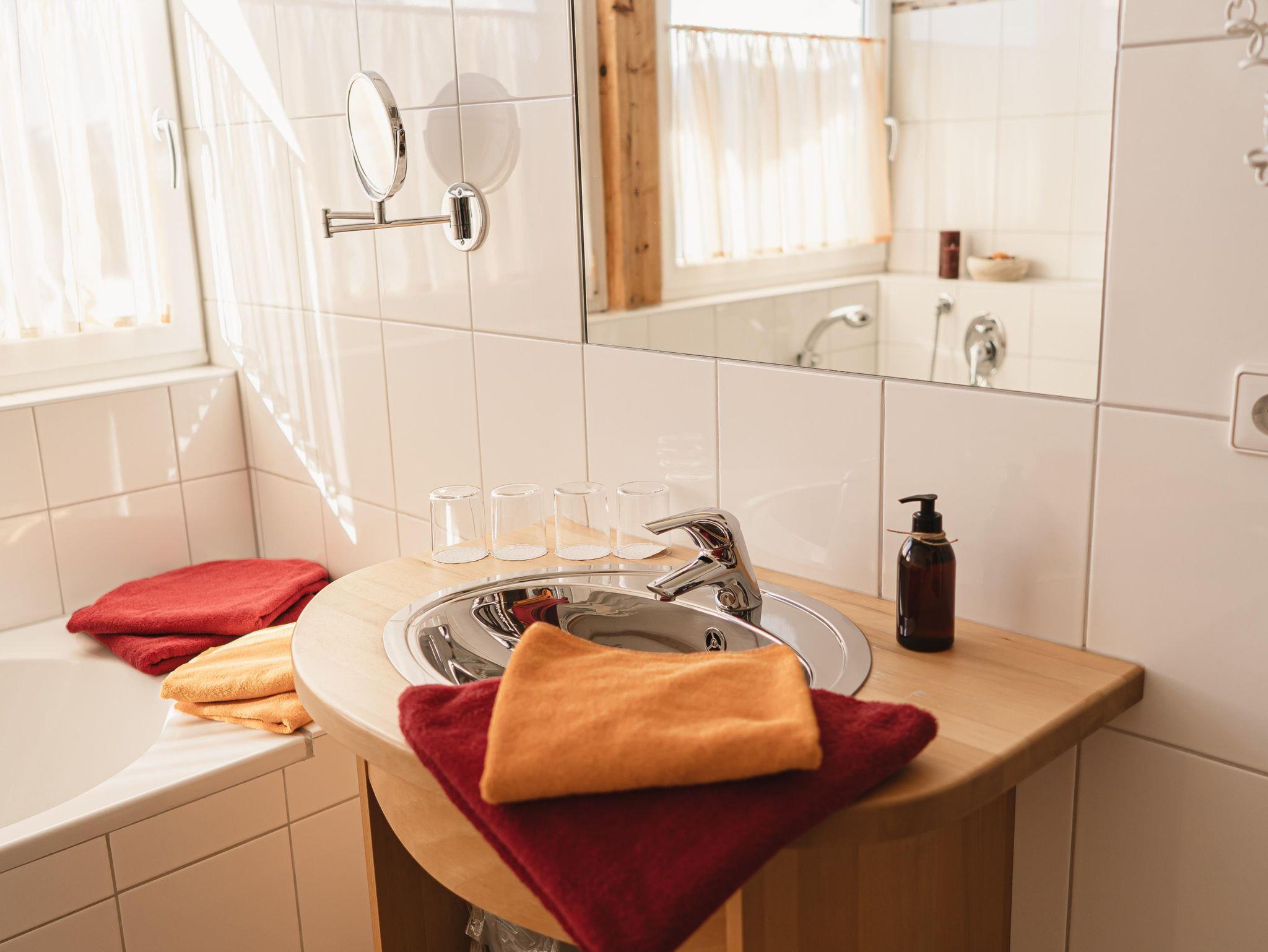Im hellen Badezimmer finden Sie einen Fön, Schminkspiegel, ausreichend Handtücher und weitere Kleinigkeiten.
