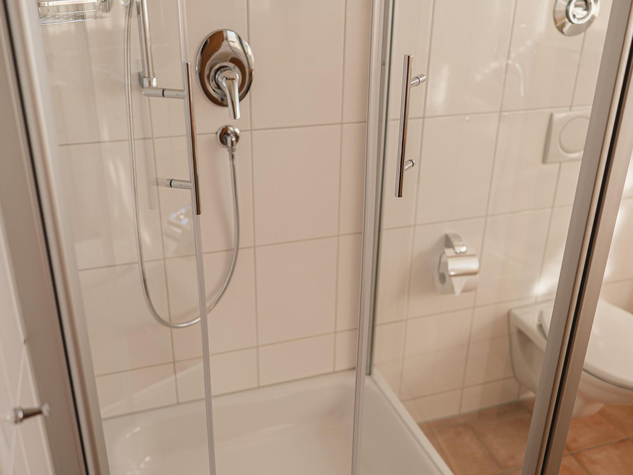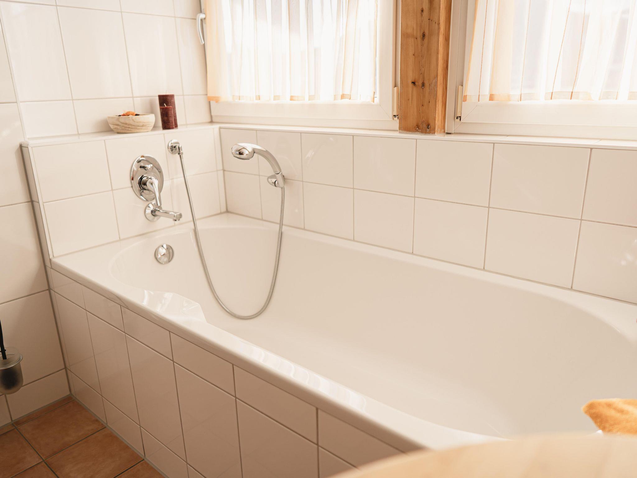 Ein helles Tageslichtzimmerbadezimmer mit Badewanne, Dusche und WC. Der eigene Zugang zum Vital-Park Gelände erfolgt über einen privaten Eingang.