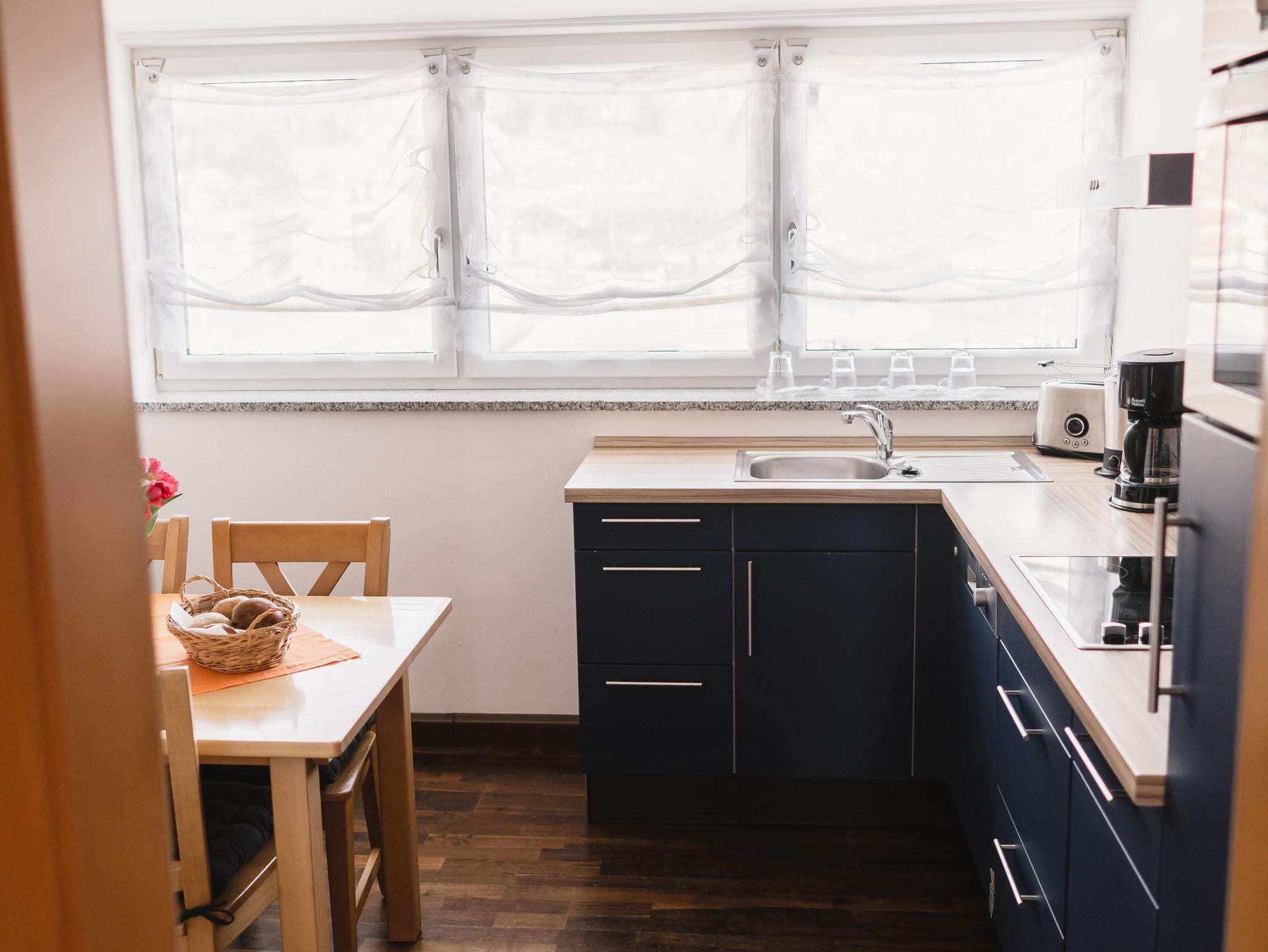 Die große Wohnküche mit Esstisch ist mit allem ausgestattet was man braucht: u.a. Cerankochfeld, Kühlschrank, Backofen, Spülmaschine, Wasserkocher, Kaffeemaschine, Geschirr und Reinigungszubehör.