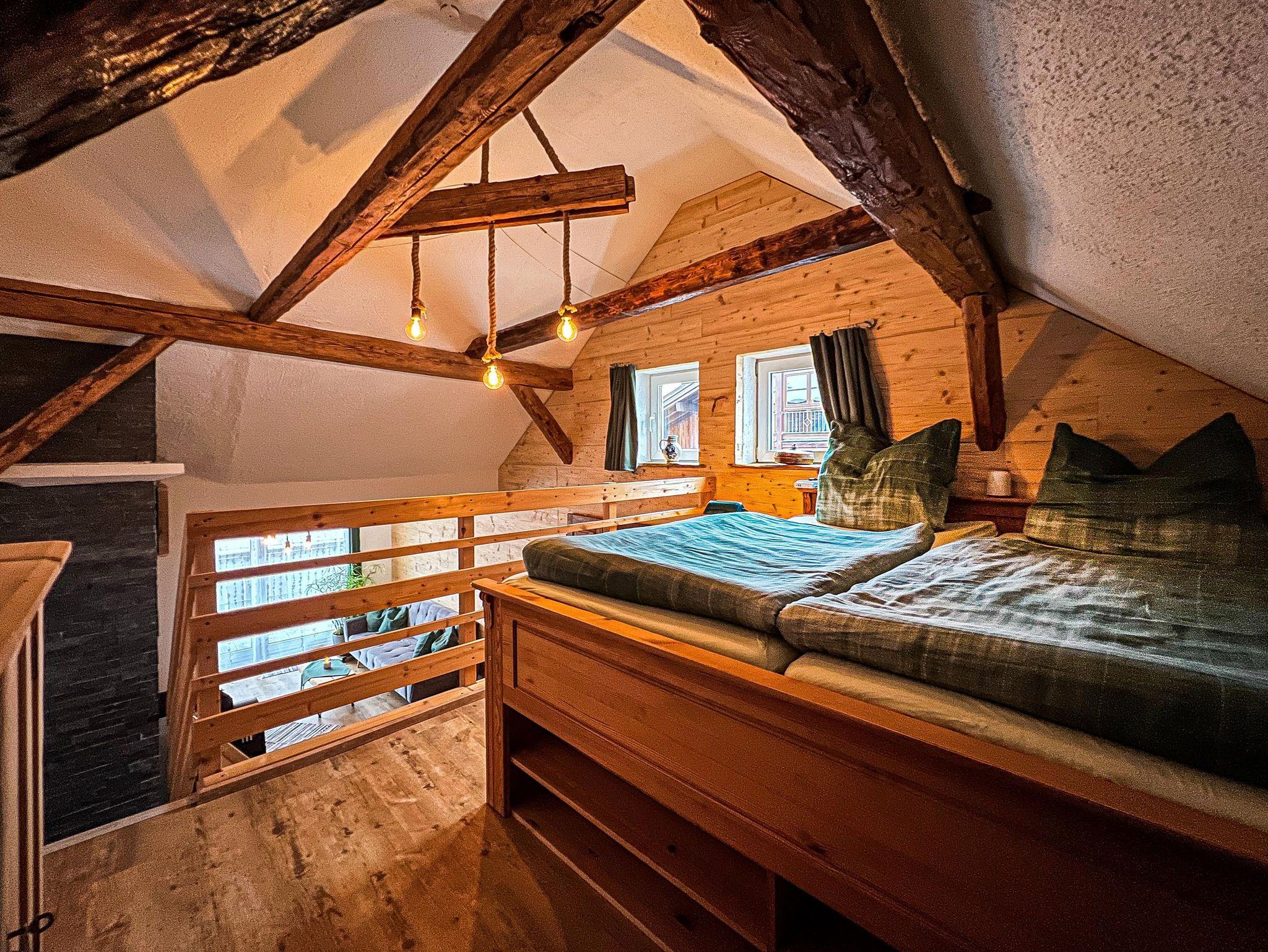 Im offenen historischen Dachstuhl aus handbehauenen Balken befindet sich auf der Galerie ein geräumiges Doppelbett mit zwei Schlafplätzen direkt unter der Dachschräge.