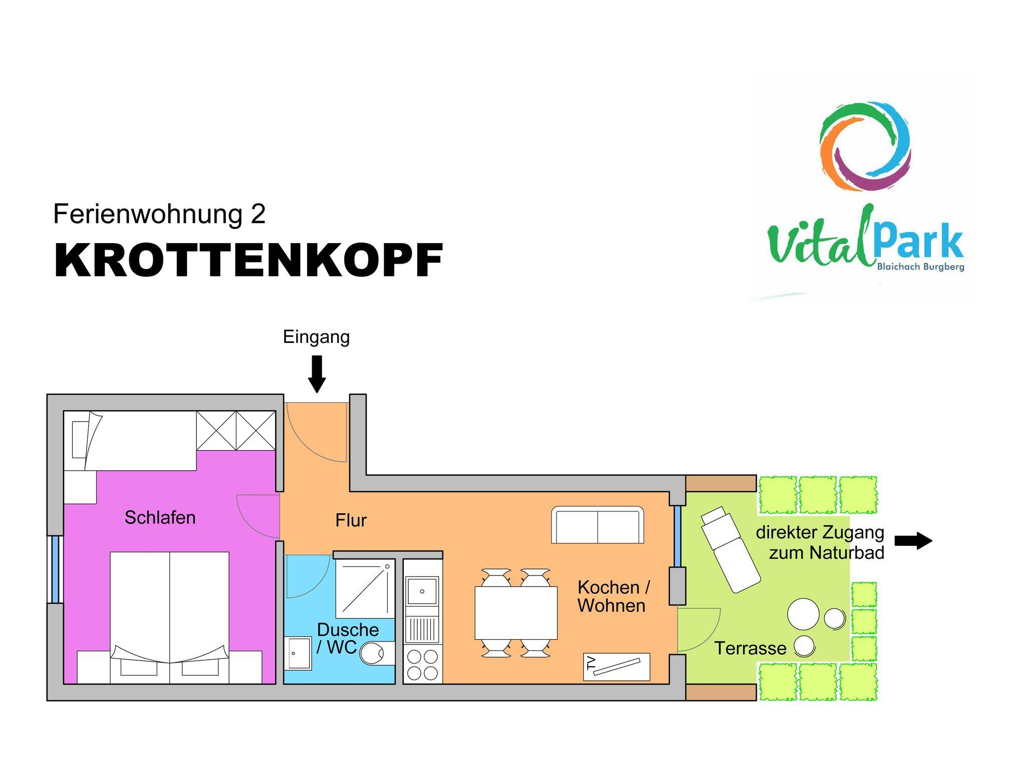Die Wohnung hat ein abgetrenntes Schlafzimmer, einen stilvoll eingerichteten Wohn- & Essbereich mit Küchenzeile sowie ein helles Badezimmer mit Dusche und WC. Im Wohnraum finden Sie eine einladende Couch sowie Sat-TV. Zusätzlich eine eigene Terrasse mit Zugang zum Vital-Park.