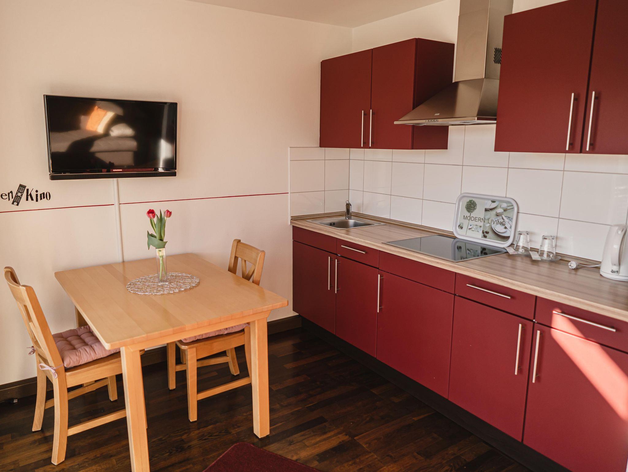Die Küche ist mit allem ausgestattet was man braucht: u.a. Cerankochfeld, Kühlschrank, Wasserkocher, Kaffeemaschine, Besteck und Reinigungszubehör.