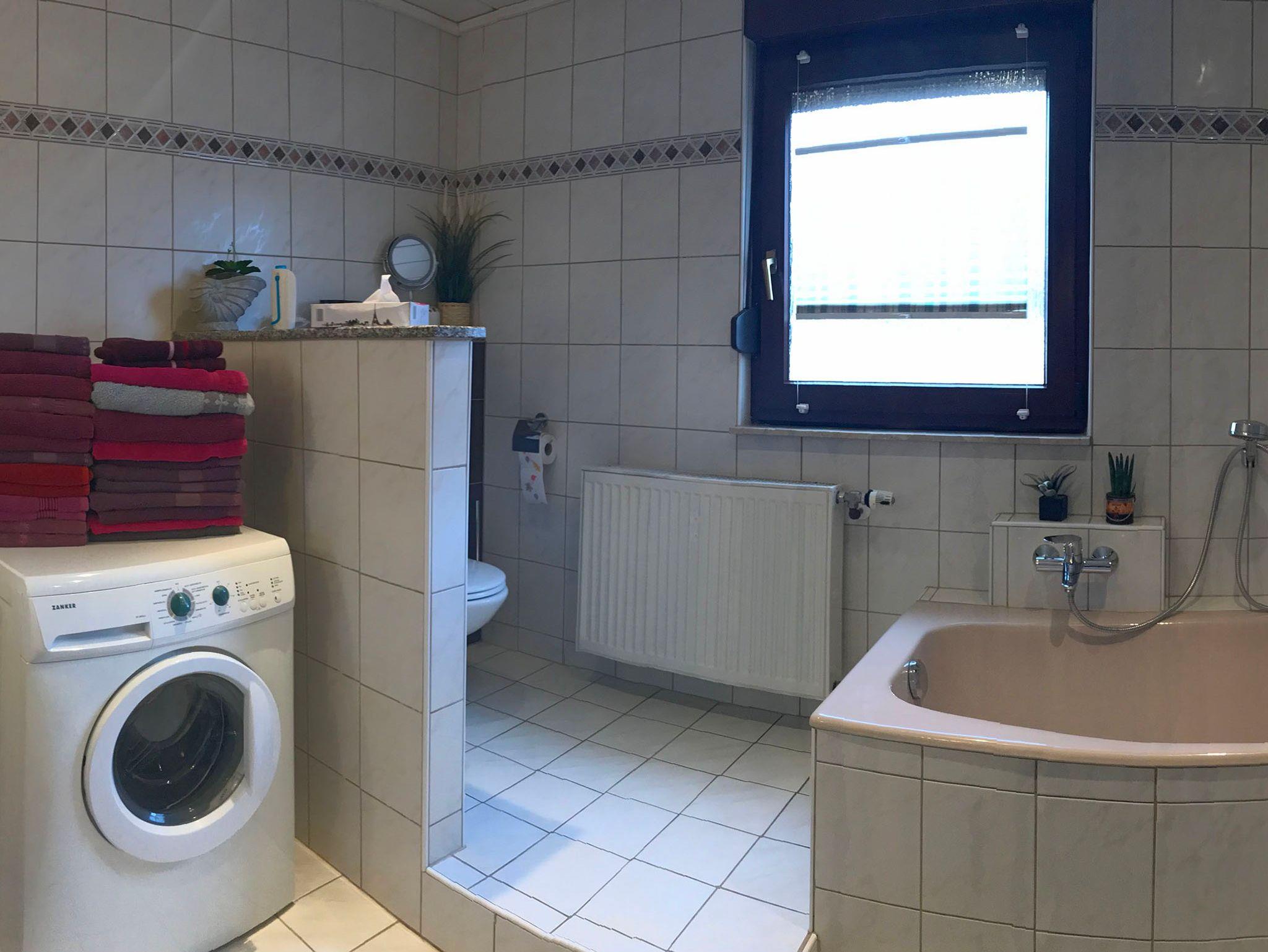Die 85 qm große Ferienwohnung befindet sich im ersten Obergeschoss und verfügt über ein großes Schlafzimmer, zwei kleinere Schlafzimmer mit je einem Einzelbett, ein geräumiges Wohnzimmer, eine vollausgestattete Küche mit einer Frühstückstheke und einem großen Essplatz, sowie ein Badezimmer mit Badewanne, Dusche, WC und Waschmaschine.