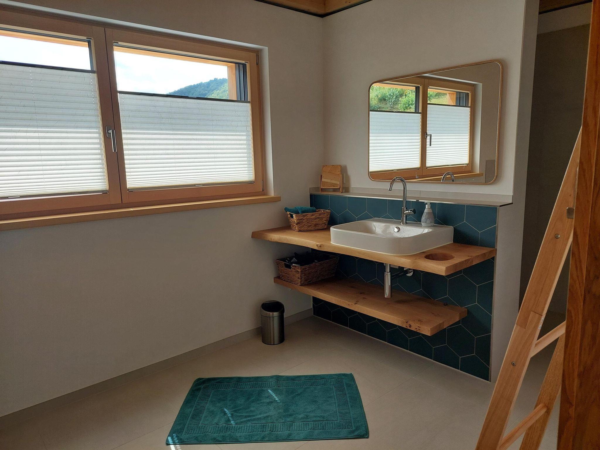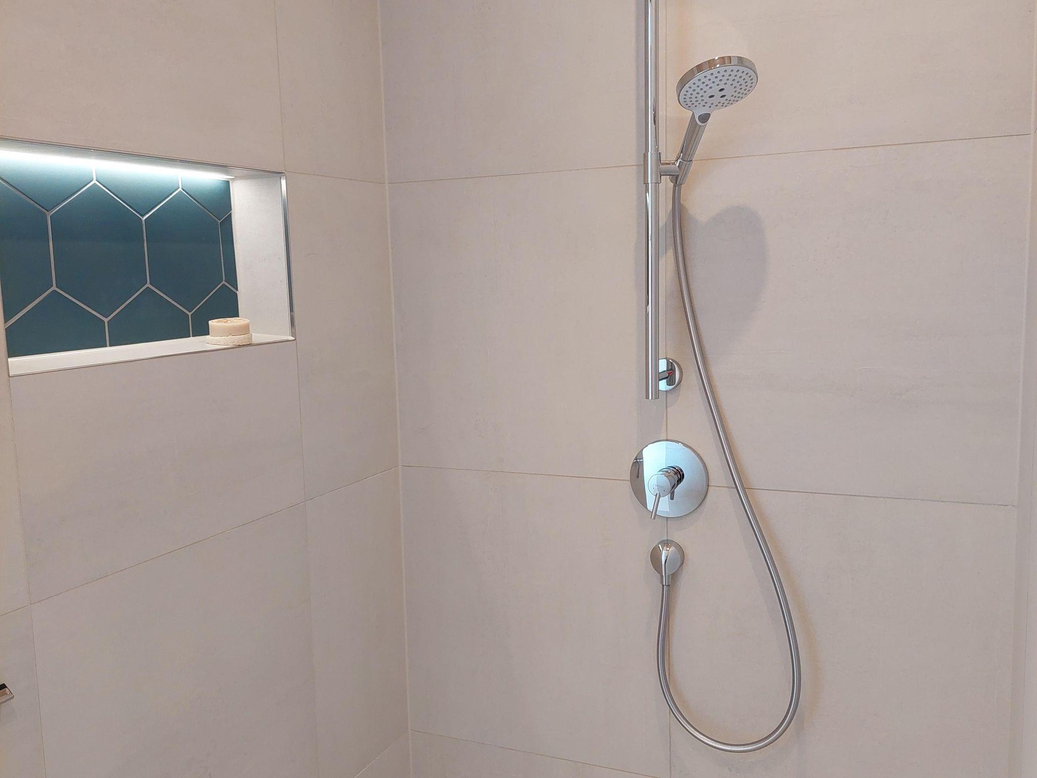 • großes Badezimmer mit bodentiefer Dusche, zusätzlichem Kosmetikspiegel, Handtüchern und Haartrockner