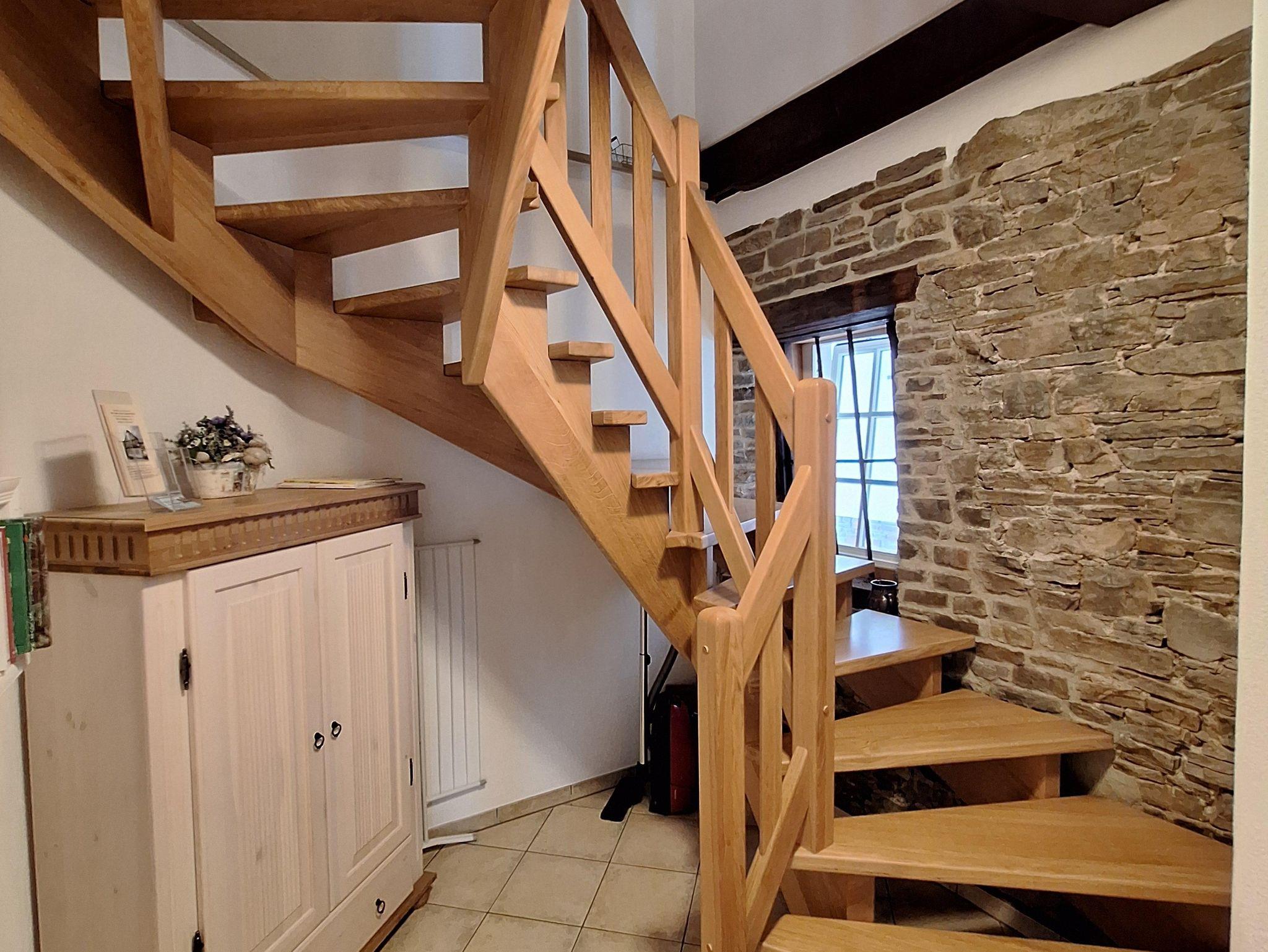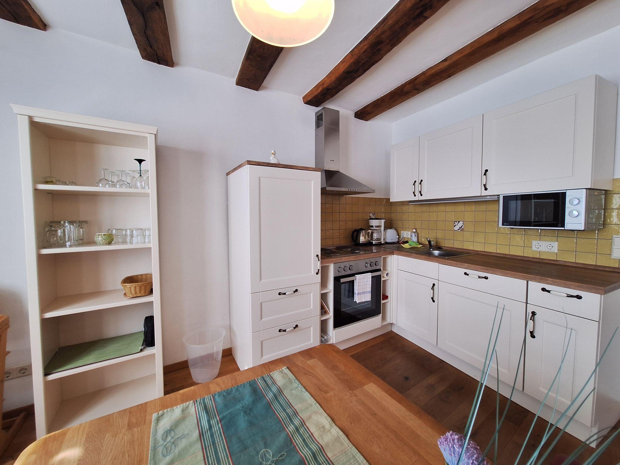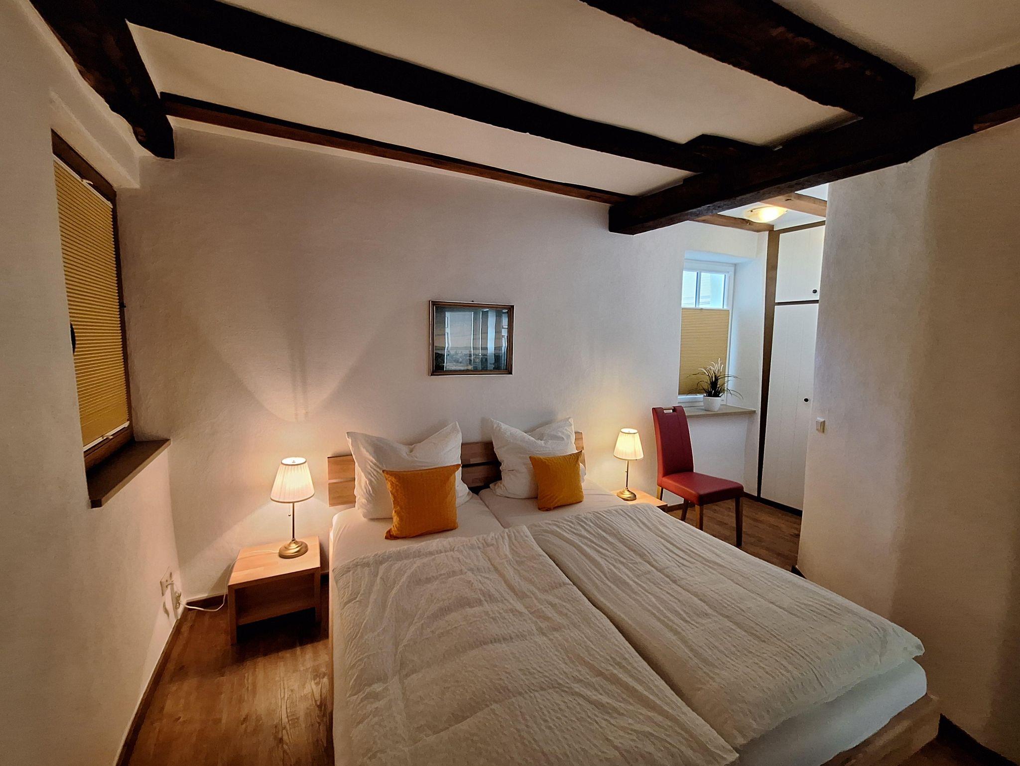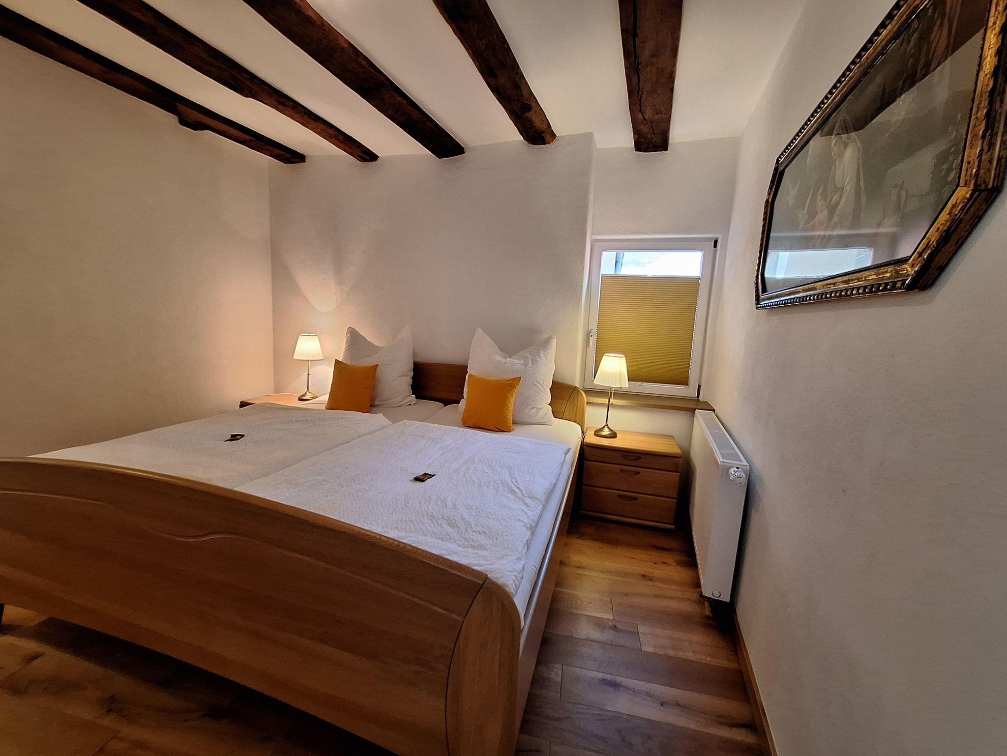 Die Ferienwohnung “Moseltal” befindet sich im Obergeschoss des Hauses für max. 4 Personen. Zum Obergeschoss führt eine Treppe mit ca. 15 Treppenstufen. Das Herzstück ist die gemütliche Wohn- und Essküche, mit der zum Teil sichtbaren Fachwerkkonstruktion. Die vollausgestattete, offene Küche bietet alles für ein gemeinsames Frühstück, Mittag- und Abendessen mit der ganzen Familie: Ceranfeldherd, Backofen, Spülmaschine, Toaster, Wasserkocher und einem Kühlschrank mit Gefrierfach sind vorhanden. Es sind zwei Schlafzimmer vorhanden, jeweils mit einem Doppelbett. Bezogene Betten und Handtücher sind für uns eine Selbstverständlichkeit. Das Badezimmer ist mit einer ebenerdigen Dusche, einem WC sowie einem Handtuchwärmer und Fön ausgestattet.