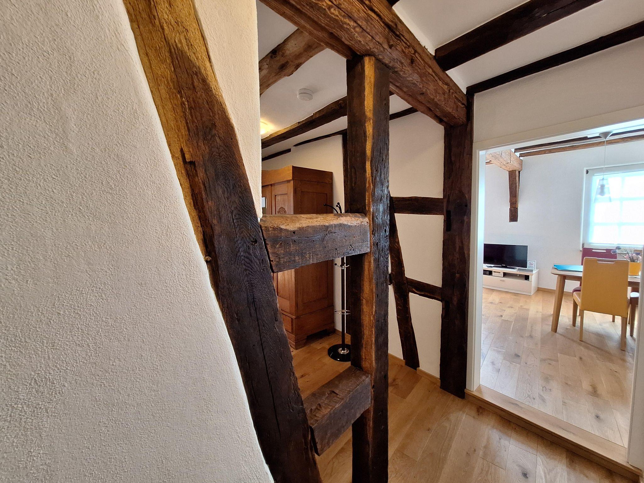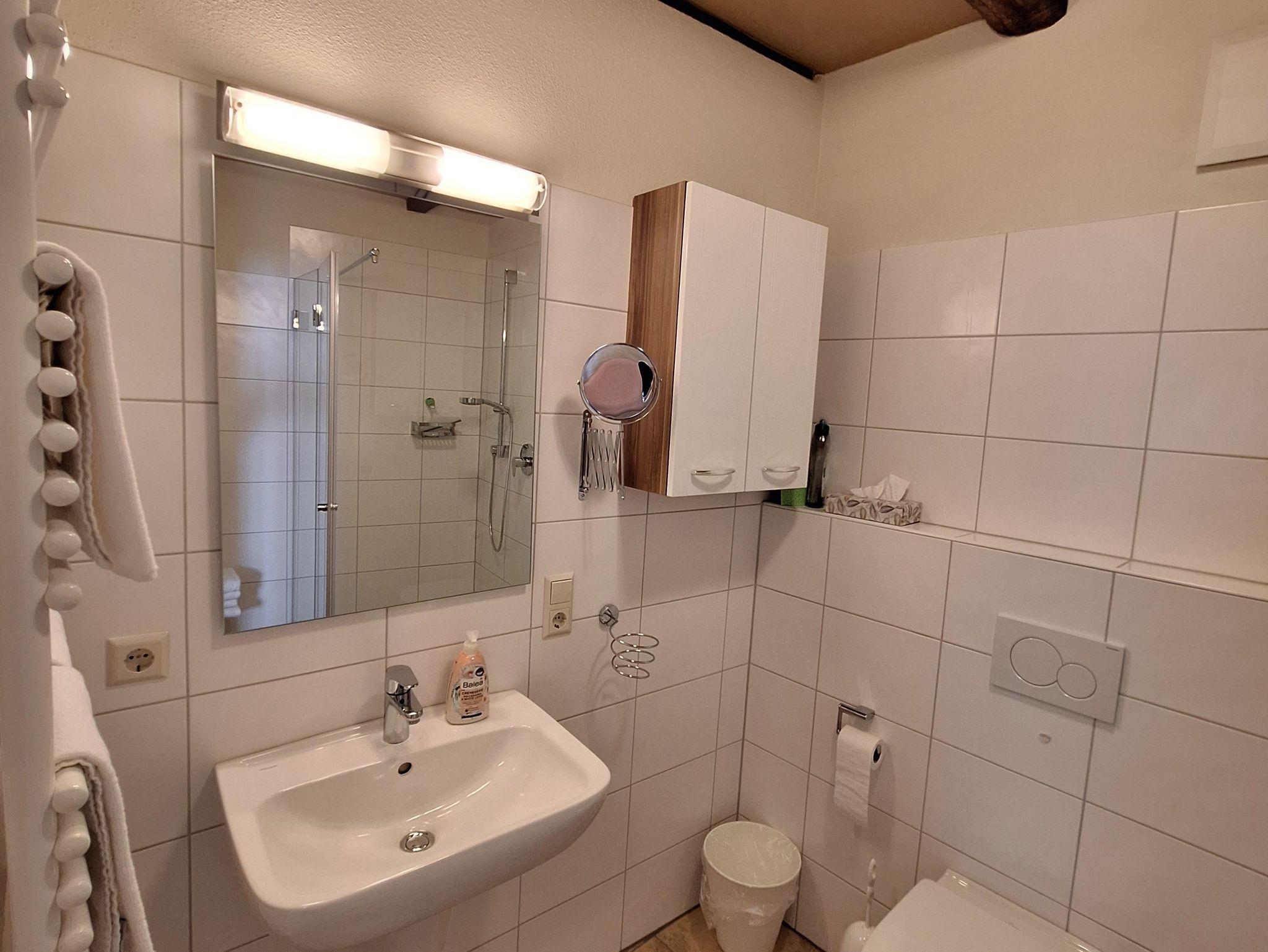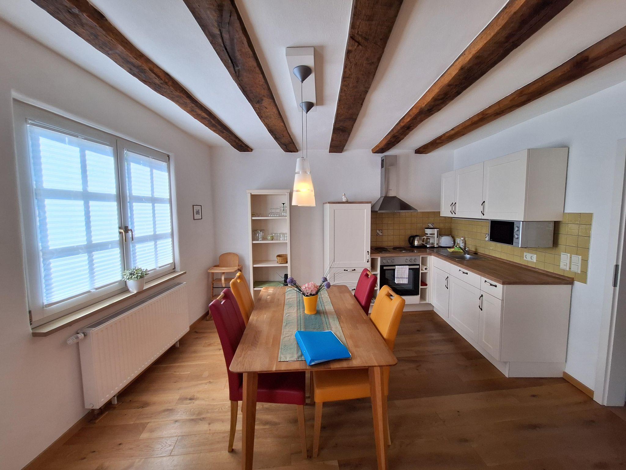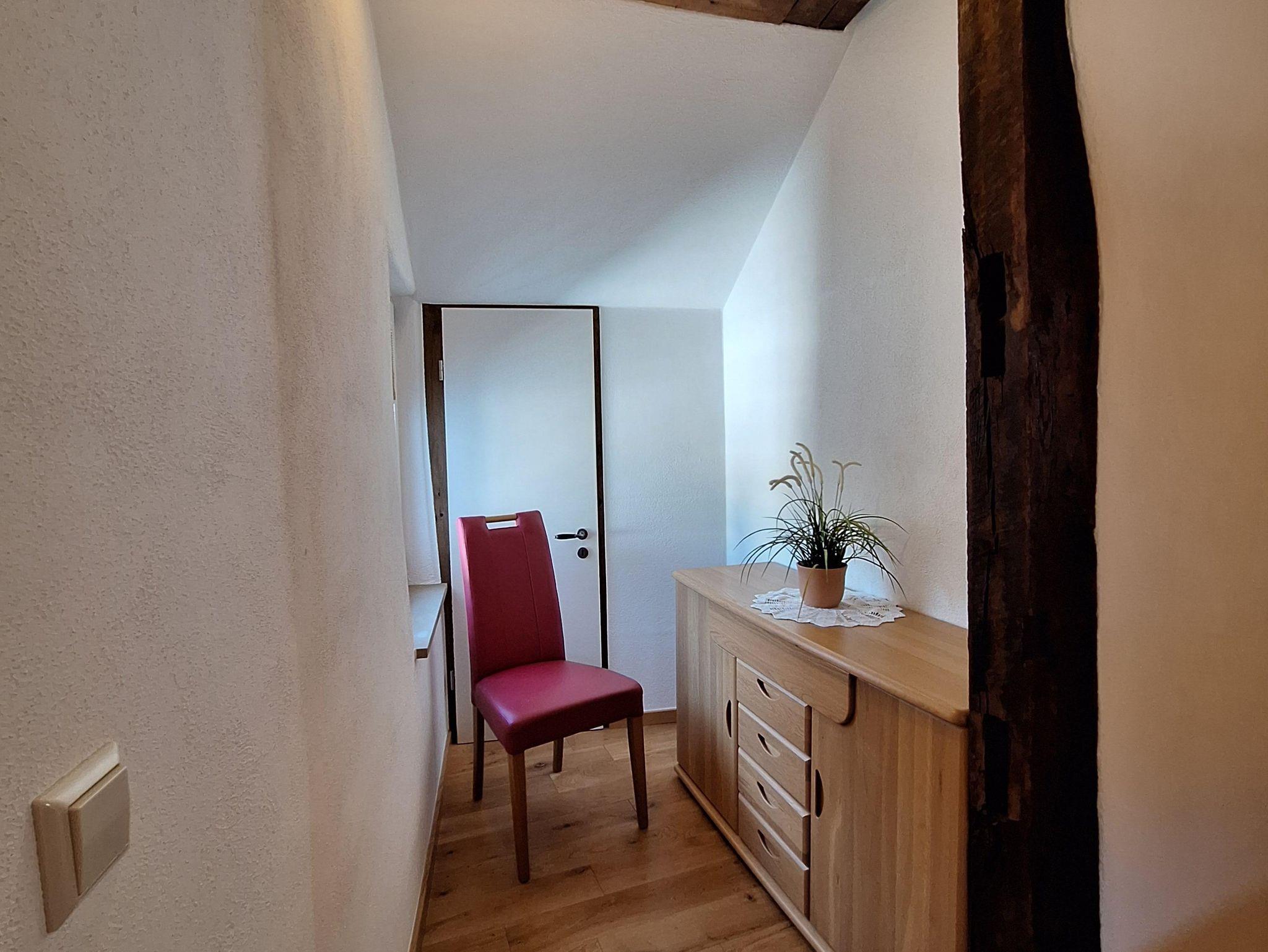 Die Ferienwohnung “Moseltal” befindet sich im Obergeschoss des Hauses für max. 4 Personen. Zum Obergeschoss führt eine Treppe mit ca. 15 Treppenstufen. Das Herzstück ist die gemütliche Wohn- und Essküche, mit der zum Teil sichtbaren Fachwerkkonstruktion. Die vollausgestattete, offene Küche bietet alles für ein gemeinsames Frühstück, Mittag- und Abendessen mit der ganzen Familie: Ceranfeldherd, Backofen, Spülmaschine, Toaster, Wasserkocher und einem Kühlschrank mit Gefrierfach sind vorhanden. Es sind zwei Schlafzimmer vorhanden, jeweils mit einem Doppelbett. Bezogene Betten und Handtücher sind für uns eine Selbstverständlichkeit. Das Badezimmer ist mit einer ebenerdigen Dusche, einem WC sowie einem Handtuchwärmer und Fön ausgestattet.