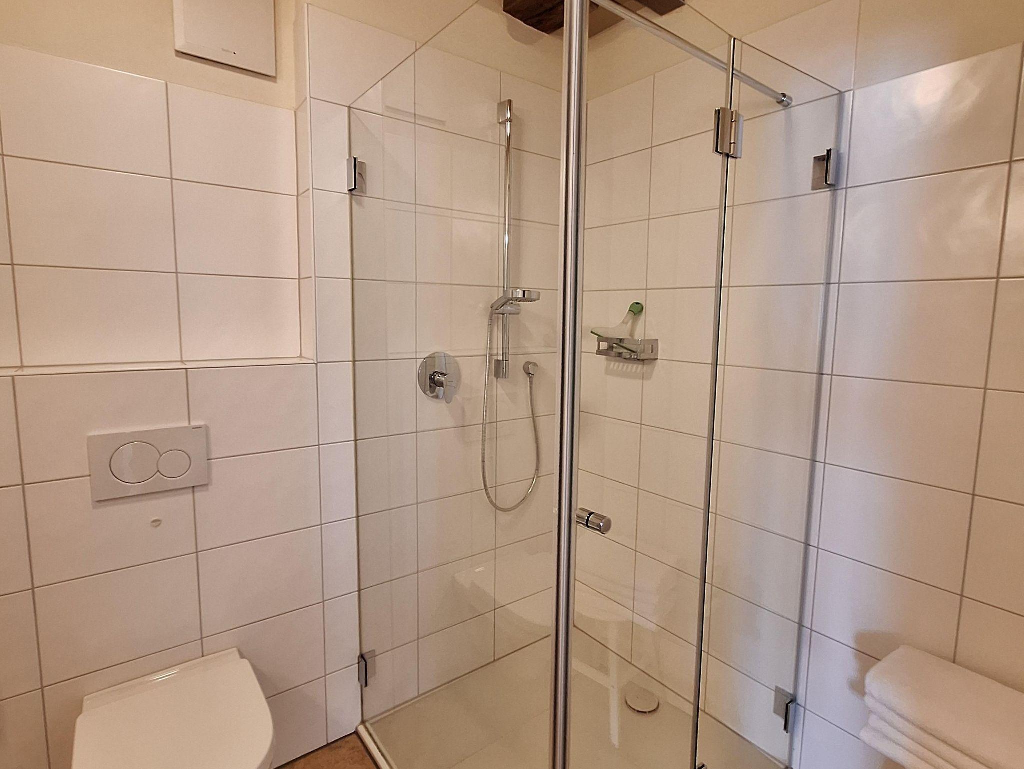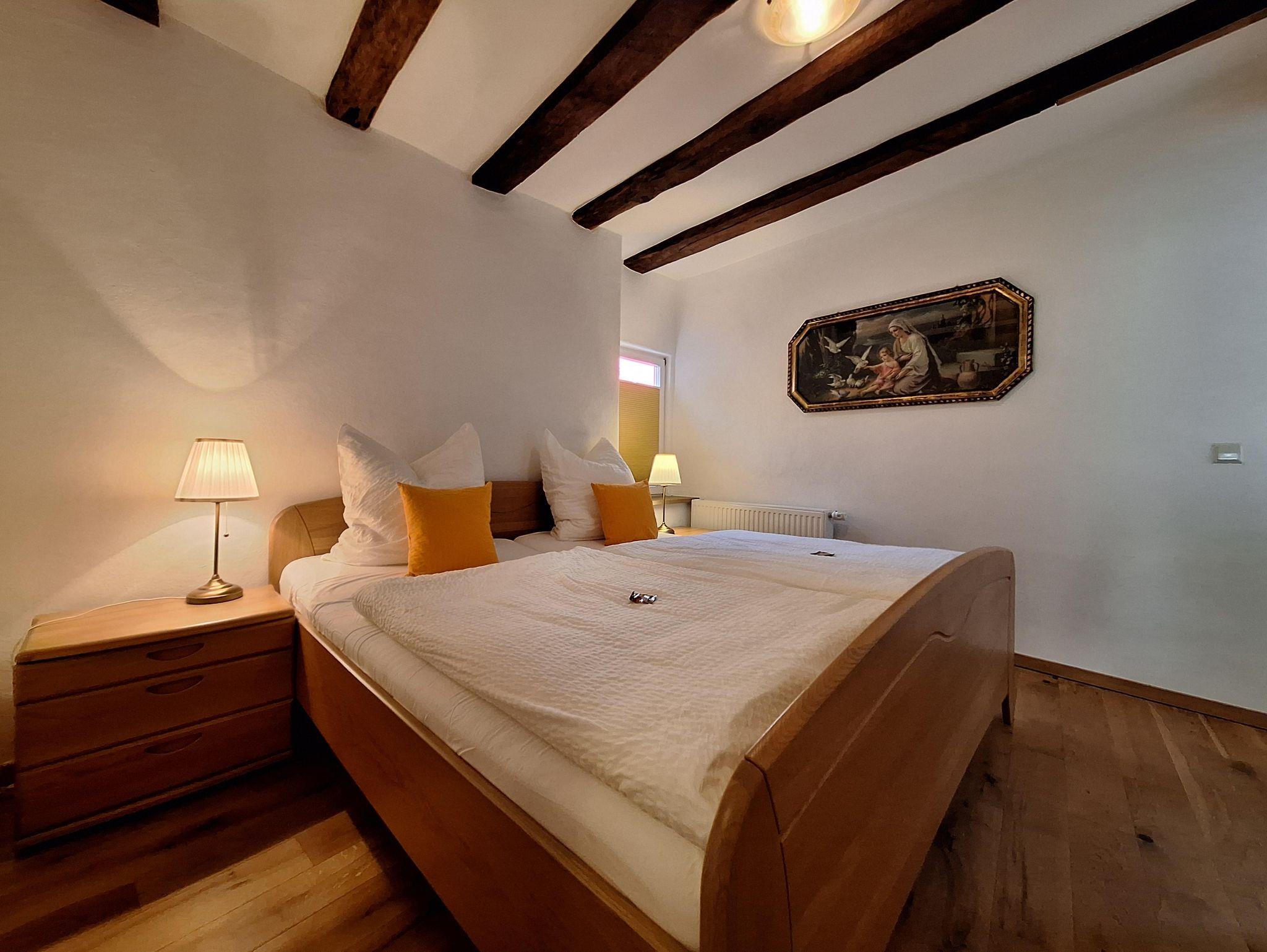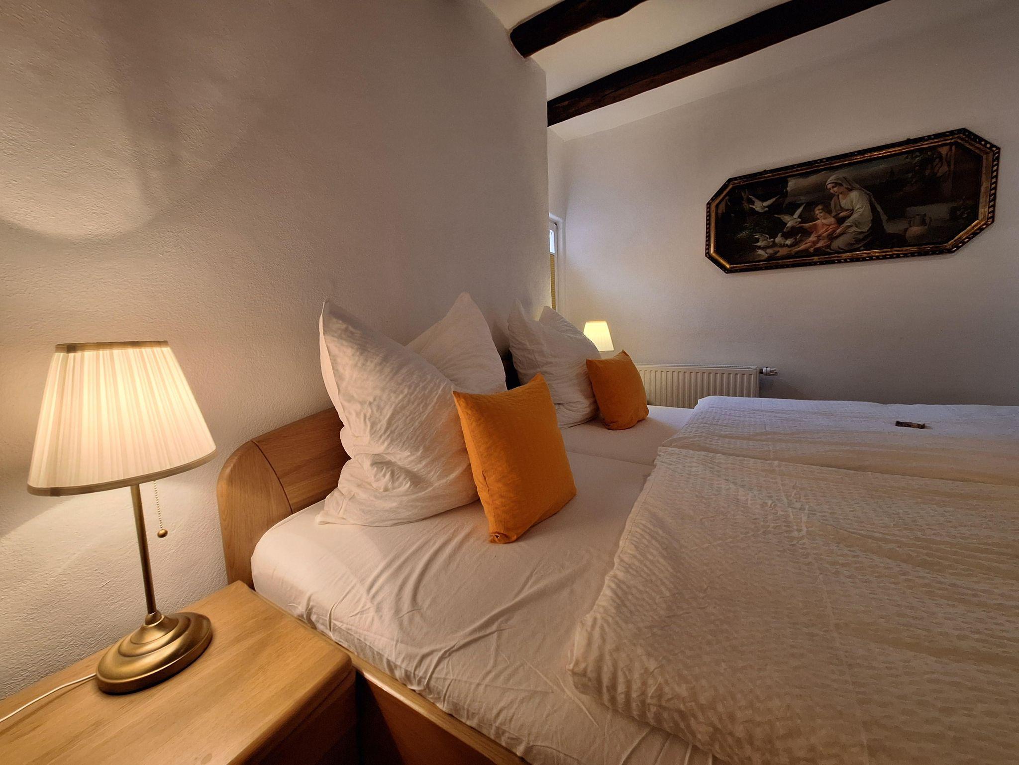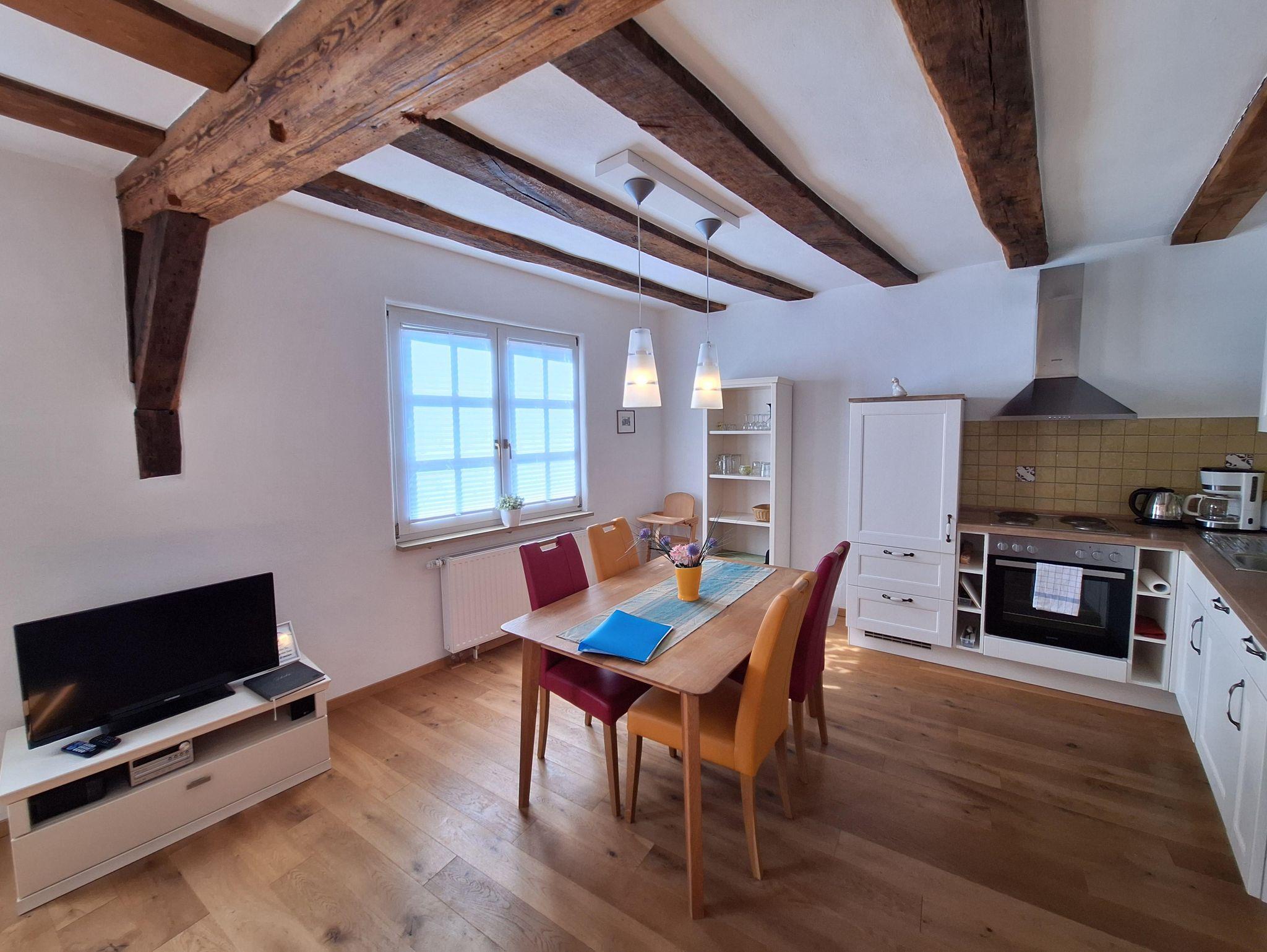 Die Ferienwohnung “Moseltal” befindet sich im Obergeschoss des Hauses für max. 4 Personen. Zum Obergeschoss führt eine Treppe mit ca. 15 Treppenstufen. Das Herzstück ist die gemütliche Wohn- und Essküche, mit der zum Teil sichtbaren Fachwerkkonstruktion. Die vollausgestattete, offene Küche bietet alles für ein gemeinsames Frühstück, Mittag- und Abendessen mit der ganzen Familie: Ceranfeldherd, Backofen, Spülmaschine, Toaster, Wasserkocher und einem Kühlschrank mit Gefrierfach sind vorhanden. Es sind zwei Schlafzimmer vorhanden, jeweils mit einem Doppelbett. Bezogene Betten und Handtücher sind für uns eine Selbstverständlichkeit. Das Badezimmer ist mit einer ebenerdigen Dusche, einem WC sowie einem Handtuchwärmer und Fön ausgestattet.