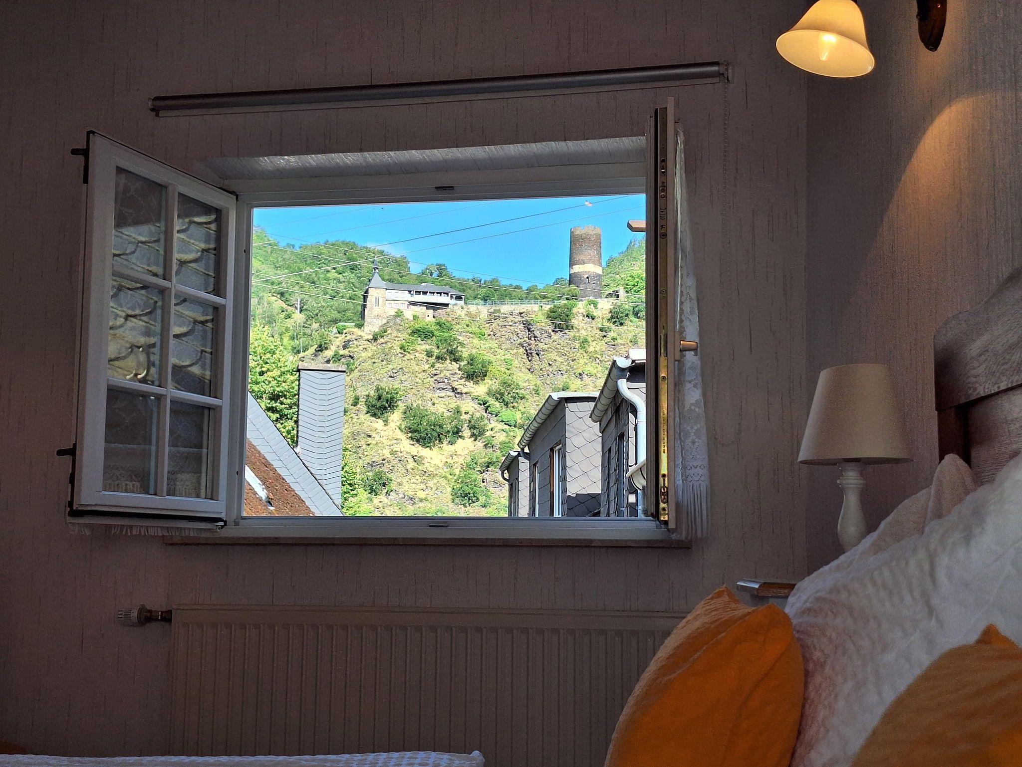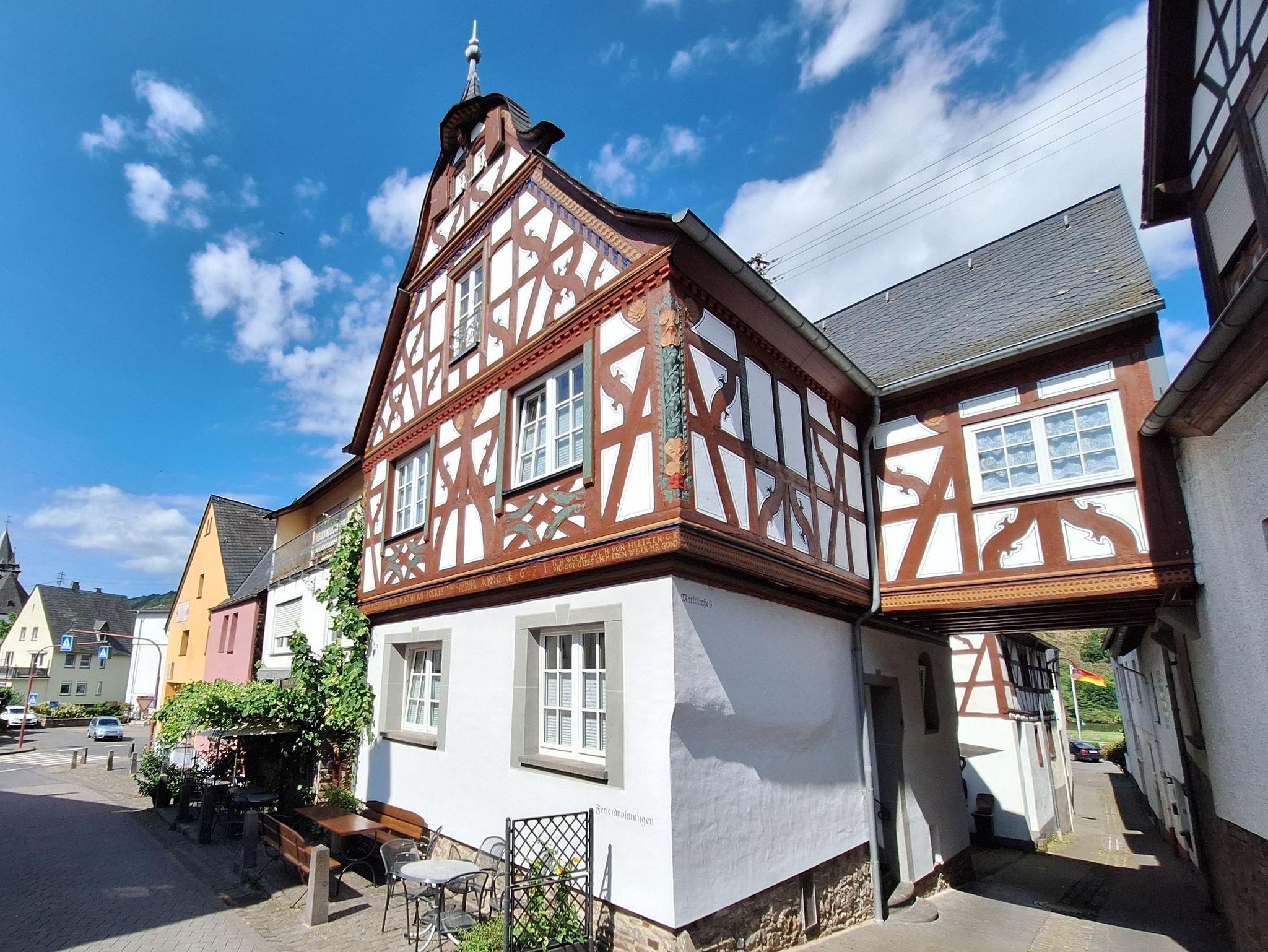 Unser Haus wurde im Jahr 1671 erbaut. Die Außenmauern des Erdgeschosses sind bis zu 70 cm dick aus Bruchsteinen hergestellt. Darüber ist ein reiches barockes Fachwerk aus Eiche errichtet. Die Deckenhöhe der Räume ist selbst für heute Verhältnisse großzügig. In den Jahren 2012 bis 2016 wurde das Haus kernsaniert. Wir legten großen Wert auf hohe ökologische Standards und verwendeten die ursprünglichen Baumaterialien Holz, Lehm und Kalk. Raumwärme und Warmwasser werden mit einer Holz-Pelletheizung erzeugt. Es entstanden 2 Ferienwohnungen mit hohem Komfort: die Wohnung „Bergblick“ im Erdgeschoss mit einem Schlafzimmer (bis zu 2 Personen) sowie die Wohnung „Moseltal“ im Obergeschoss mit zwei Schlafzimmern (bis zu 4 Personen). Bei größerem Platzbedarf können beide im Haus befindlichen Ferienwohnungen zu einem großen Ferienhaus mit maximal 6 Schlafplätzen (3 Schlafzimmern) gemietet werden. Unmittelbar zum Haus verlaufen vielseitige Wander-, und Radwege. Für den täglichen Bedarf (Lebensmittel) finden Sie alles im Nachbarort Treis-Karden - gut mit Fahrrad oder Auto zu erreichen. Die Bäckerei im Ort befindet sich nur wenige Gehminuten entfernt. Genießen Sie Rundfahrten und Tagesfahrten nach Cochem & Koblenz während einer Schifffahrt auf der Mosel, der Schiffsanleger befindet sich unmittelbar am Moselufer. Unser Haus, liebevoll eingerichtet wartet auf seine Gäste.