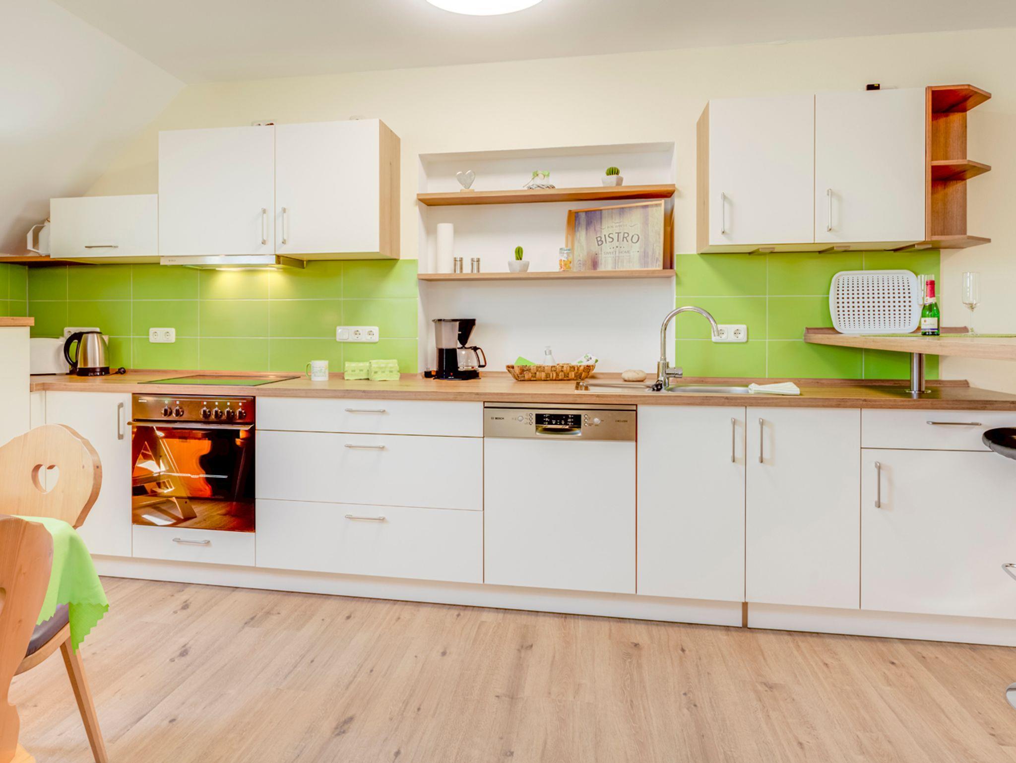 Die gut ausgestattete Wohnküche mit Geschirrspüler, Backofen mit Cerankochfeld, Mikrowelle, Toaster, Wasserkocher, Eierkocher und Kühlschrank mit Gefrierfach lässt keine Wünsche offen.