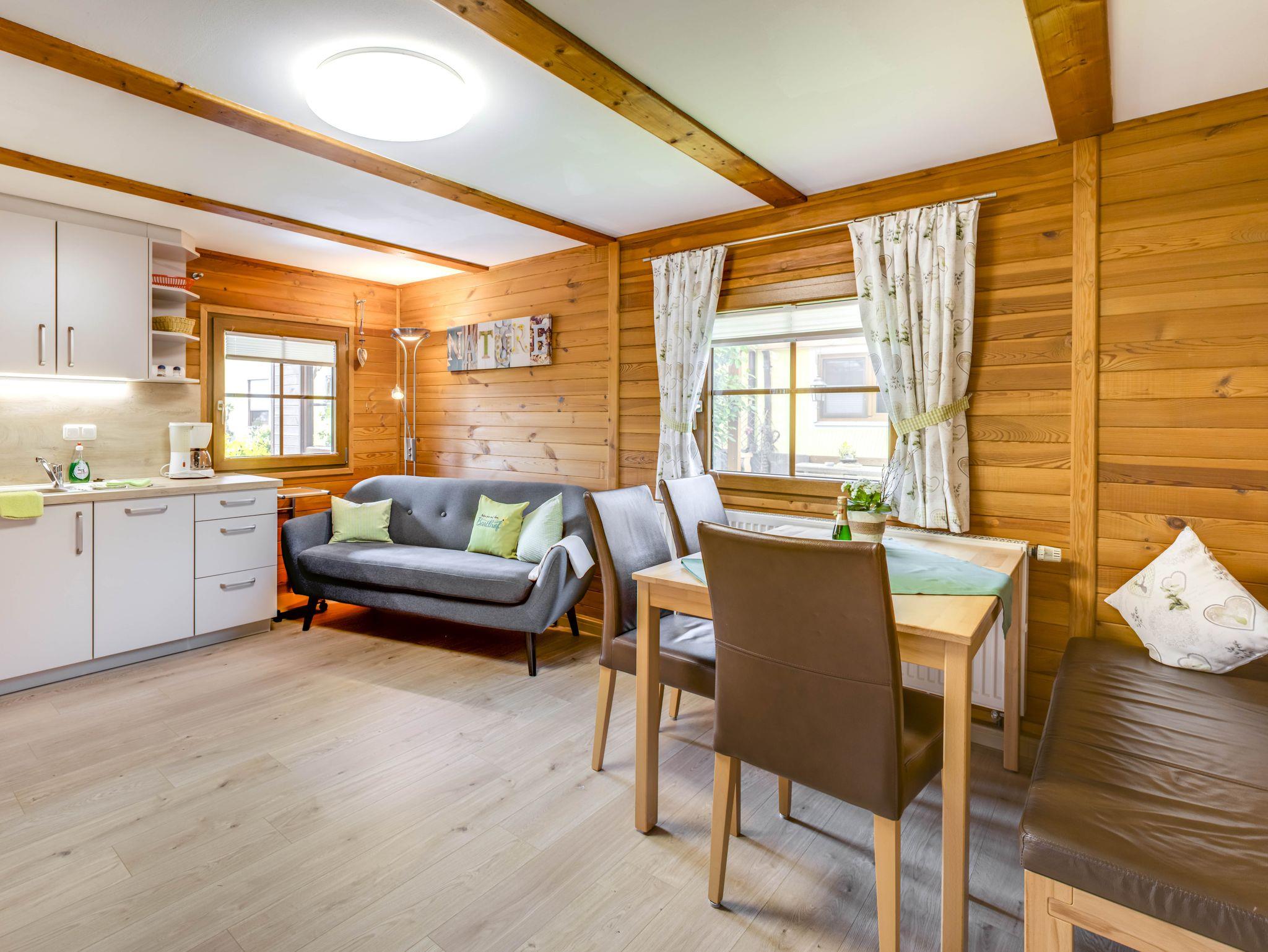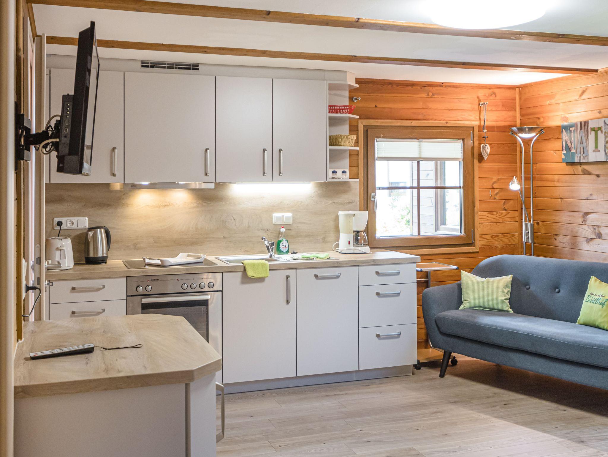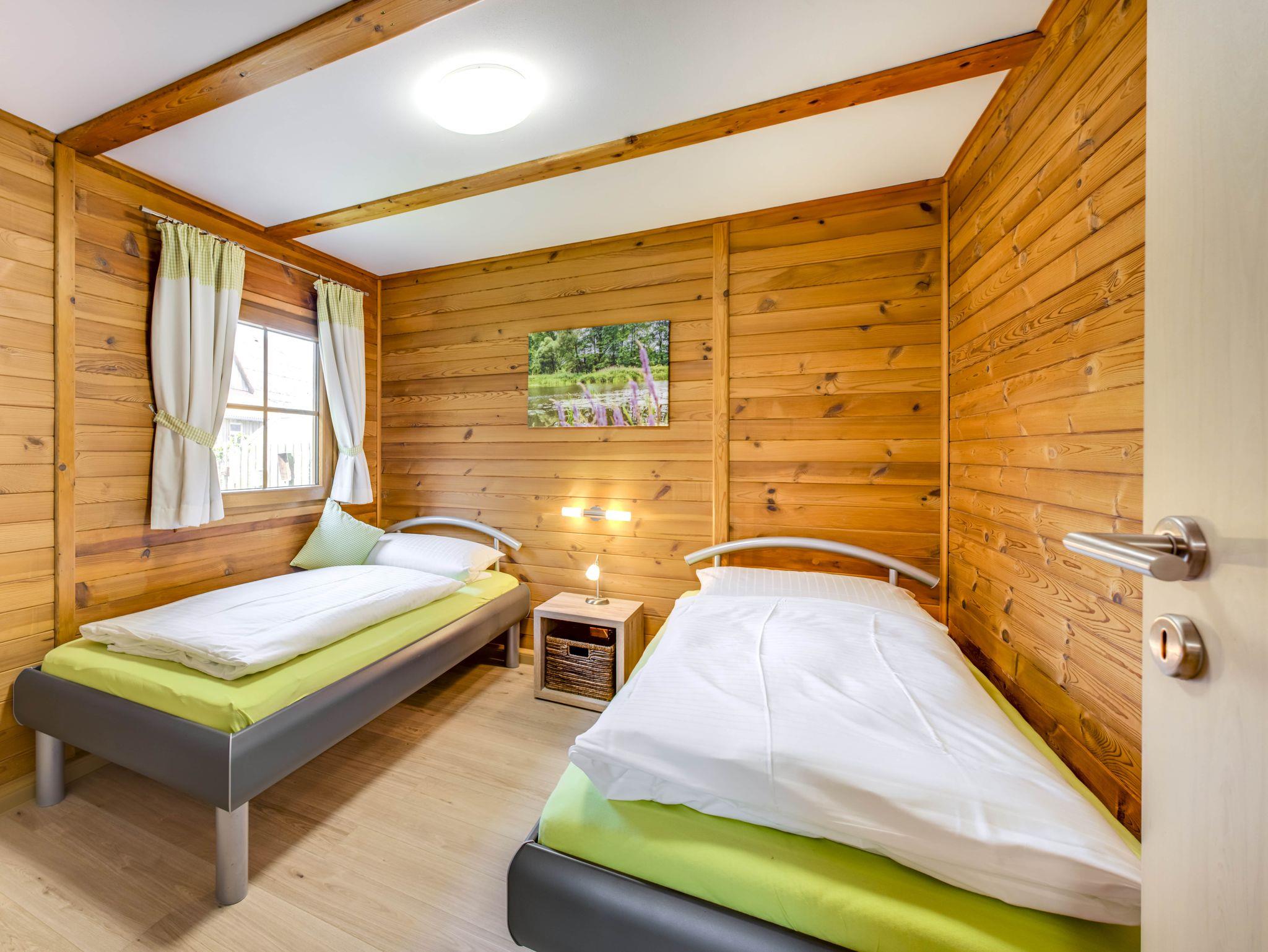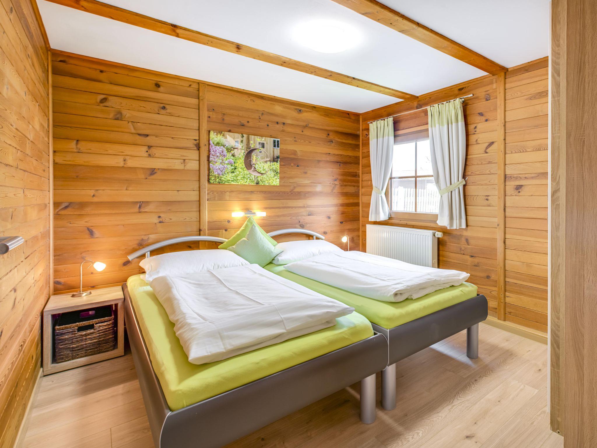 Das Blockhaus hat 2 Schlafzimmern, jeweils mit zwei trennbaren Betten. In der Wohnküche finden Sie einen Kühlschrank, einen Backofen, ein Cerankochfeld, eine Mikrowelle, eine Kaffeemaschine, eine Toaster und einen Wasserkocher. Die Couch lädt zum gemütlichen Fernsehabend ein. Das Bad ist mit einer Dusche und einem WC ausgestattet.