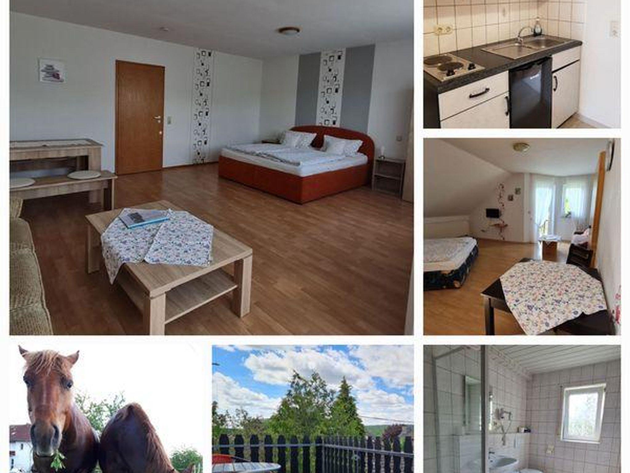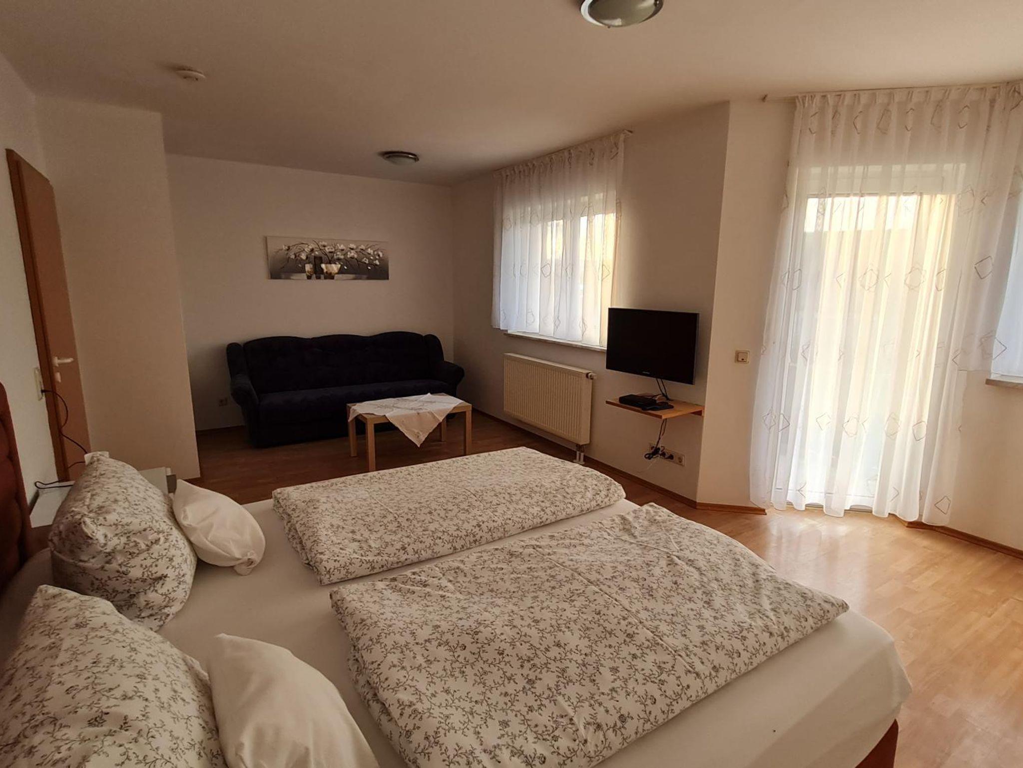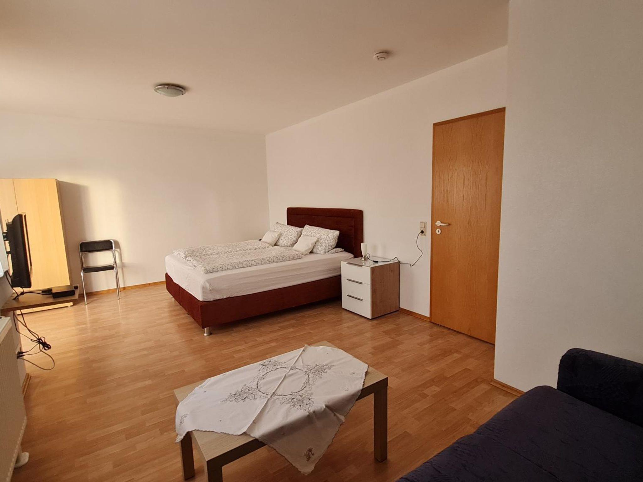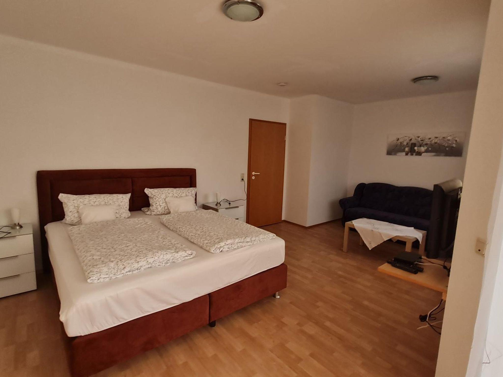 Kombinierter Wohn-/Schlafbereich mit einem Doppelbett, Sitzgelegenheit, TV, Radio, Miniküche, Essecke, Dusche/WC, Balkon, 1. Etage