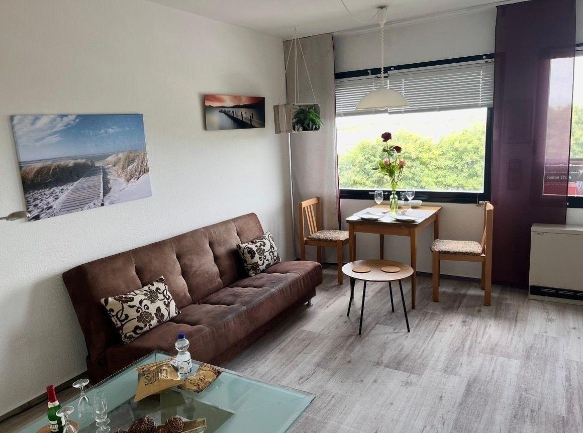 Die Wohnung ist modern, hell und freundlich eingerichtet und verfügt über 1 Wohn-Schlafraum mit 2 Einzelschrankbetten, einem Schlafsofa, einem Couchtisch, einer Sitzgruppe, einem separaten Esstisch, Pantryküche und Vollbad. Zu der modernen Ausstattung kommt hierbei ein großer schwenkbarer Flachbild-TV 32 Zoll für digitalen Fernsehgenuss, Rauchmelder, schwenkbarer Lüfter, helle freundliche Jalousien, heller Teppich, Deckenfluter/Leselampe hinzu.