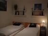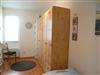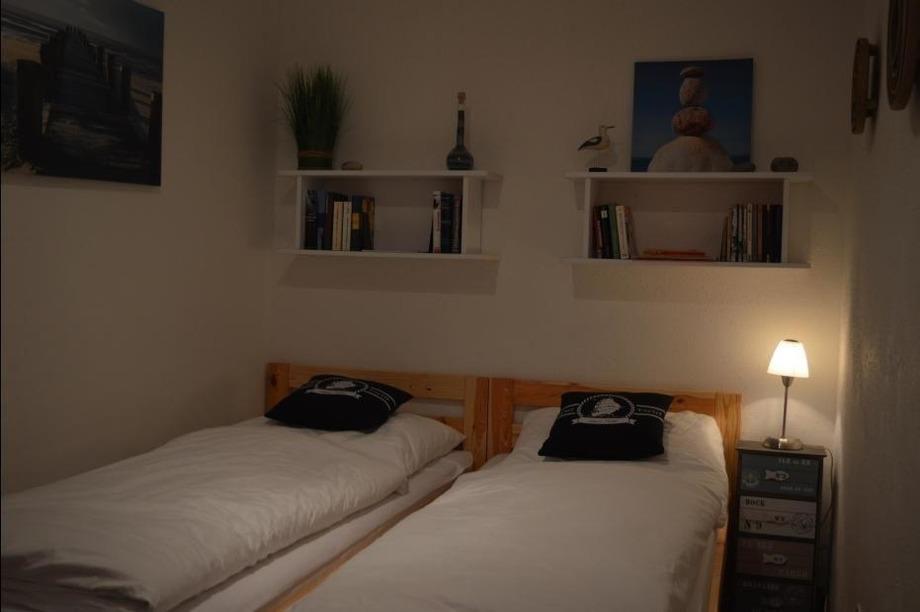 Der Schlafraum verfügt über zwei bequeme Betten, die im Bedarfsall zusammengeschoben werden können, sowie einen viertürigen Kleiderschrank; reichlich Bügel sind vorhanden. Hinter dem Vorhang des kleinen Schrankes befindet sich ein Kinderbett, für das in dem Raum genügend Platz vorhanden ist. Die passende Matratze liegt auf dem Kleiderschrank.