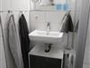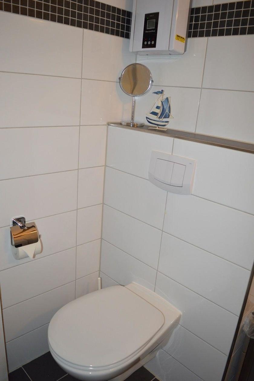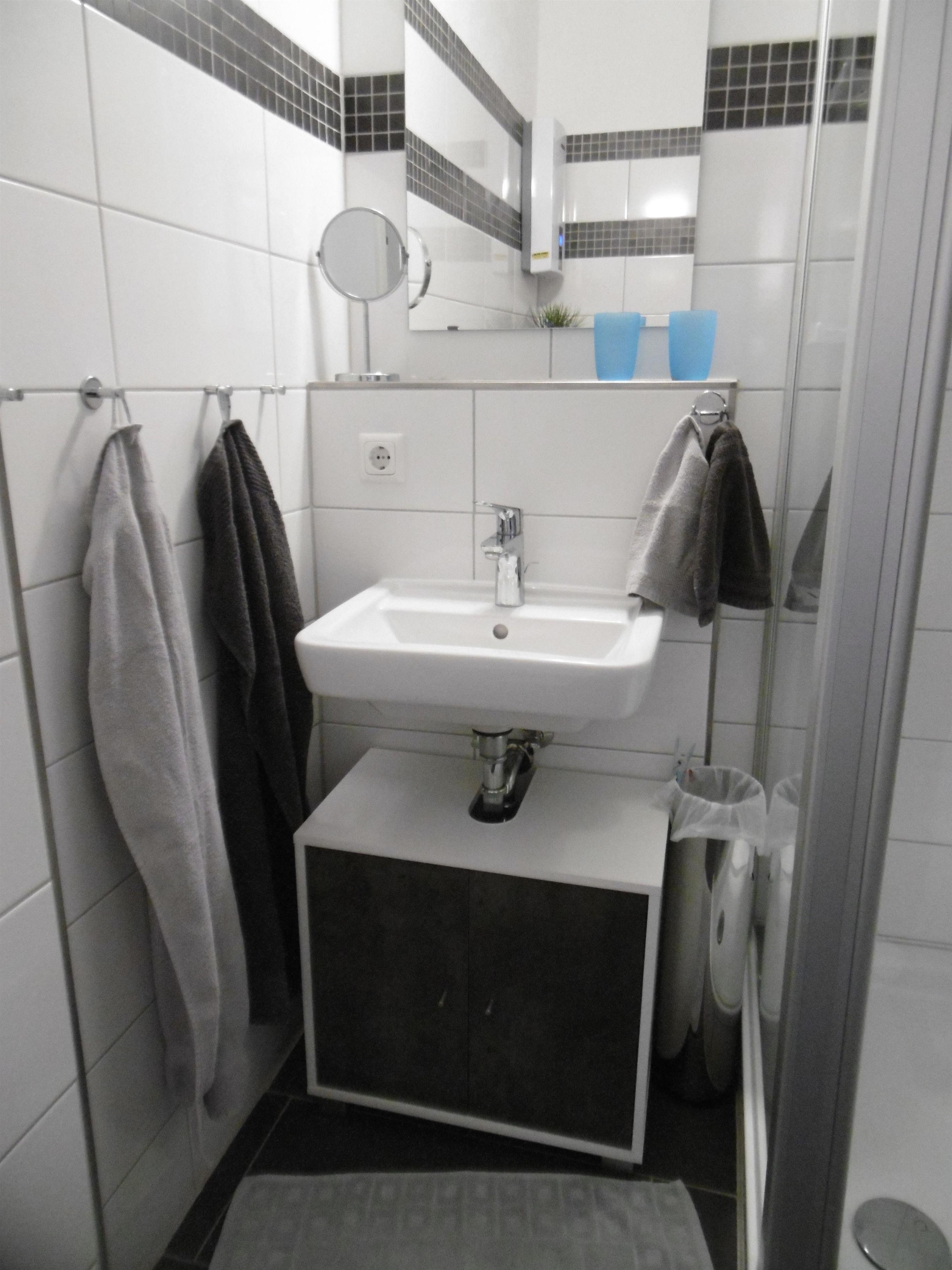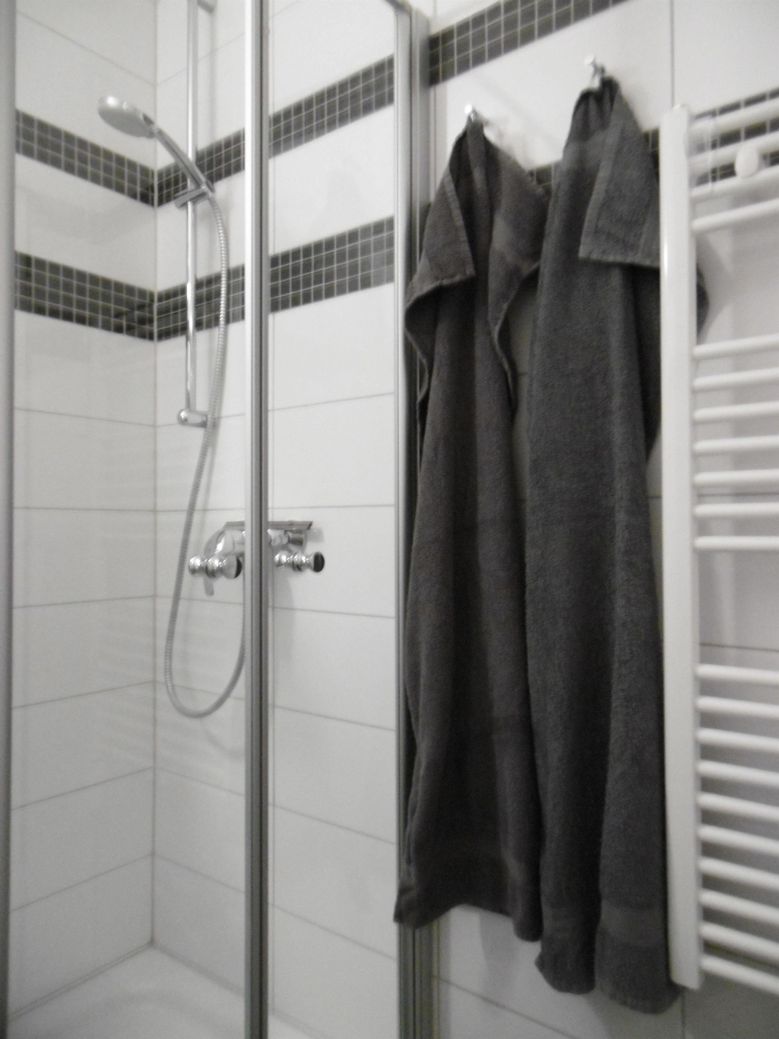 Das helle Duschbad ist mit Handtuchheizkörper, Wäschespinne und Fön ausgestattet.