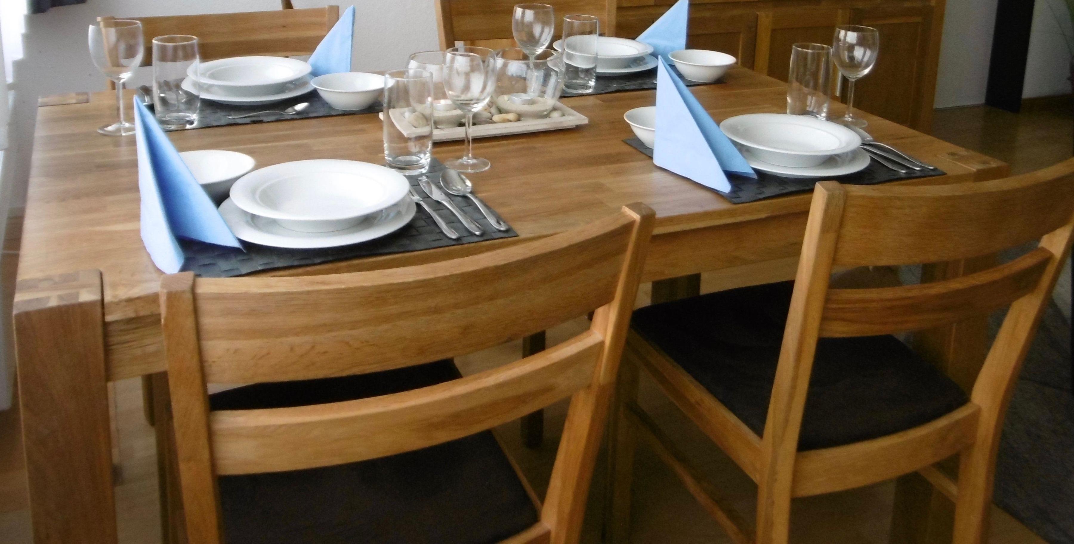 Im Wohnraum selbst steht ein Sideboard mit ausreichend Geschirr, Gläsern und Besteck; auch eine Spielesammlung, eine Musikanlage und einen Flachbildschirm-TV. Ein angenehmer Eßplatz und eine komfortable Sitzgruppe wird Sie überzeugen. Das grössere Sofa ist mit wenigen Handgriffen in ein bequemes Doppelbett zu verwandeln (Längsschläfer); in dem Bettkasten des kleineren Sofas sind die zugehörigen Bettdecken und Kopfkissen verstaut.