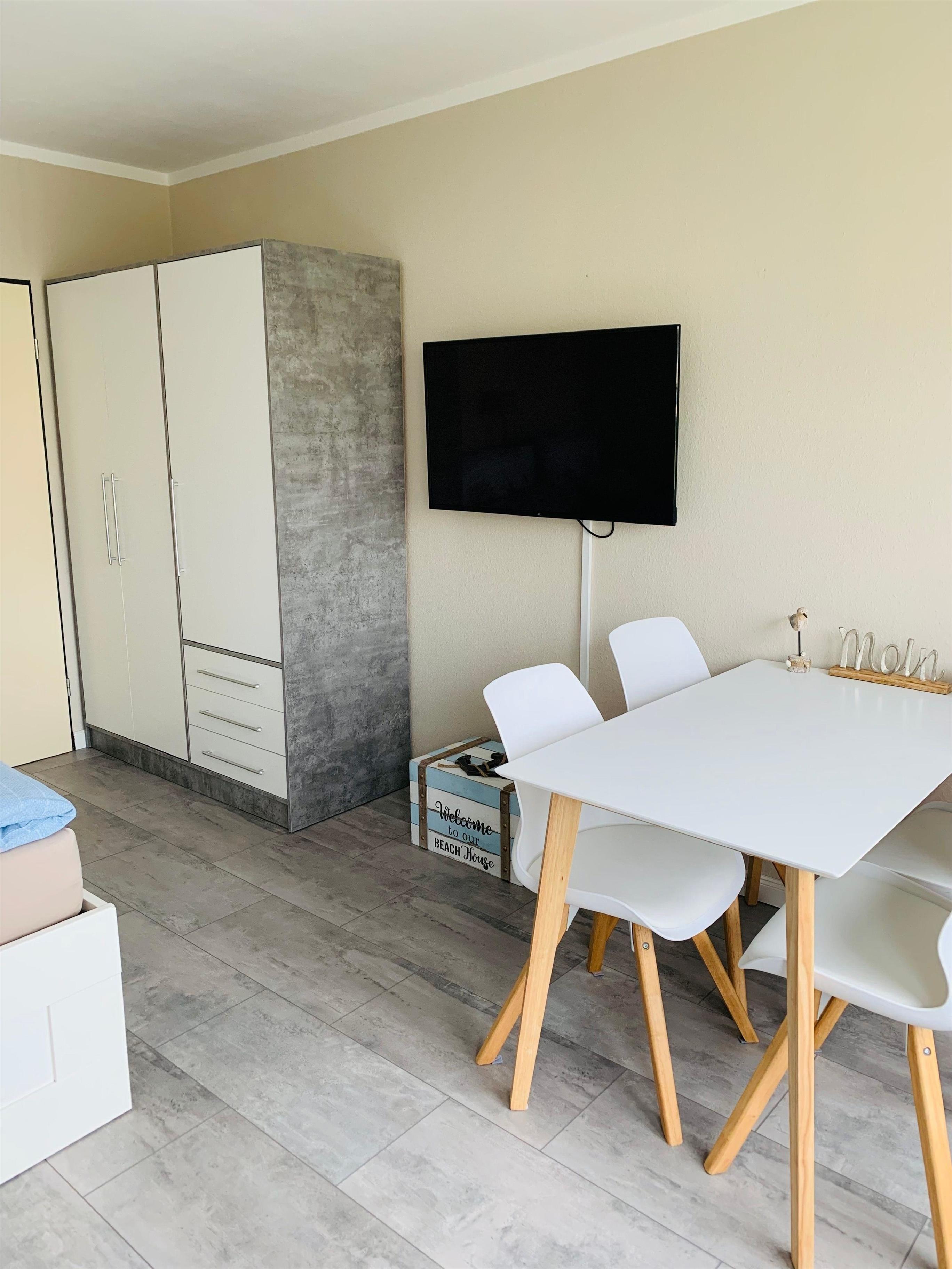 Ein Esstisch mit 4 Stühlen rundet das Zimmer ab.