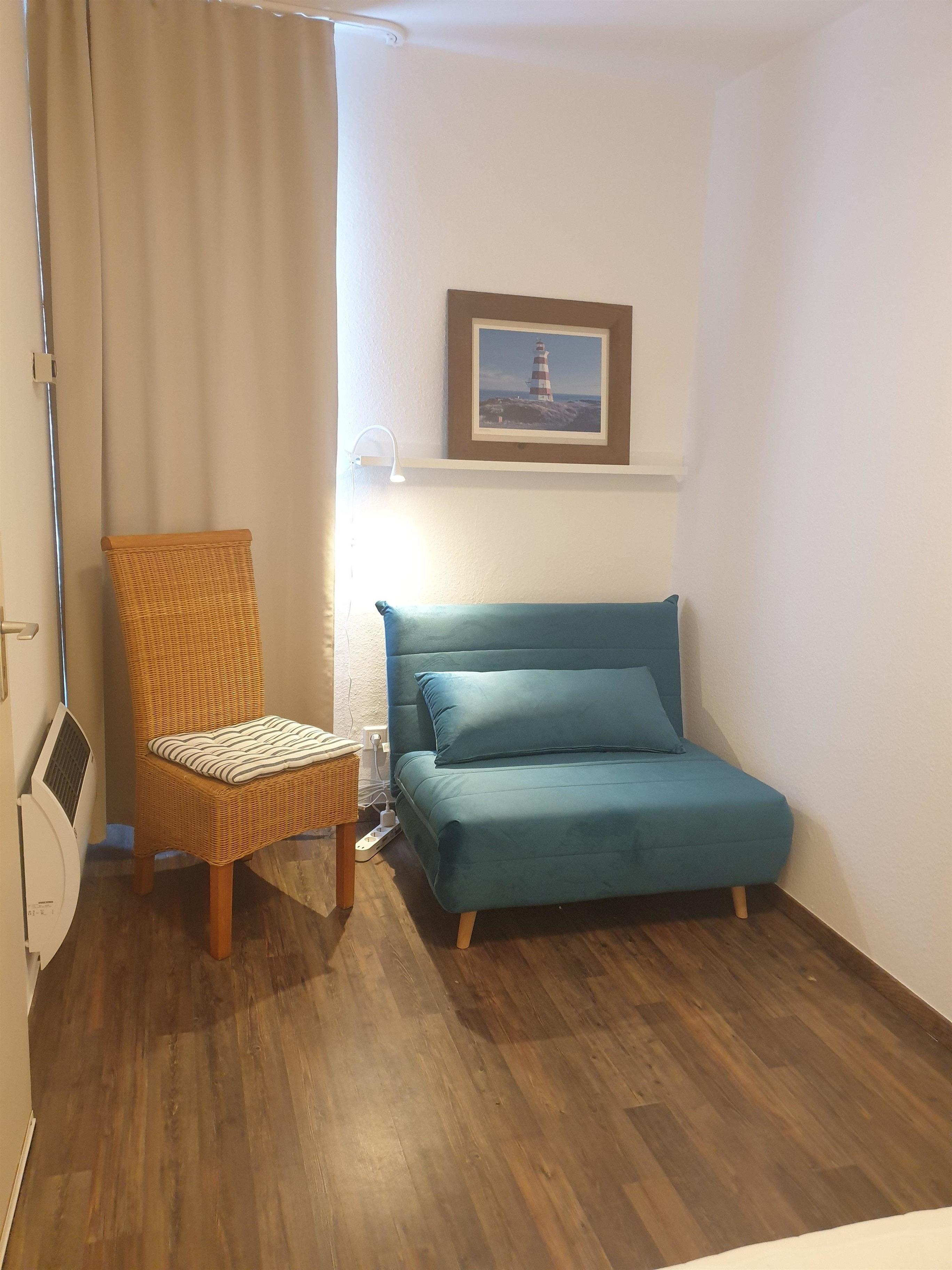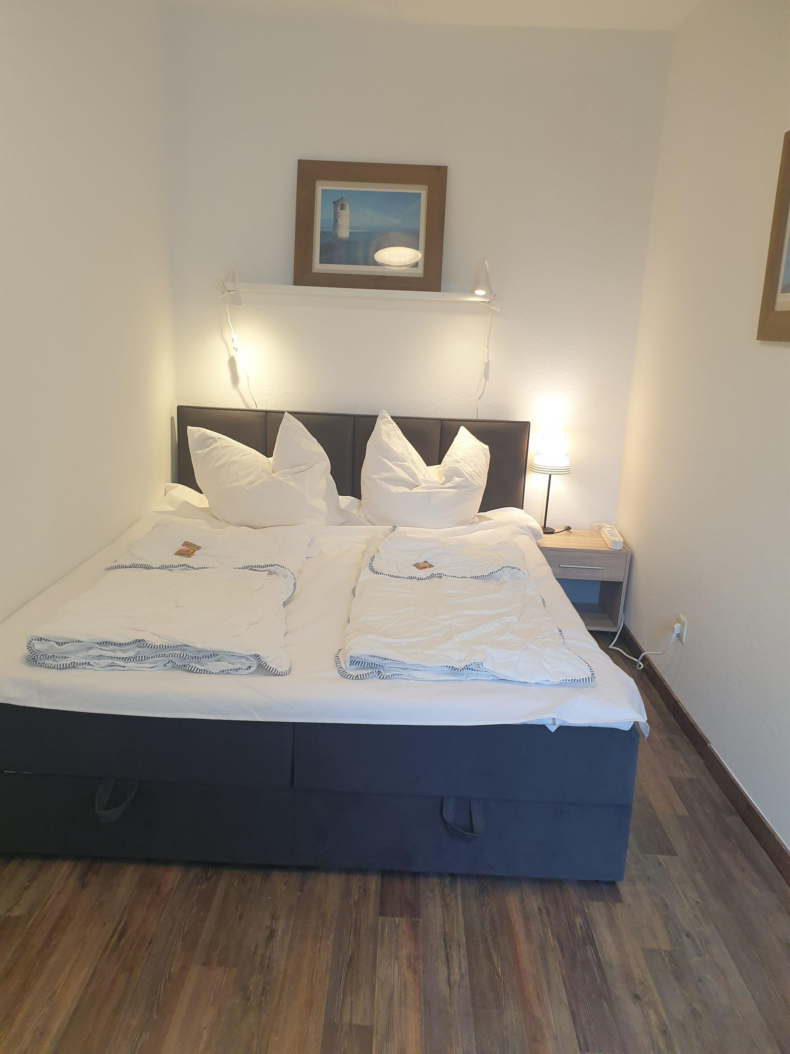 Im Schlafraum befindet sich ein Boxspringbett für zwei Personen (Matratzengröße 160 cm x 200 cm) und ein komfortabler Schlafsessel für eine weitere Person (Größe 100 cm x 200 cm).
