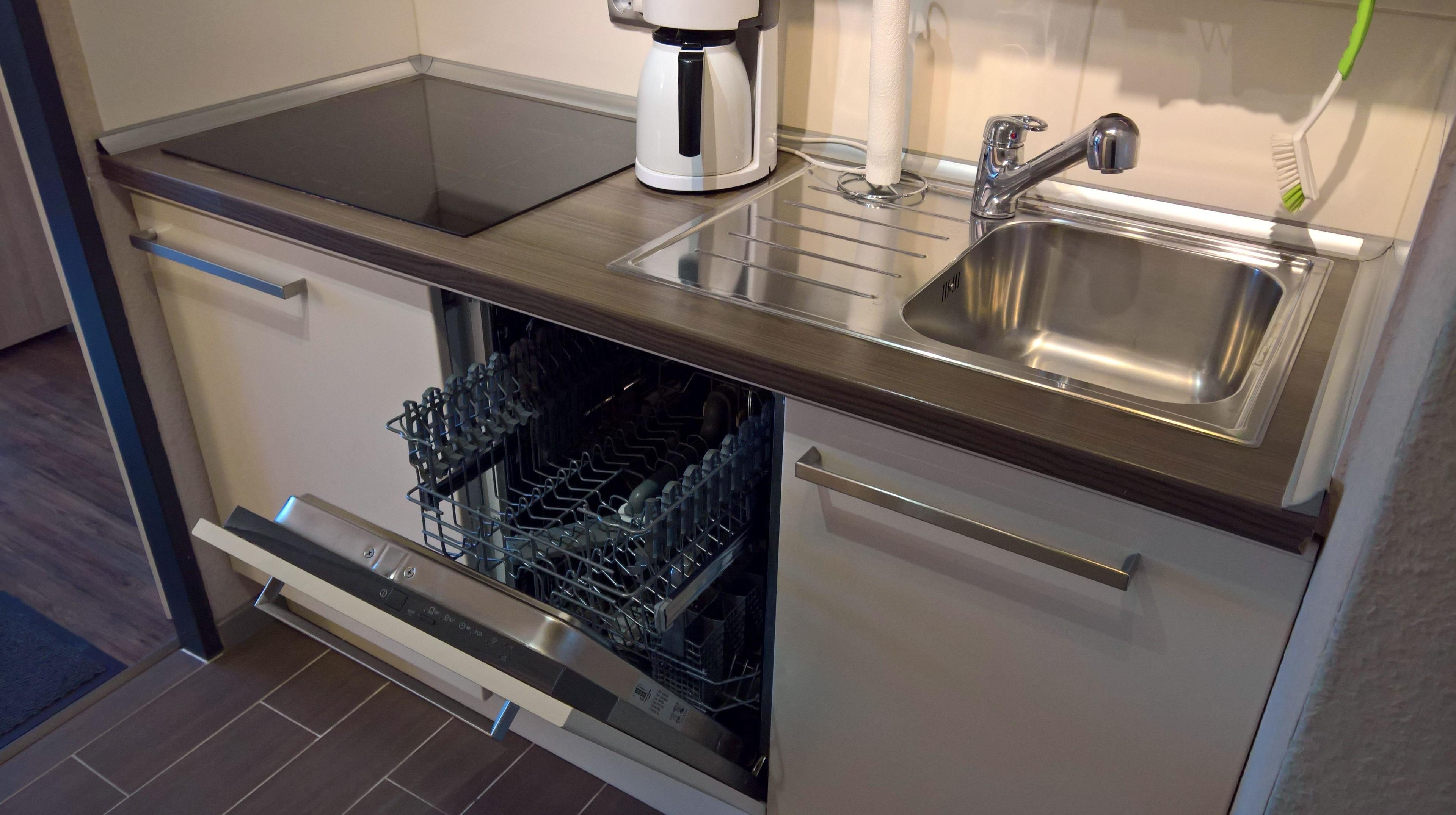 Im Kochbereich befindet sich die Einbauküche mit Geschirrspüler, 4-Zonen-Induktionsfeld, Mikrowelle, Kühlschrank mit Eisfach, Kaffeemaschine, Wasserkocher, Toaster, Eierkocher, Geschirr, Töpfe, Besteck ....