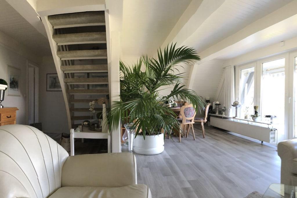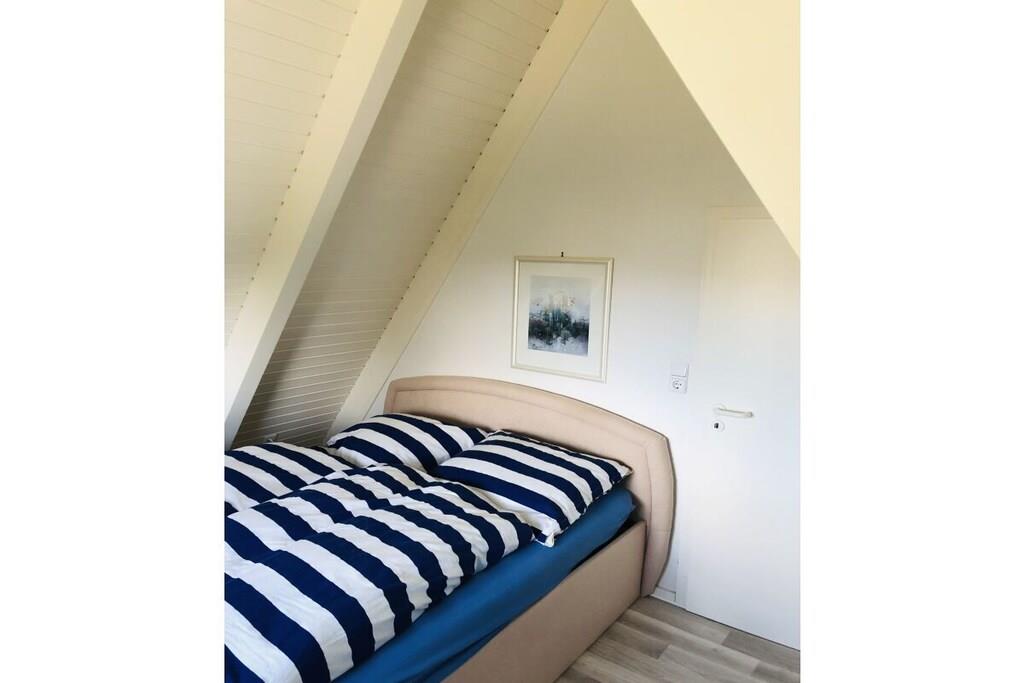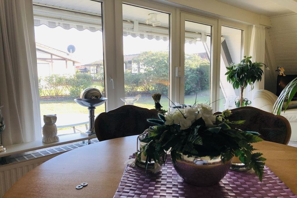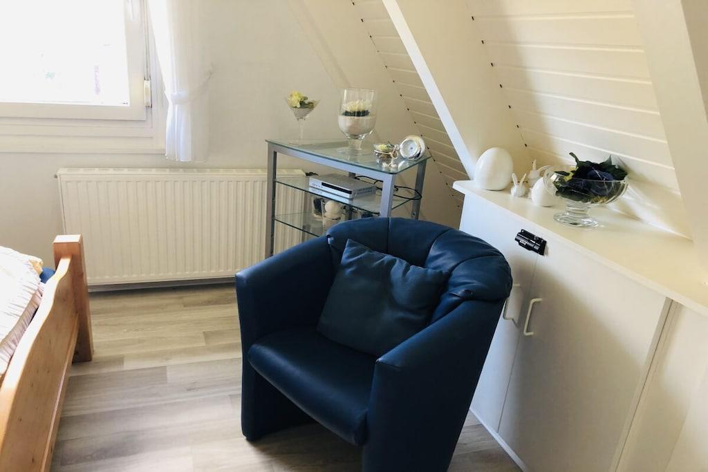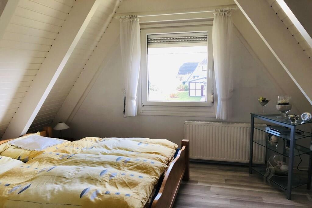 Ground floor: (hallway(Mirror, Wardrobe Coatrack), Kitchen(Spices, Kitchenette, hob, electric kettle, toaster, coffee machine, dishwasher, fridge), Living/diningroom(Armchair, Sofa, TV, dining table, DVD player, radio), bedroom(Sofa, double bed, insect screens), bathroom(Make Up Mirror, Mirror, toilet, shower, washbasin, hairdryer)) On the 1st floor: (bedroom(Armchair, Wardrobe, double bed, radio, insect screens)) Hot Water, Internet Access DSL, Vacuum Cleaner, Internet access, heating, terrace(Lawn, grill, garden furniture, awning), garden(Lawn)