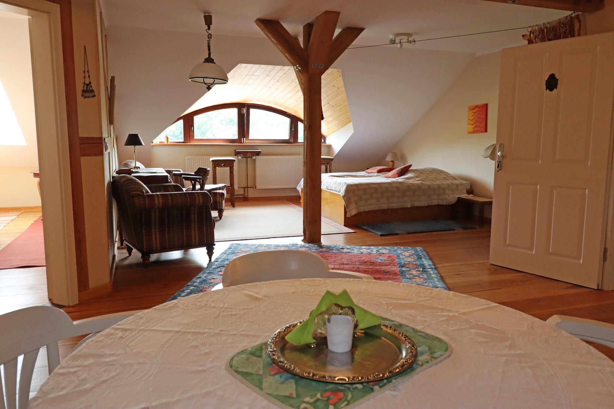 Denne generøse ferielejlighed ligger på den ekspansive Buschenhagen økogård, et sted kendt for sin rige biologiske mangfoldighed. Beliggende mellem verdensarvsbyen Stralsund og den travle havn i Barth, grænser den op til Vorpommersche Boddenlandschaft Nationalpark - Europas nøglekranehvileområde og Tysklands største Østersø-nationalpark. Beliggende på første sal i et charmerende hus, det kan rumme op til 4 gæster og et lille barn komfortabelt. Indenfor finder du en hyggelig stue med et moderne åbent køkken og spiseplads, en åben soveplads med dobbeltseng, et ekstra rummeligt soveværelse og et badeværelse med bruser og toilet. Perfekt til familier eller venner, lejligheden byder på masser af plads til at slappe af og nyde. Udenfor kan gæsterne udforske store naturlige enge, en dam og forskellige husdyr eller slappe af i haven, mens de ser storke eller besøger den fælles sauna. Med flere ferielejligheder og et seminarrum til rådighed, byder denne øko-gård velkommen til grupper, der søger ro og natur. Det er en ideel base for at opleve den fredfyldte skønhed og dyreliv ved Østersøkysten, tæt på charmerende historiske byer og naturparker.