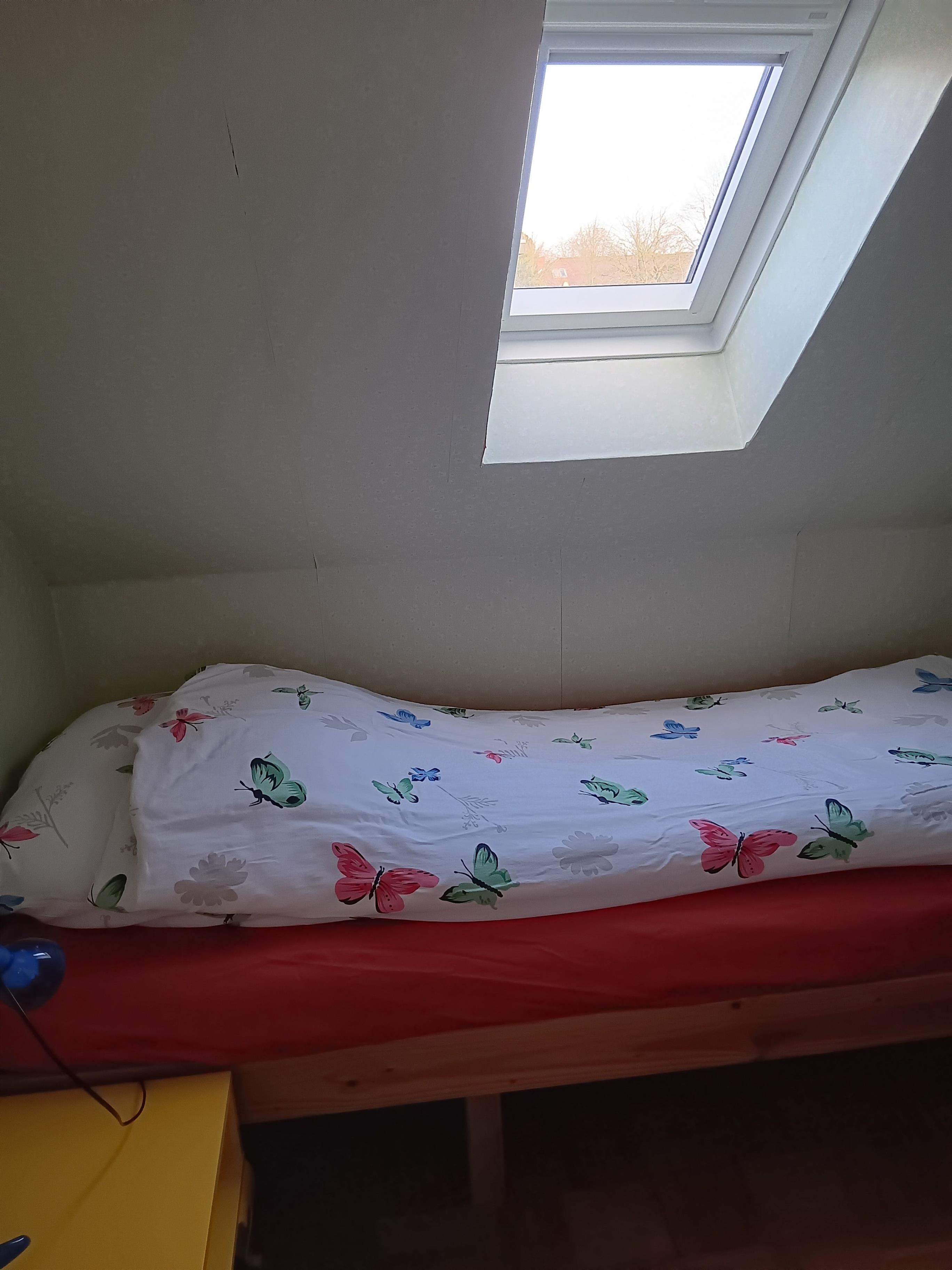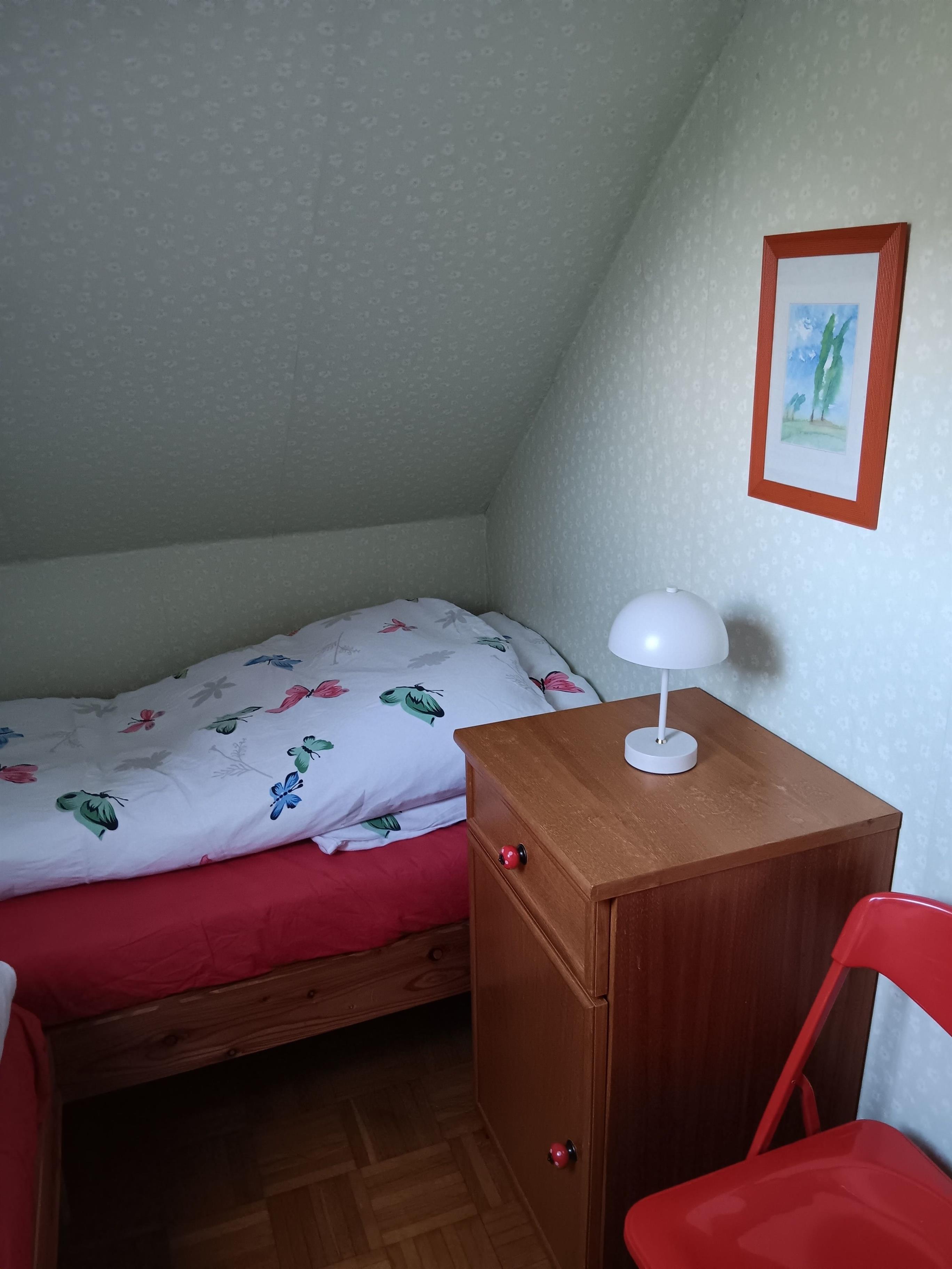 Die Ferienwohnung ist eine Einliegerwohnung im Dachgeschoss eines Einfamilienhauses. Das Haus befindet sich auf einem 930 m2 großen Grundstück. Zu Fuß erreichen Sie in 20 Minuten das Weltkulturerbe Haithabu und in nur 3 Minuten den Verbindungswall. Die Schlei ist etwa 5 km vom Grundstück entfernt.