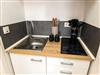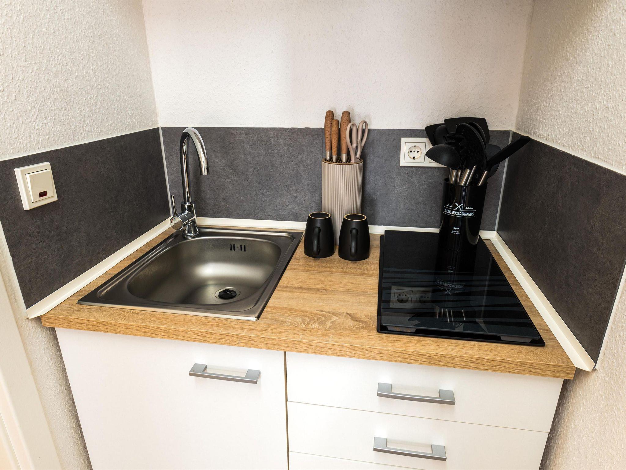 Die kleine, aber gut ausgestattete Küchenzeile verfügt über alles, was Sie zur Zubereitung Ihrer Mahlzeiten benötigen. Mit modernen Geräten und ausreichend Stauraum ist sie perfekt auf die Bedürfnisse einer kompakten Ferienwohnung abgestimmt.