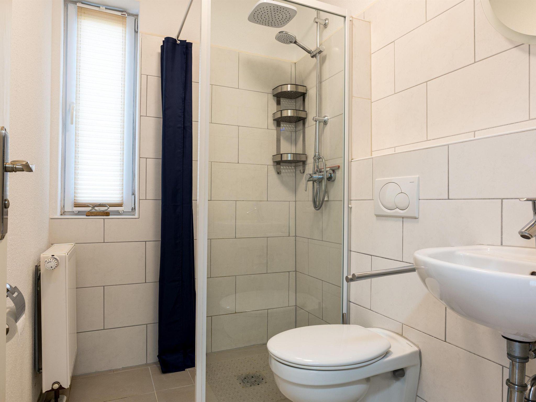 Das moderne Badezimmer ist mit einer ebenerdigen Dusche und einem WC ausgestattet. Hier wurde auf zeitgemäßes Design und Funktionalität geachtet, sodass Sie sich rundum wohlfühlen können.