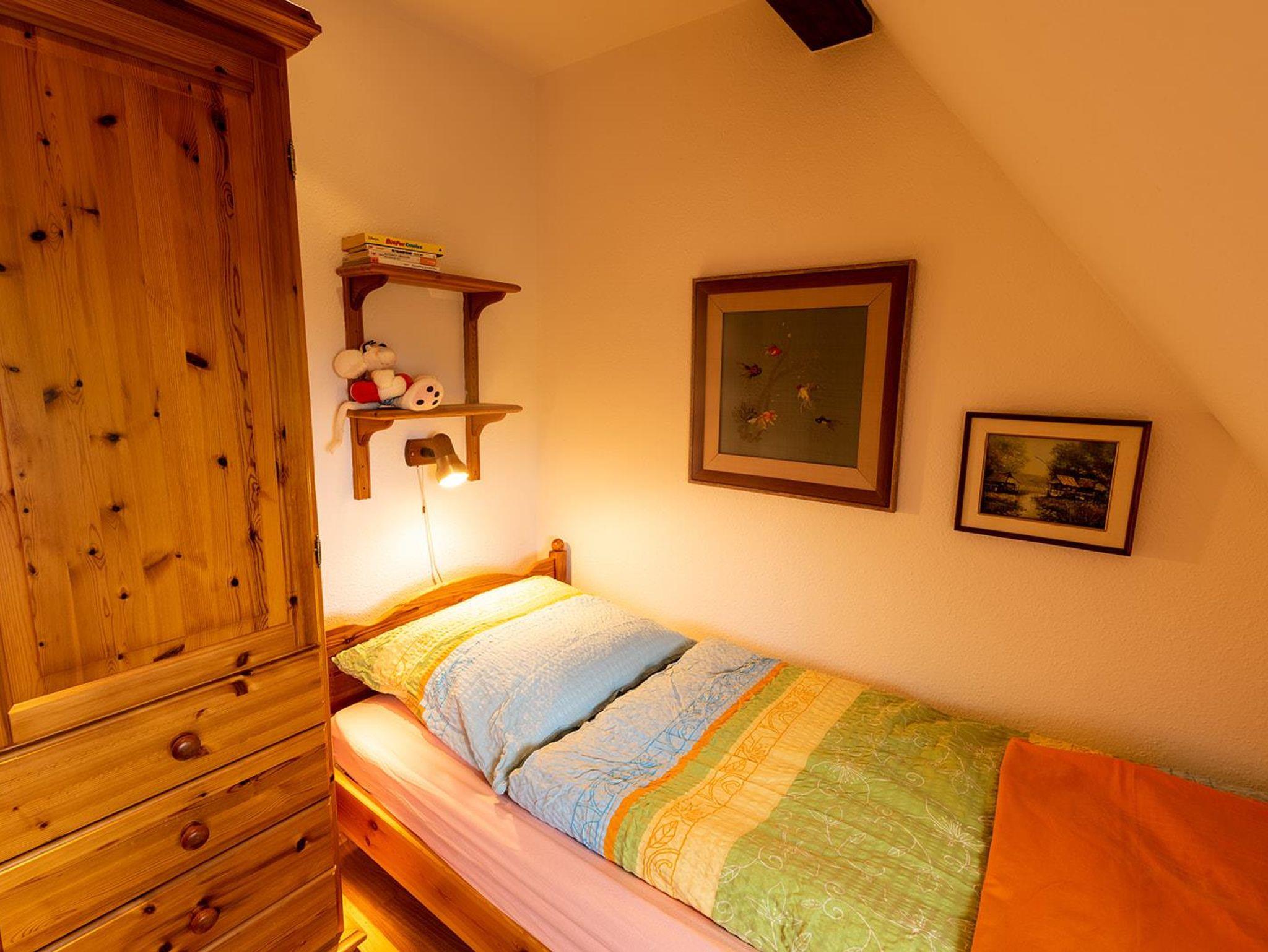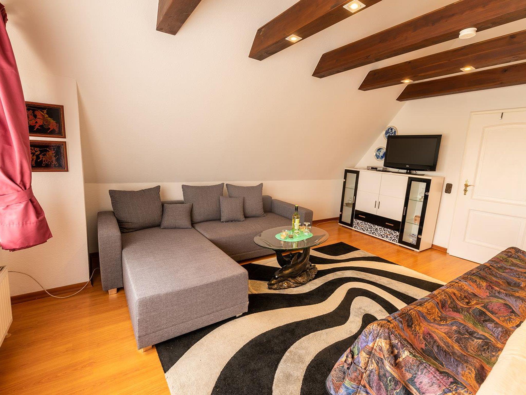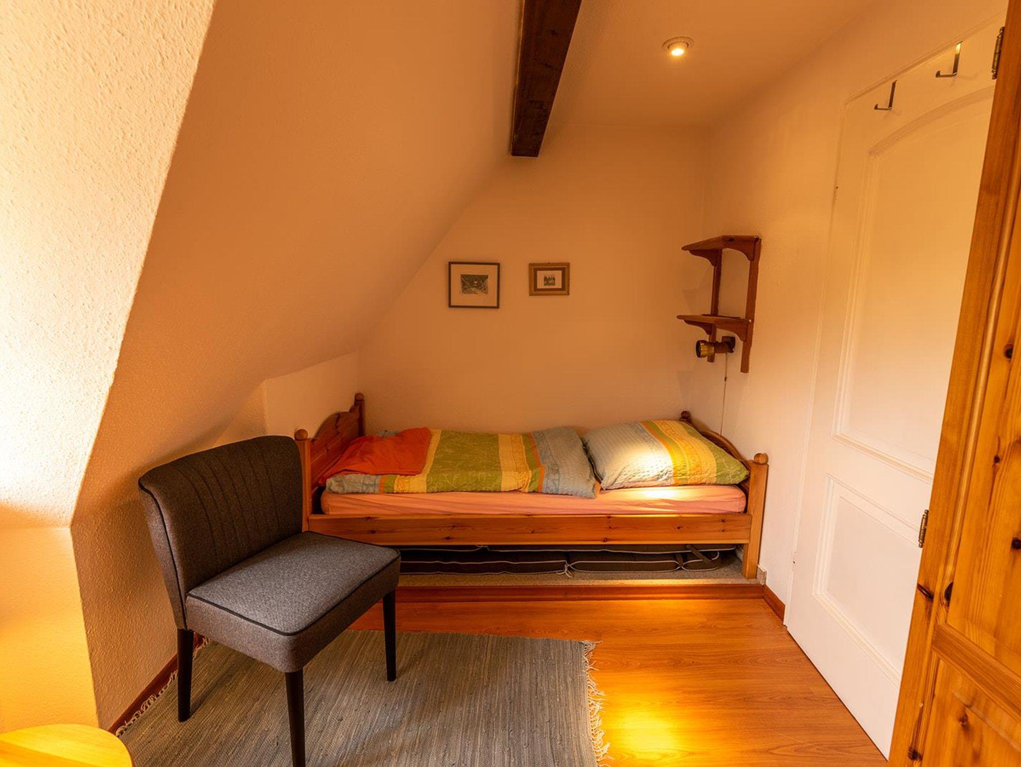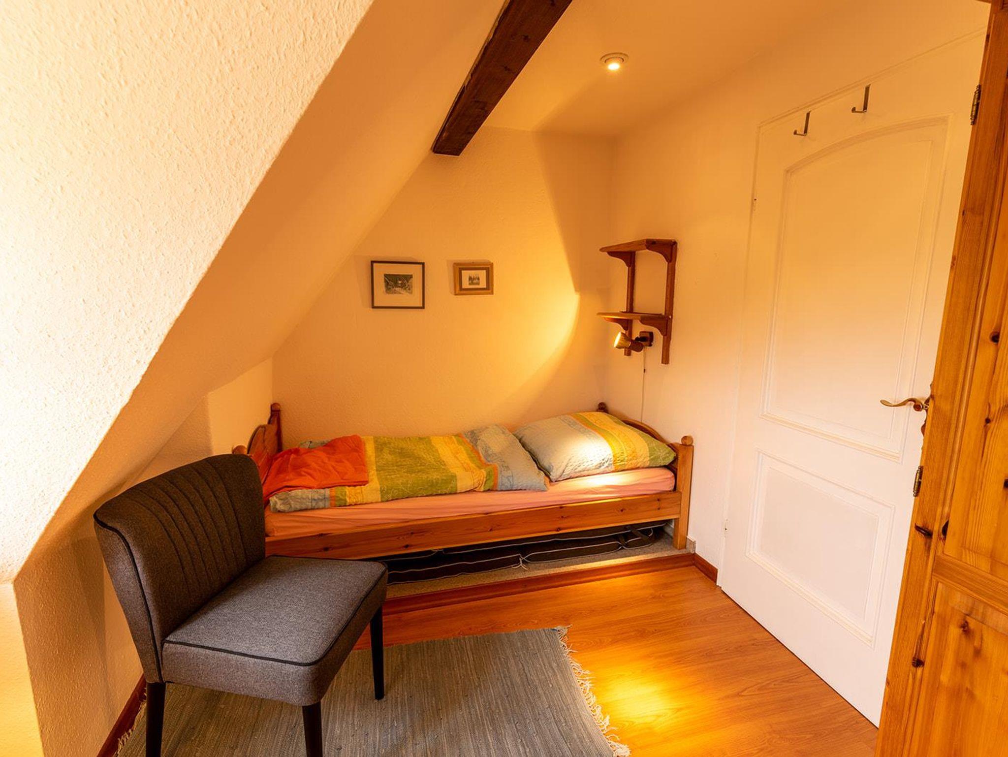 Die im Obergeschoss befindliche Ferienwohnung besitzt neben der Vollküche ein seperates Schlafzimmer mit zwei Einzelbetten. Die an das große Wohnschlafzimmer angegliederte Dachterasse, bietet viel Platz für die ganze Familie. Eine externe Treppe führt direkt von der Terasse in den Garten. Das Badezimmer ist mit Dusche ausgestattet, ein Sat-TV befinden sich im Wohnschlafzimmer.