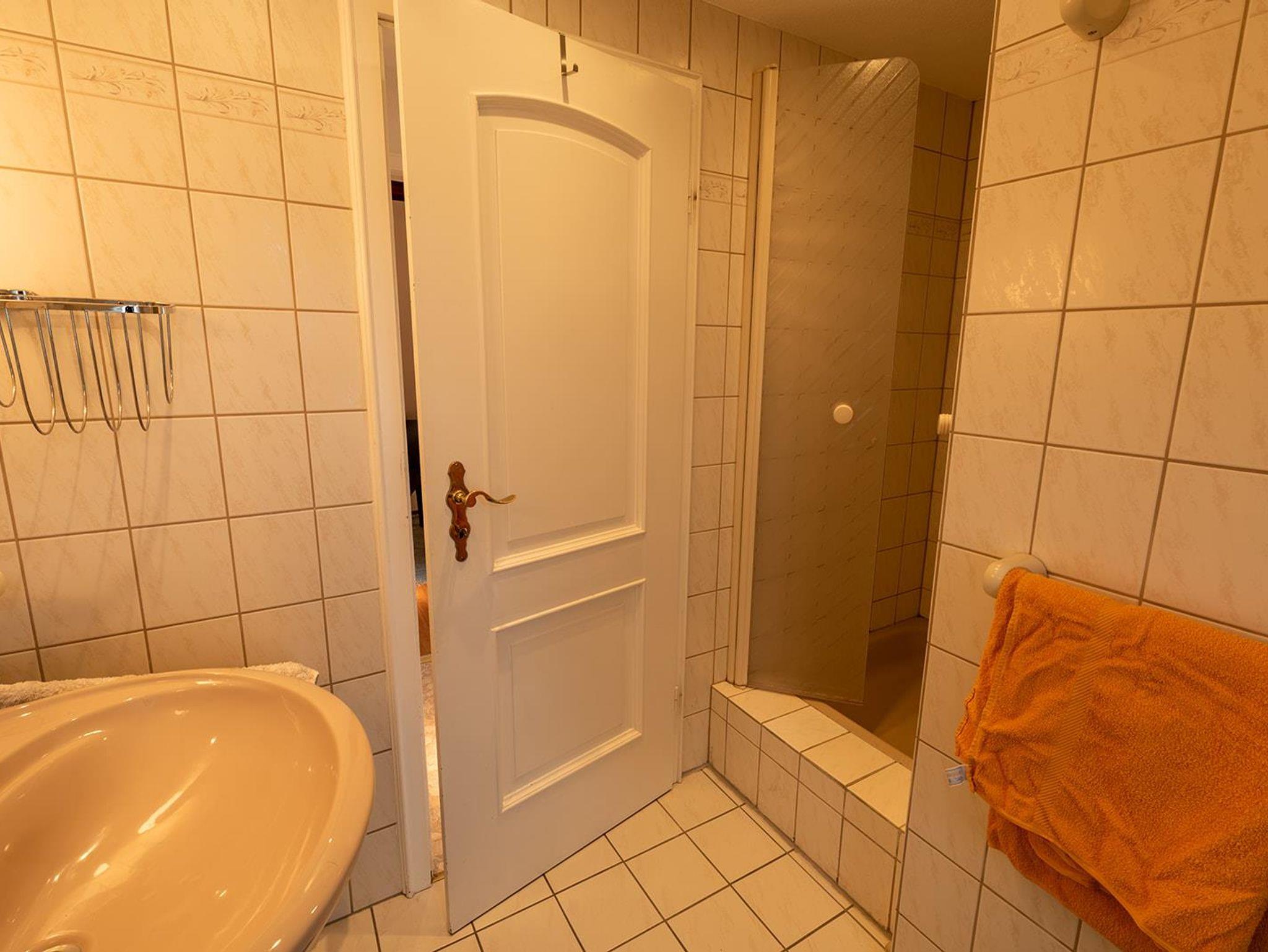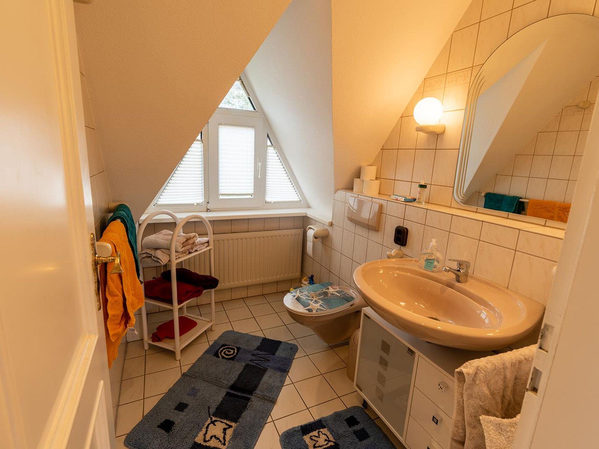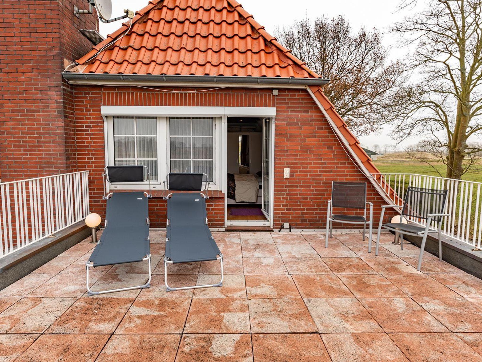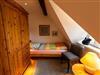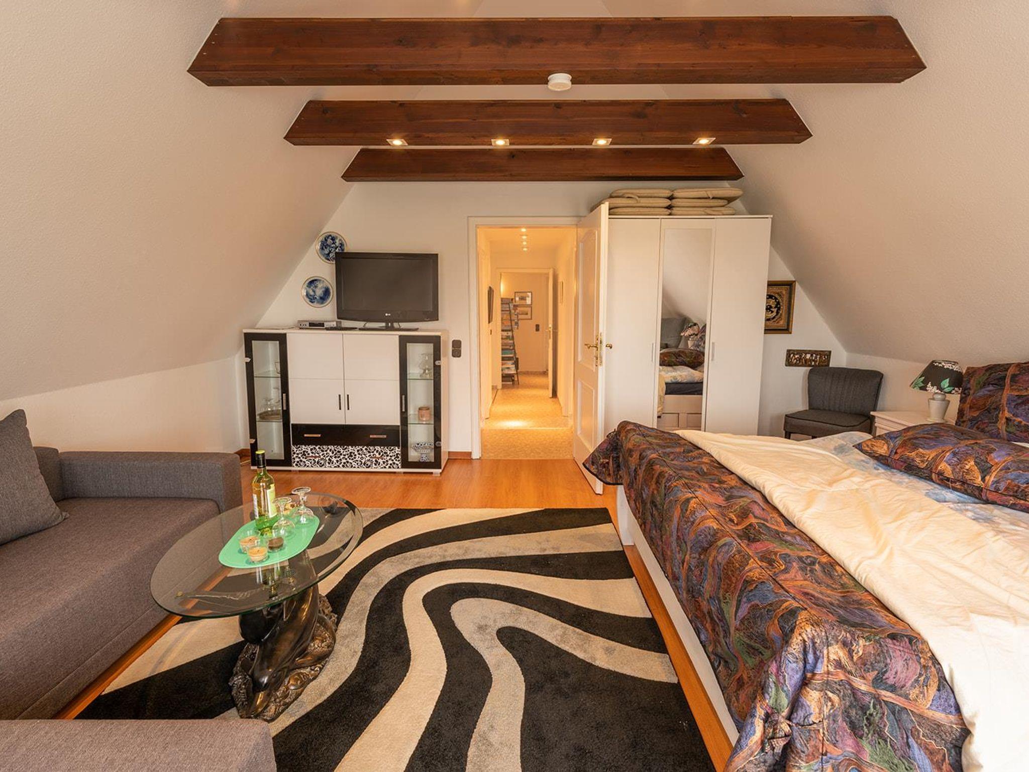 Die im Obergeschoss befindliche Ferienwohnung besitzt neben der Vollküche ein seperates Schlafzimmer mit zwei Einzelbetten. Die an das große Wohnschlafzimmer angegliederte Dachterasse, bietet viel Platz für die ganze Familie. Eine externe Treppe führt direkt von der Terasse in den Garten. Das Badezimmer ist mit Dusche ausgestattet, ein Sat-TV befinden sich im Wohnschlafzimmer.