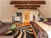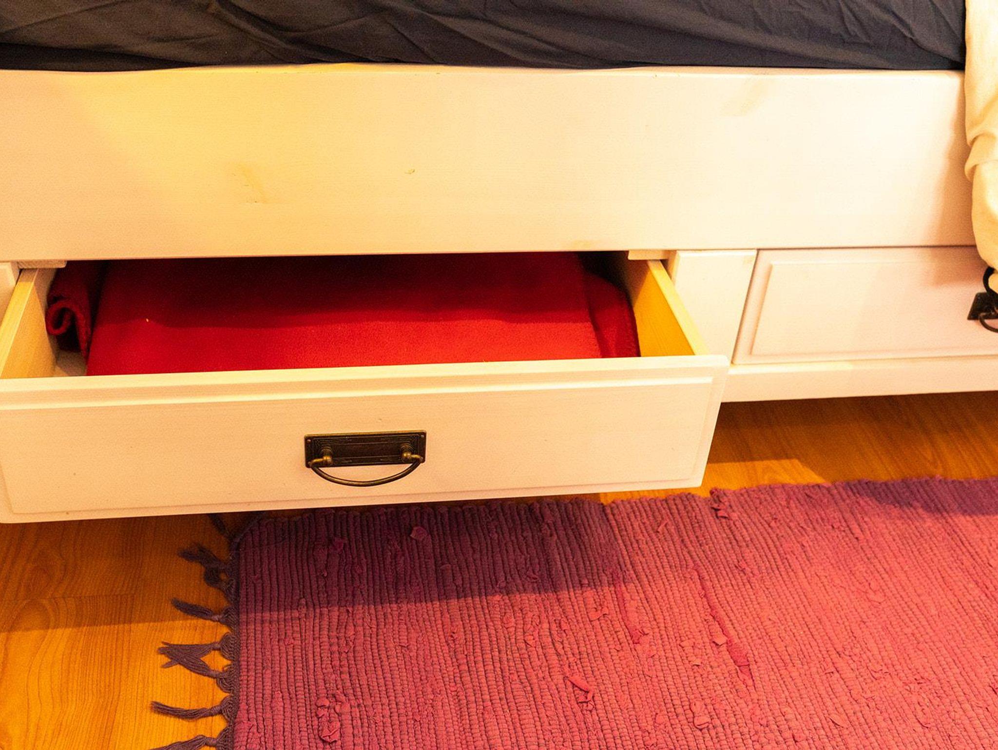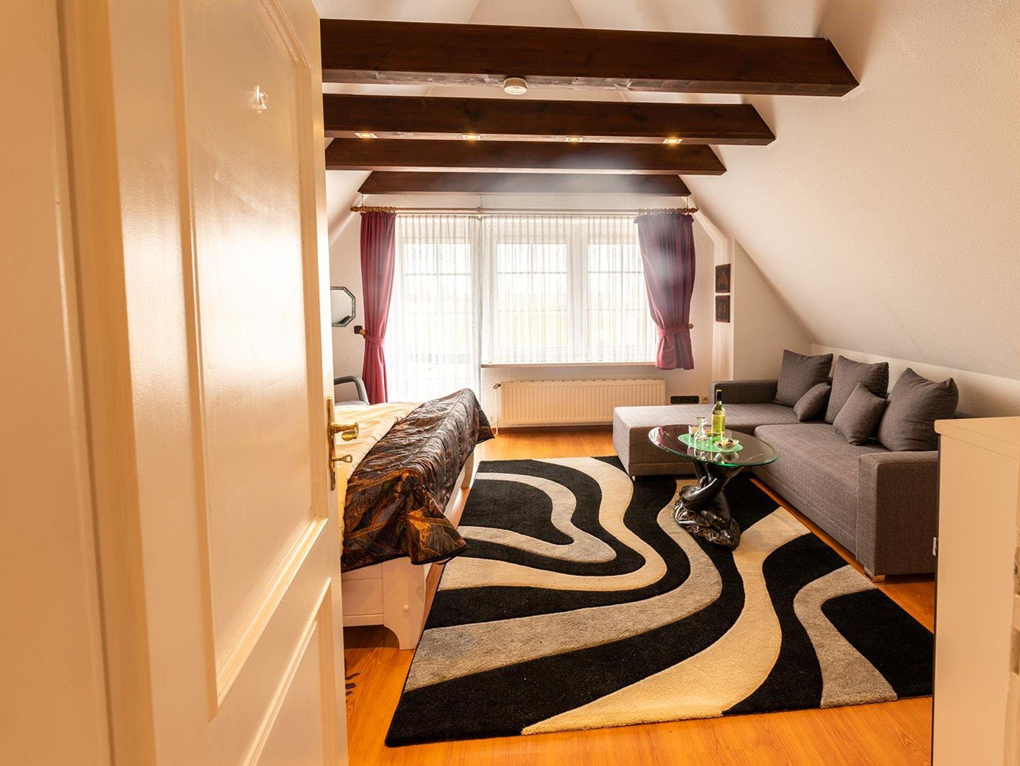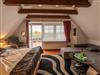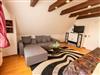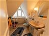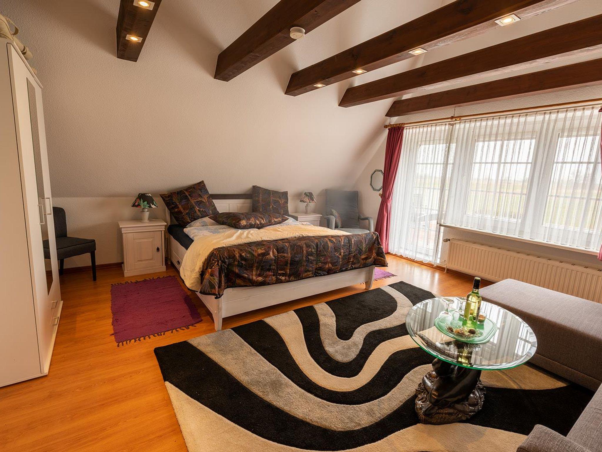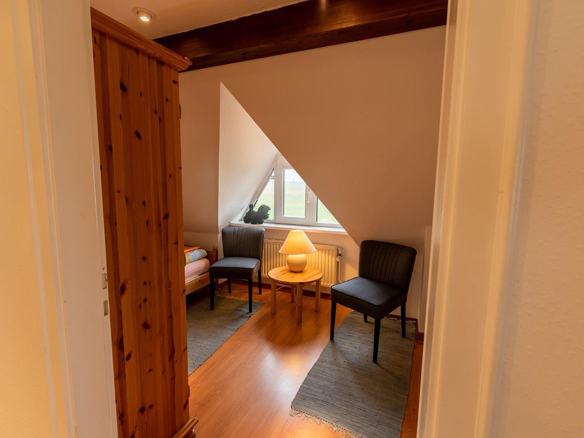 Die im Obergeschoss befindliche Ferienwohnung besitzt neben der Vollküche ein seperates Schlafzimmer mit zwei Einzelbetten. Die an das große Wohnschlafzimmer angegliederte Dachterasse, bietet viel Platz für die ganze Familie. Eine externe Treppe führt direkt von der Terasse in den Garten. Das Badezimmer ist mit Dusche ausgestattet, ein Sat-TV befinden sich im Wohnschlafzimmer.
