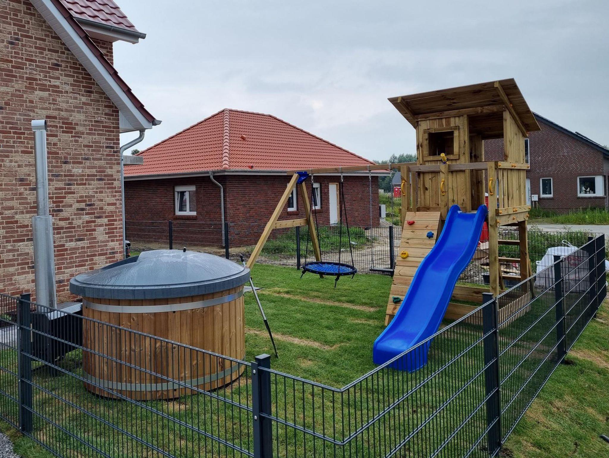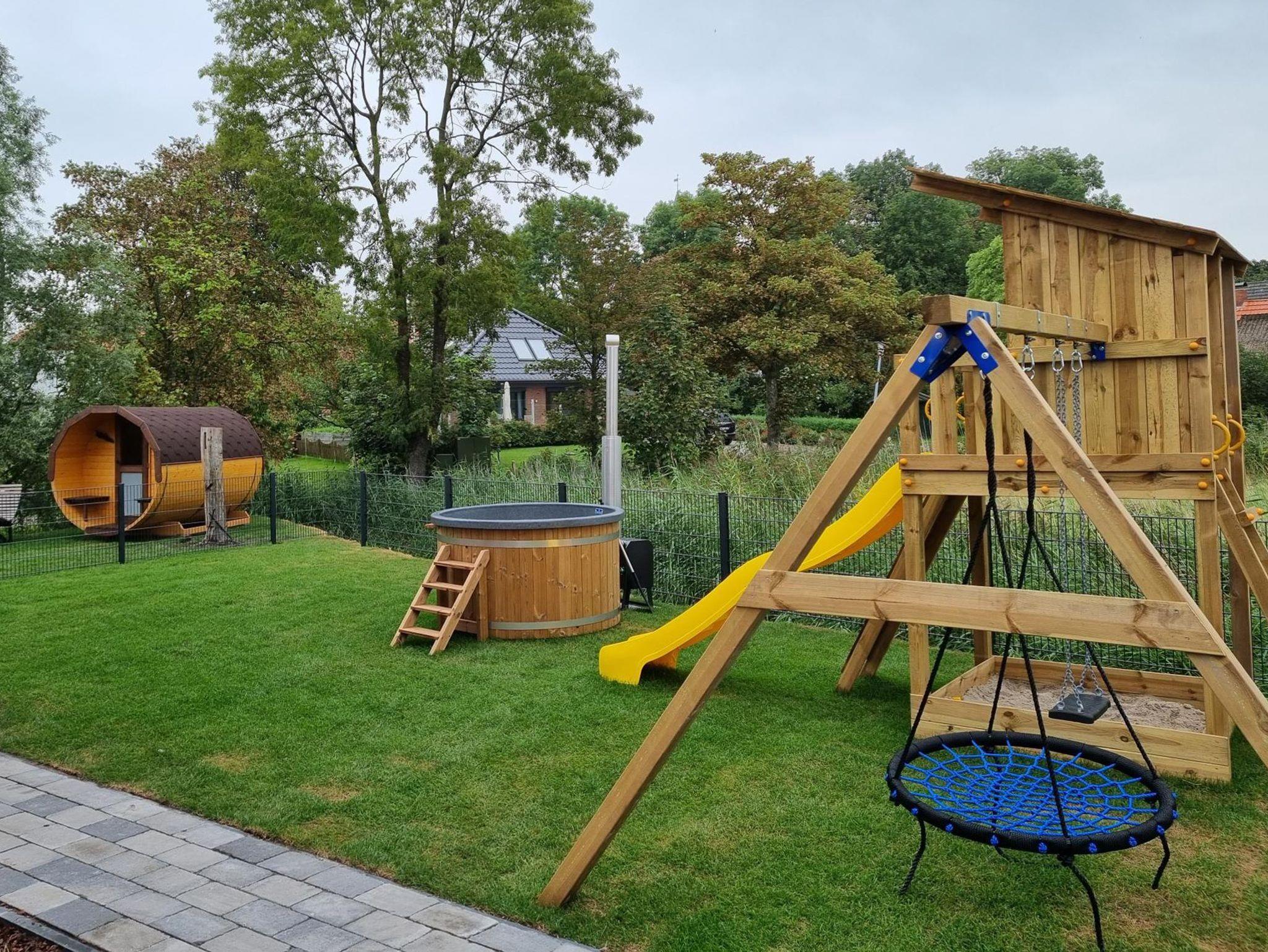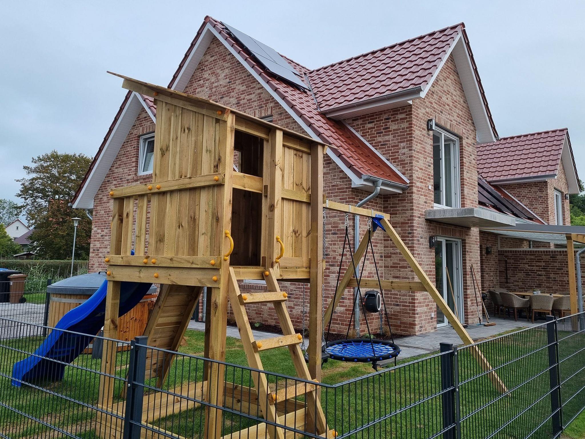 Es gibt einen eigenen großzügigen Garten, der komplett eingezäunt ist. Ebenso finden Kinder tolle Überraschungen, wie den großen Spielturm mit Sandkasten. Außerdem gibt es einen beheizbaren Holzpool, welcher auch bei kälteren Jahreszeiten genutzt (Nutzung gegen eine kleine Gebühr) werden kann. Im Garten vor dem Haus, befindet sich ein Wellnessbereich mit einer tollen finnischen Gartensauna (Nutzung gegen eine kleine Gebühr) mit Regendusche und Entspannungsmöglichkeiten.