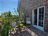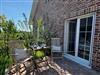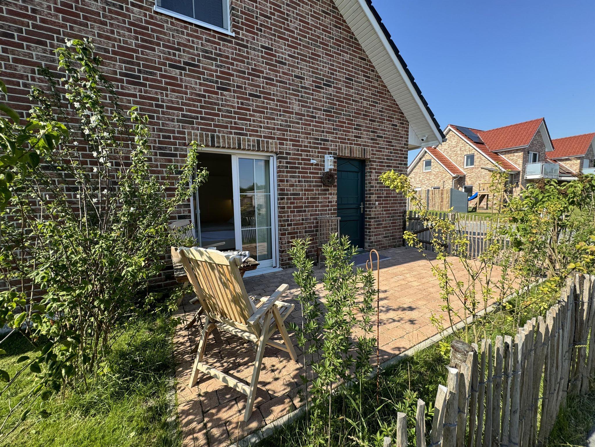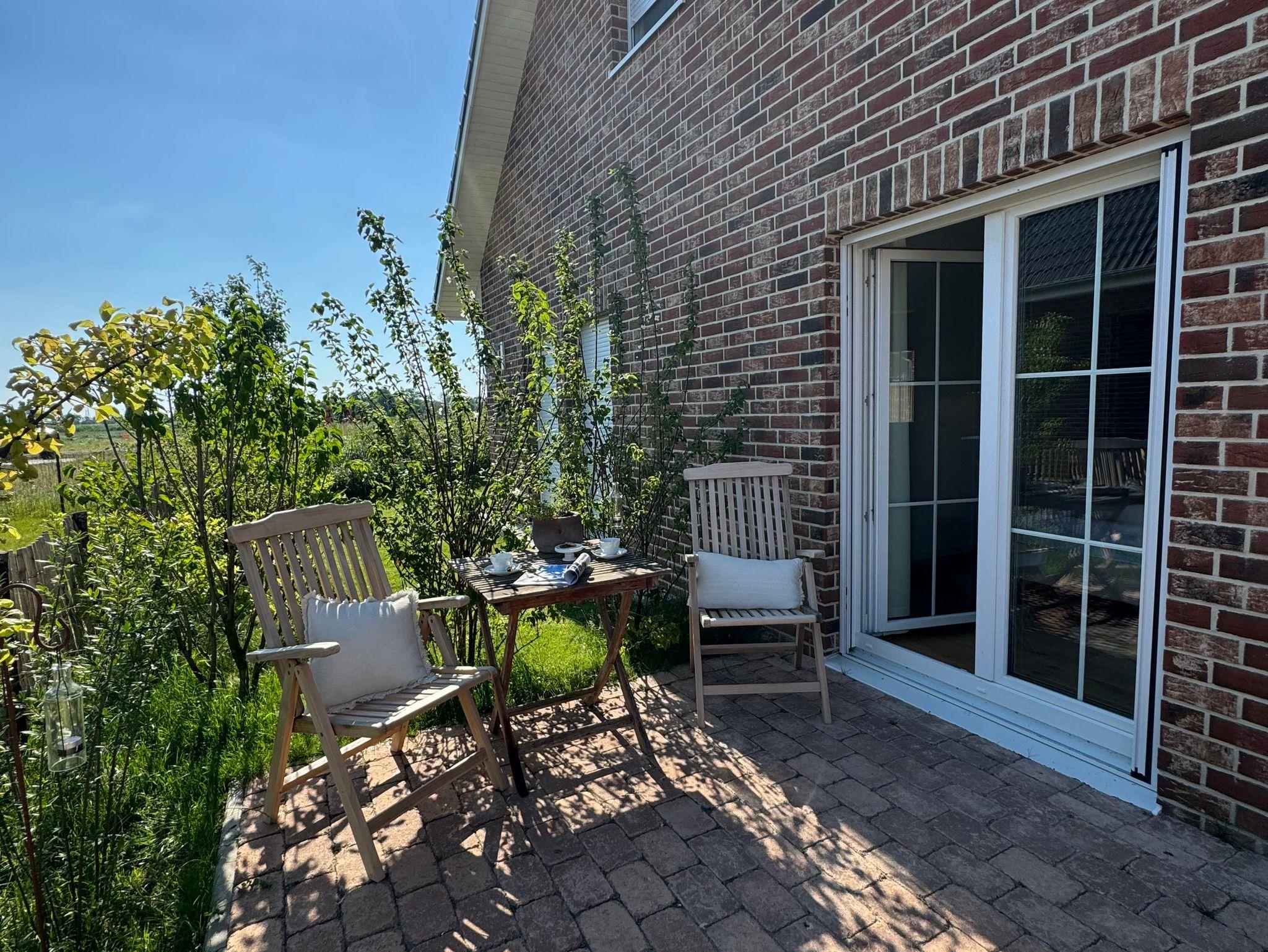 eingefriedete Terrasse mit Holz-Tisch und Holz-Stühlen