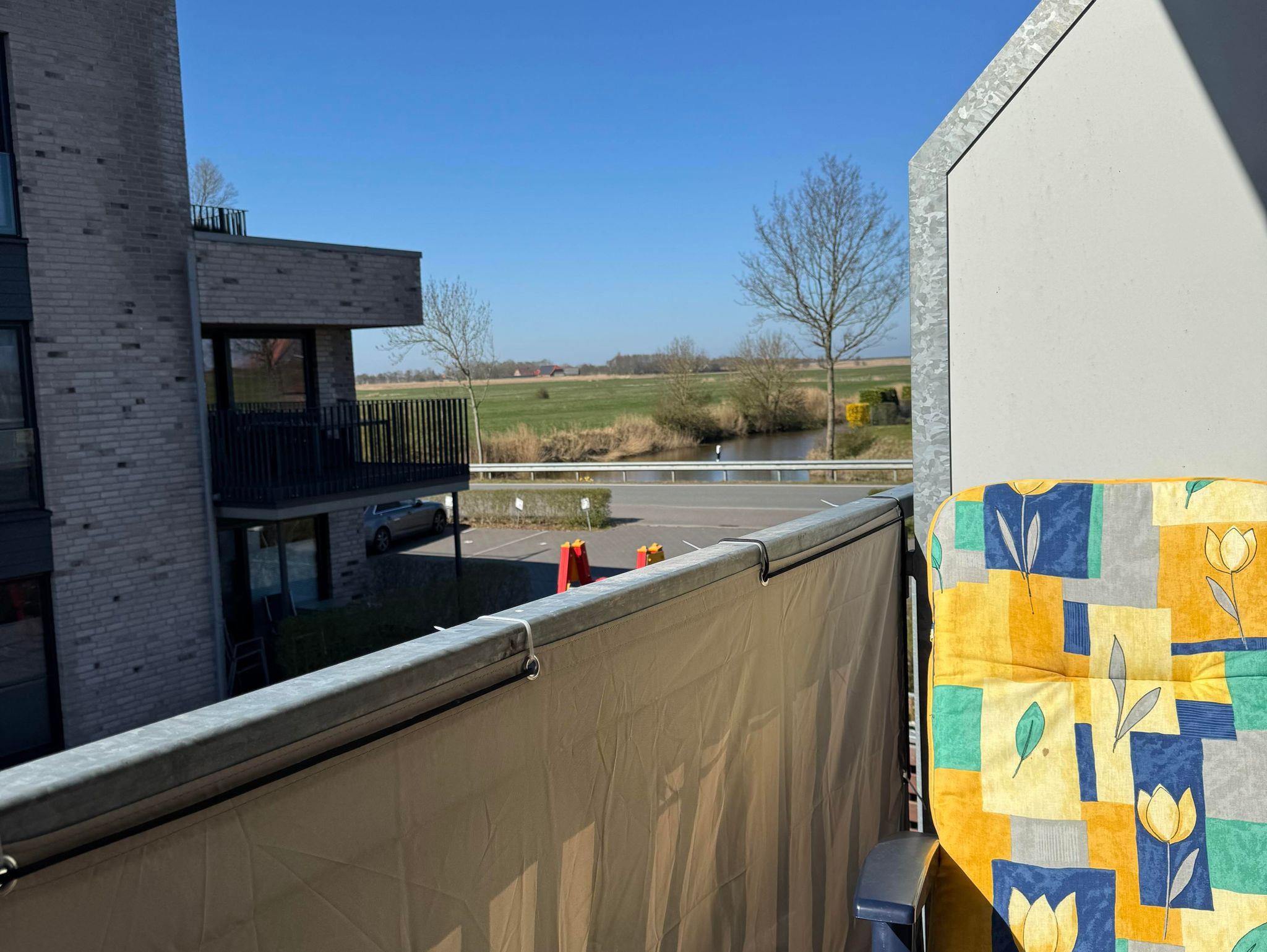 • kleiner Balkon mit Bankirai Holzboden, Blick auf den Deich