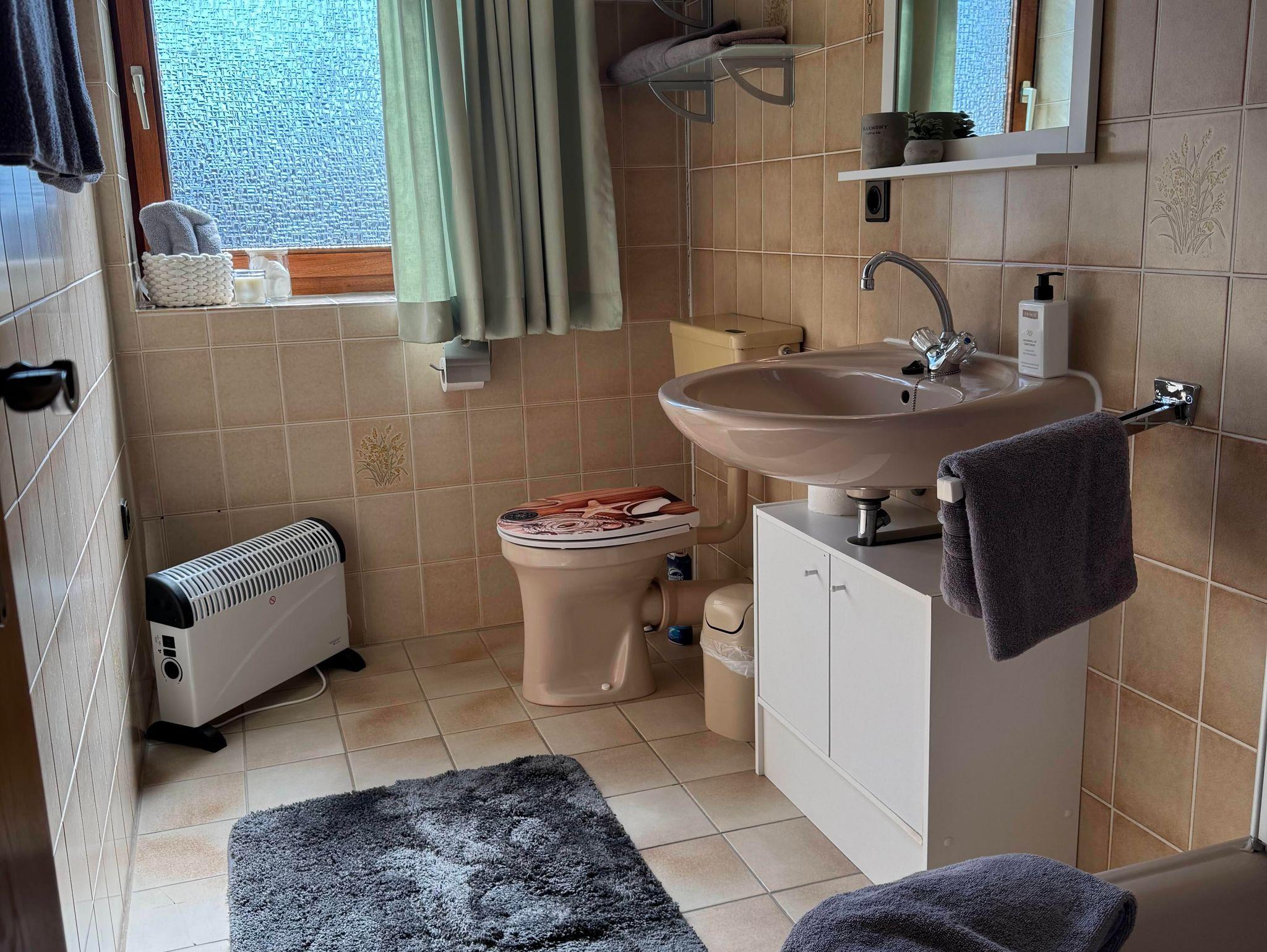 • Bad mit Dusche, WC, Waschbecken. Das Bad verfügt über ein Fenster
