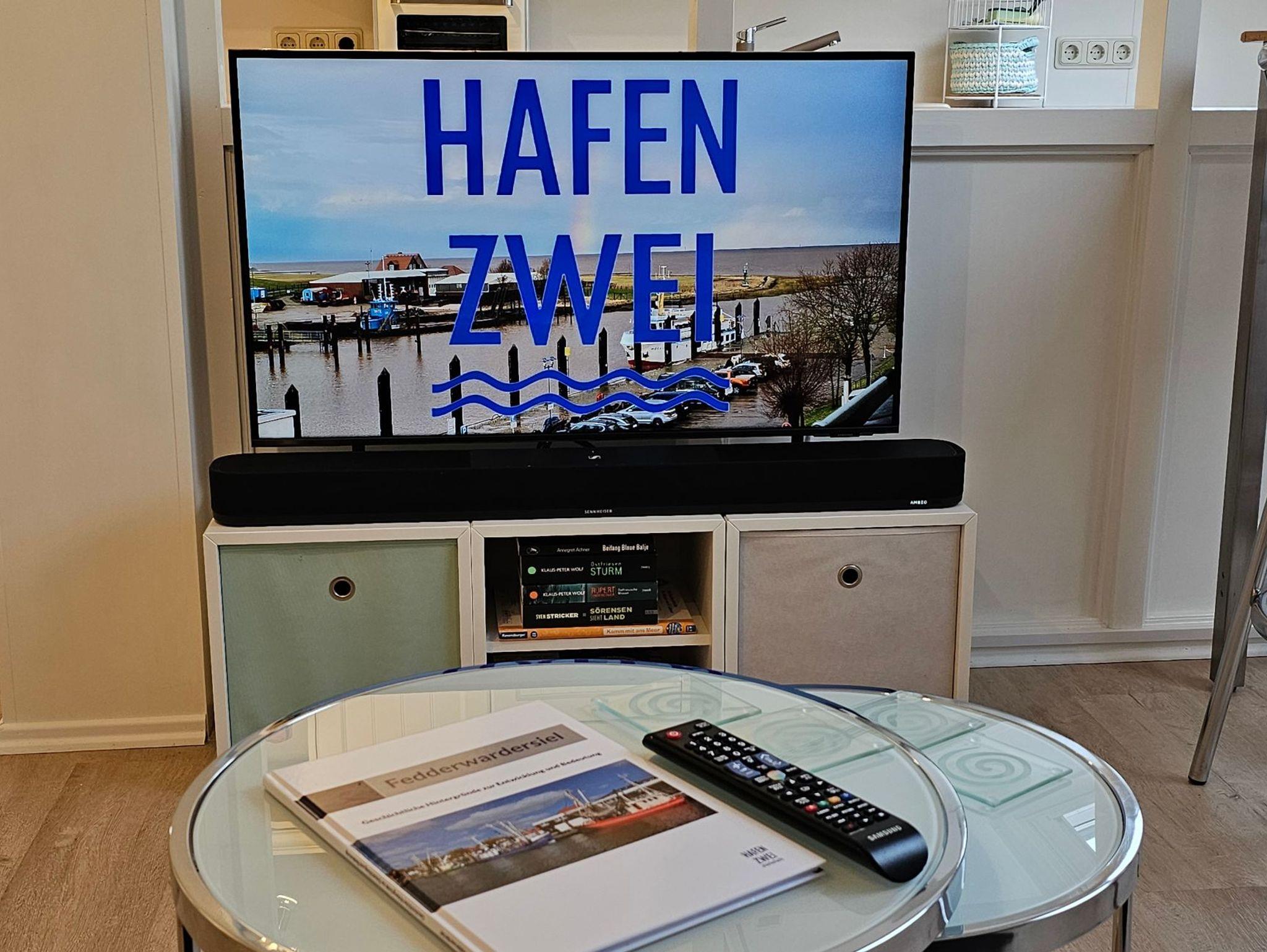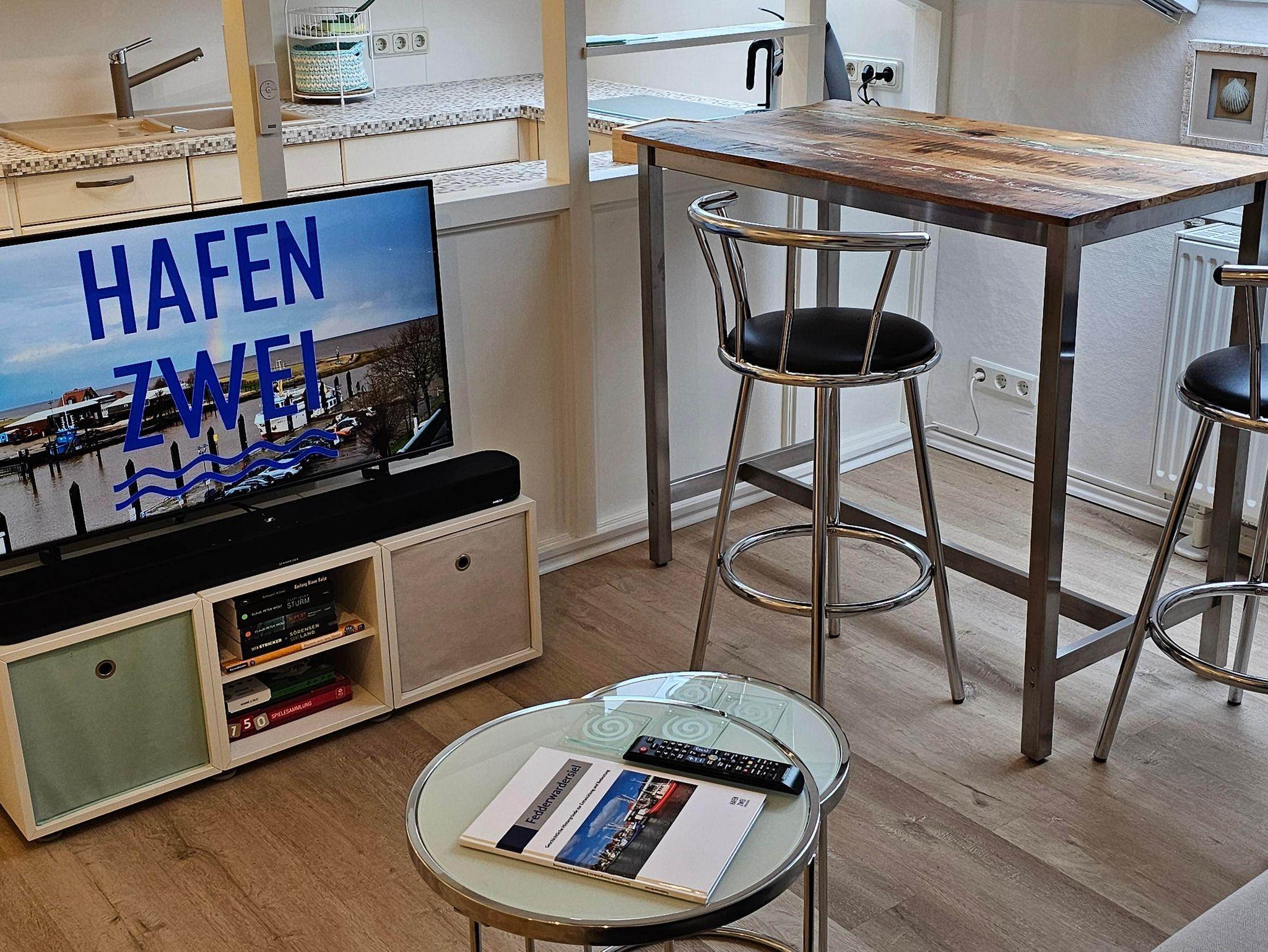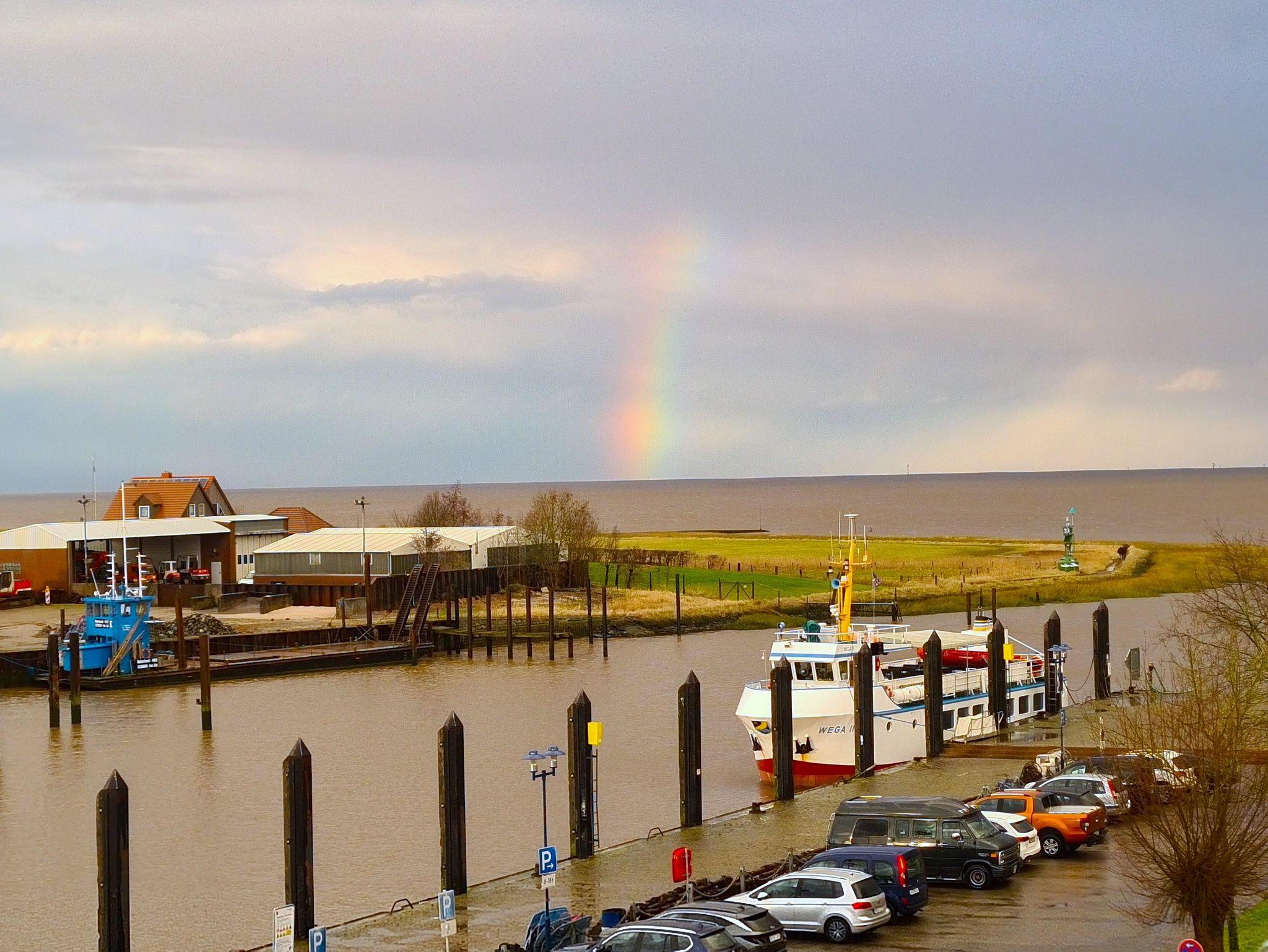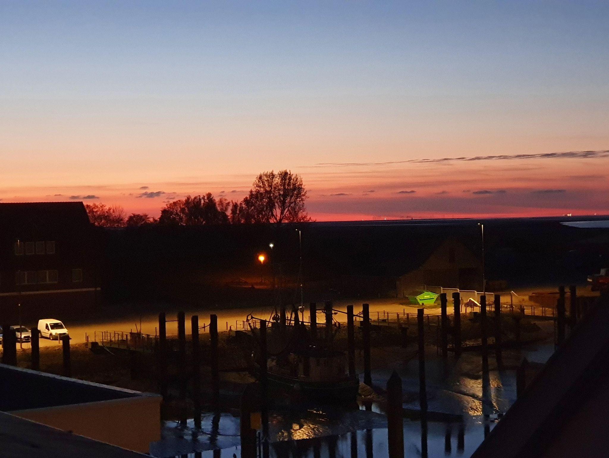 Beim Betreten der Wohnung im Dachgeschoss in der zweiten Etage gelangen Sie in einen kleinen Flur mit Garderobe, Spiegeln und Schränken mit reichlich Stauraum. Zur linken Seite befindet sich das Badezimmer mit WC, Eckdusche und Badewanne. Ihr Bad können Sie unter einem künstlichen Sternenhimmel genießen. Der echte Sternenhimmel ist durch das Dachfenster zu beobachten. Wenn Sie vom Flur weiter geradeaus gehen, gelangen Sie in den Wohnraum mit abgetrennter Küche. In der sehr gut ausgestatteten Küche befinden sich als Sonderausstattung ein Geschirrspüler, eine Waschmaschine/Wäschetrockner, ein kleiner Backofen und ein Induktionskochfeld. Damit stehen Ihrem genussvollen Essen keine Hindernisse im Weg. Ihren duftenden Kaffee können Sie in einer Senseo, Filterkaffeemaschine oder Frenchpress zubereiten, eine kleine Auswahl an Teesorten steht ebenfalls für Sie bereit. Im Wohnraum erwartet Sie eine hohe Esstheke mit Barhockern für ein wohlschmeckendes Essen mit einem traumhaften Blick auf den Hafen, die Marsch, den Nationalpark und die Nordsee. Von langen Wanderungen an der Küste können Sie sich auch auf dem Sofa erholen. Ein Smart-TV erlaubt Ihnen die Nutzung von kostenfreien Streamingdiensten. Eine Sennheiser Ambeo Soundbar plus sorgt für den richtigen Sound. Mobiles Arbeiten ermöglicht ein kleiner Tisch mit zwei Stühlen. Hier steht auch ein ausklappbares komfortables Schlafsofa für 2 Personen. Hinter dem Wohnzimmer schließt sich das Schlafzimmer an, in dem ein weiterer Tisch mit Stuhl, ein Kleiderschrank und zusätzlicher Stauraum genutzt werden können. Das Doppelbett hat eine komfortable Breite von 180cm, Bettdecken und Kopfkissen sind Allergiker freundlich. Im Schlafzimmer ist ein Dachfenster, von dem aus Sie ebenfalls auf die Nordsee gucken können. Alle Dachfenster sind verdunkelbar und sind, bis auf das Bad mit Insektengittern versehen. Ebenfalls Am Hafen, nur ein paar Meter entfernt, können Sie gepflegt im Restaurant Dat Havenhuus oder dem Restaurant Nordseeblick speisen.
