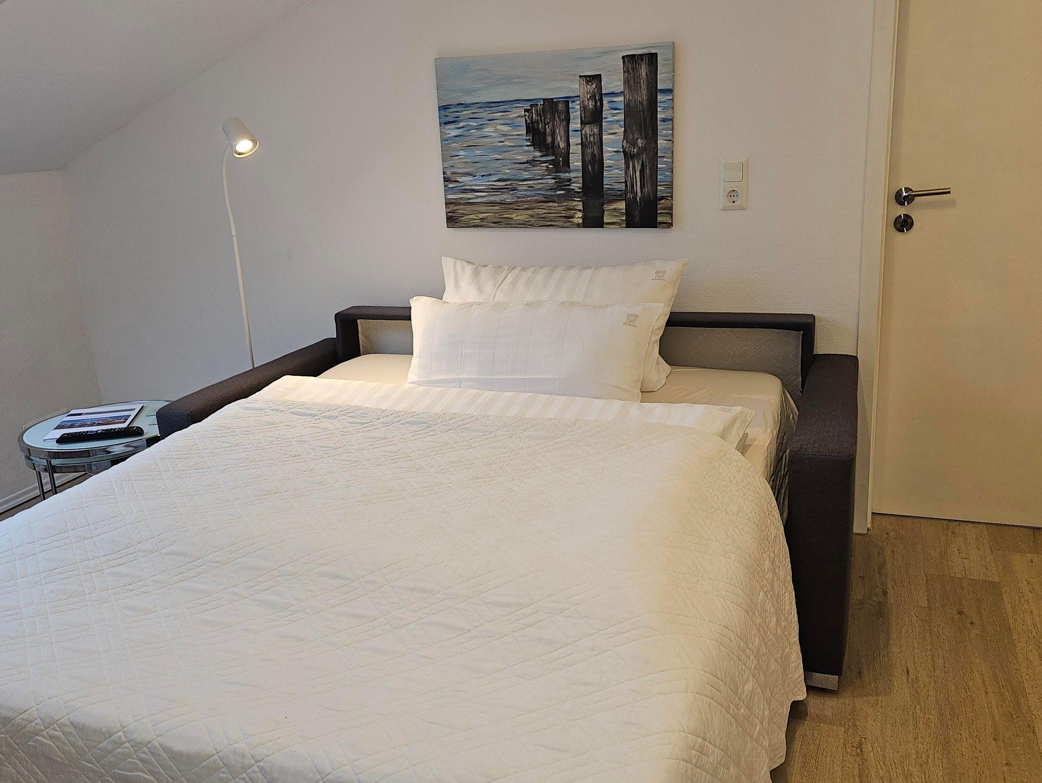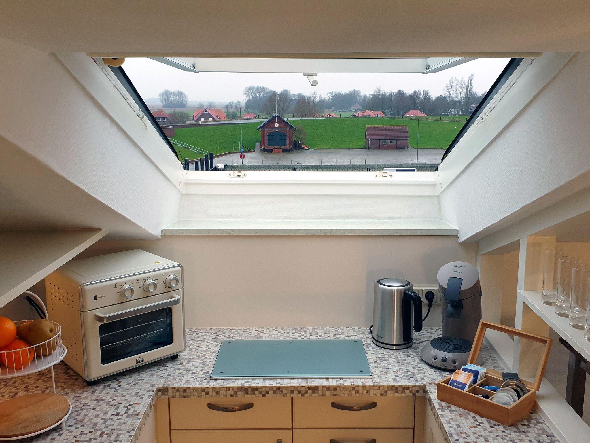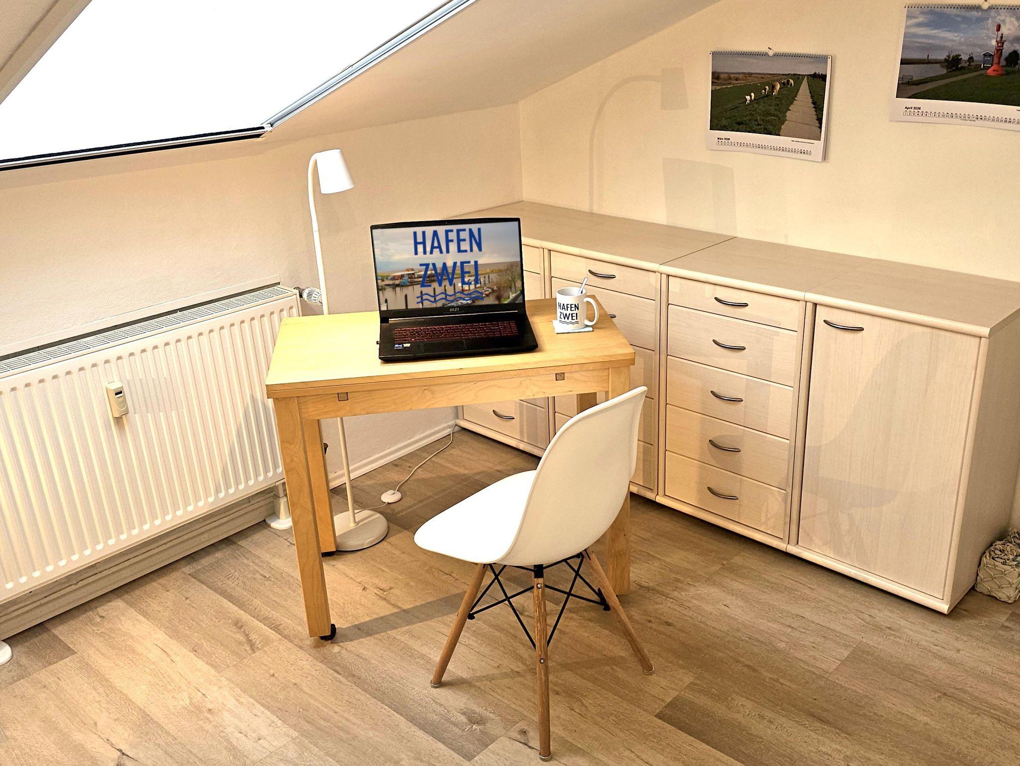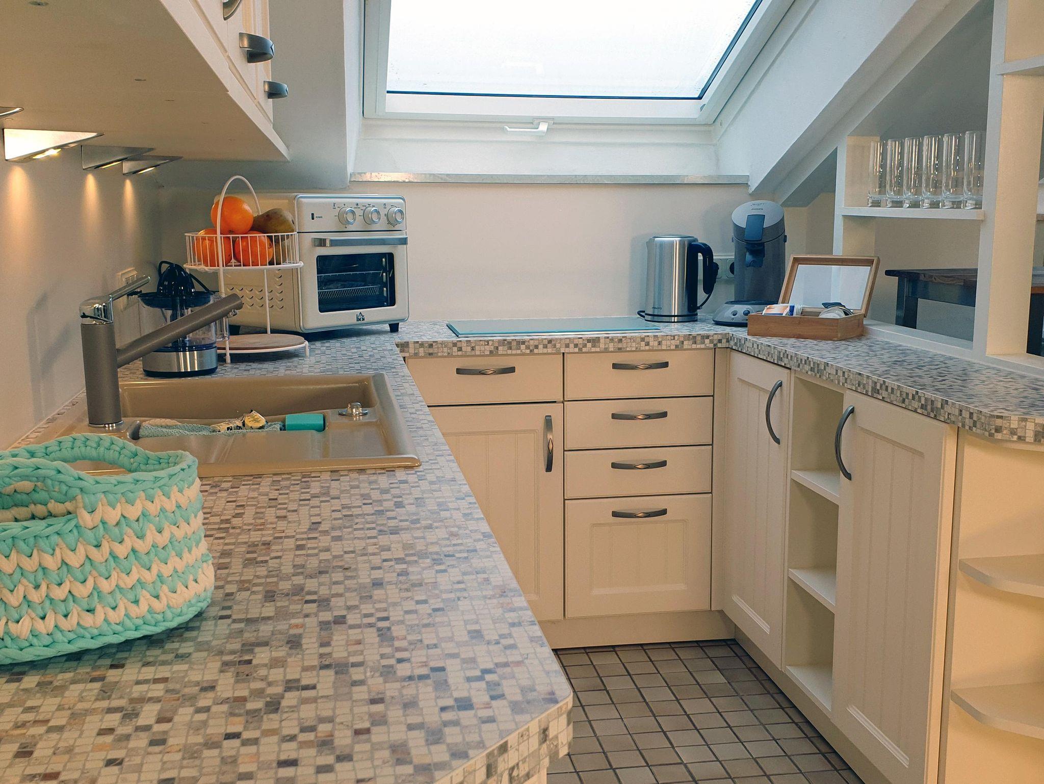 Beim Betreten der Wohnung im Dachgeschoss in der zweiten Etage gelangen Sie in einen kleinen Flur mit Garderobe, Spiegeln und Schränken mit reichlich Stauraum. Zur linken Seite befindet sich das Badezimmer mit WC, Eckdusche und Badewanne. Ihr Bad können Sie unter einem künstlichen Sternenhimmel genießen. Der echte Sternenhimmel ist durch das Dachfenster zu beobachten. Wenn Sie vom Flur weiter geradeaus gehen, gelangen Sie in den Wohnraum mit abgetrennter Küche. In der sehr gut ausgestatteten Küche befinden sich als Sonderausstattung ein Geschirrspüler, eine Waschmaschine/Wäschetrockner, ein kleiner Backofen und ein Induktionskochfeld. Damit stehen Ihrem genussvollen Essen keine Hindernisse im Weg. Ihren duftenden Kaffee können Sie in einer Senseo, Filterkaffeemaschine oder Frenchpress zubereiten, eine kleine Auswahl an Teesorten steht ebenfalls für Sie bereit. Im Wohnraum erwartet Sie eine hohe Esstheke mit Barhockern für ein wohlschmeckendes Essen mit einem traumhaften Blick auf den Hafen, die Marsch, den Nationalpark und die Nordsee. Von langen Wanderungen an der Küste können Sie sich auch auf dem Sofa erholen. Ein Smart-TV erlaubt Ihnen die Nutzung von kostenfreien Streamingdiensten. Eine Sennheiser Ambeo Soundbar plus sorgt für den richtigen Sound. Mobiles Arbeiten ermöglicht ein kleiner Tisch mit zwei Stühlen. Hier steht auch ein ausklappbares komfortables Schlafsofa für 2 Personen. Hinter dem Wohnzimmer schließt sich das Schlafzimmer an, in dem ein weiterer Tisch mit Stuhl, ein Kleiderschrank und zusätzlicher Stauraum genutzt werden können. Das Doppelbett hat eine komfortable Breite von 180cm, Bettdecken und Kopfkissen sind Allergiker freundlich. Im Schlafzimmer ist ein Dachfenster, von dem aus Sie ebenfalls auf die Nordsee gucken können. Alle Dachfenster sind verdunkelbar und sind, bis auf das Bad mit Insektengittern versehen. Ebenfalls Am Hafen, nur ein paar Meter entfernt, können Sie gepflegt im Restaurant Dat Havenhuus oder dem Restaurant Nordseeblick speisen.