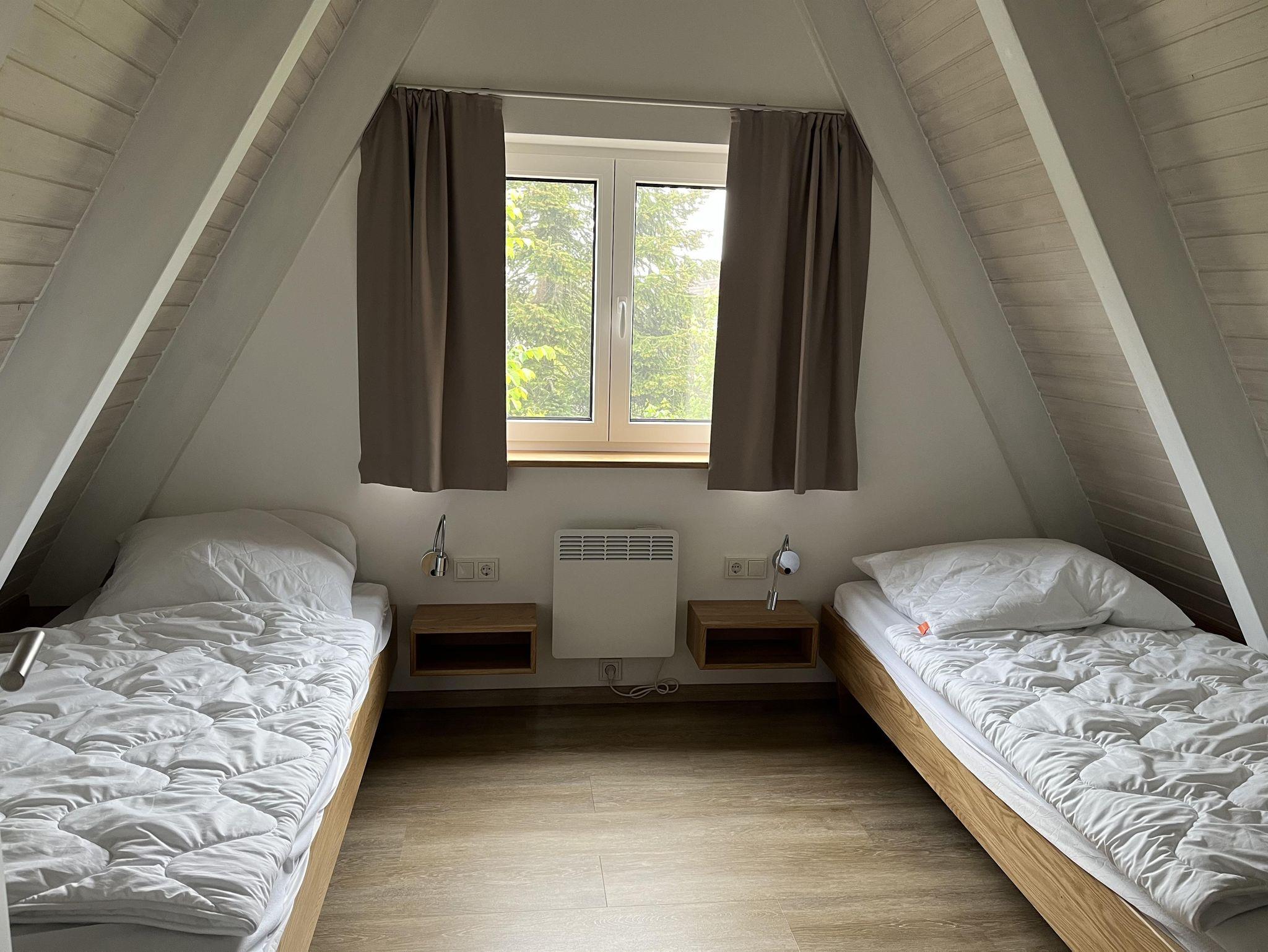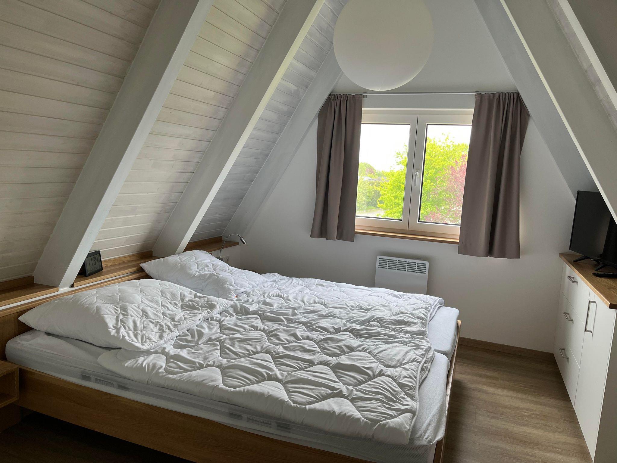 Im OG befinden sich 2 Schlafzimmer. Das Elternschlafzimmer ist mit einem Doppelbett, einem Kleiderschrank, sowie einem Flachbildfernseher ausgestattet. Hier kann zusätzlich das vorhandene Klappbett und ein Baby-Reisebett aufgestellt werden. (Auch für sind eine separate Matratze, Bettdecke und Kissen vorhanden) Im zweiten Schlafzimmer sind zwei Einzelbetten. Beide Schlafzimmer sind mit Insektenschutzrahmen und abdunkelnden Gardinen ausgestattet, sodass auch die Kinder im Urlaub etwas länger schlafen können. An der Treppe ist ein Treppenschutzgitter angebracht.
