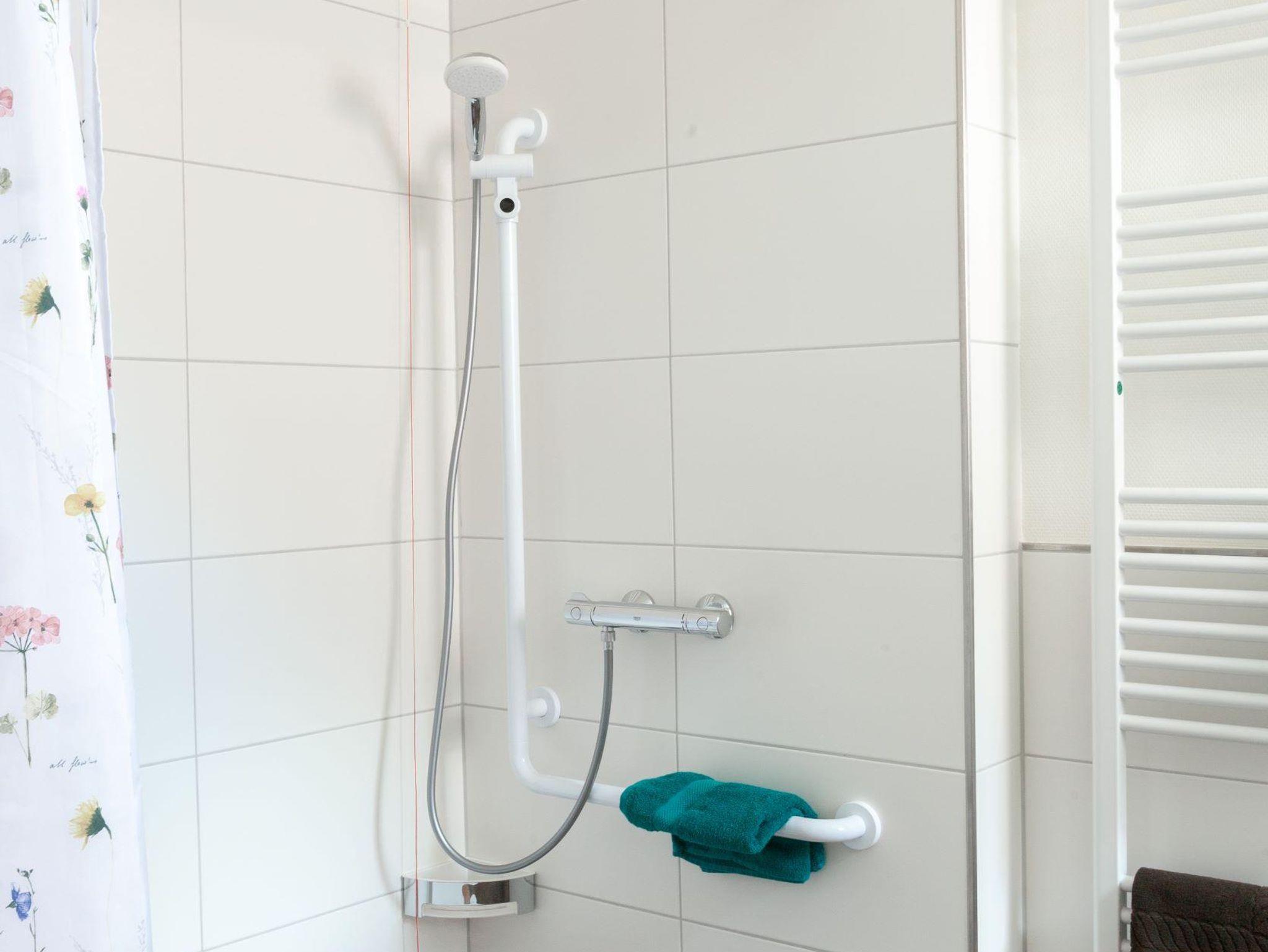 Duschbad/WC (unten) Wohlfühlen und barrierefrei bewegen, das geht hier. Ausstattung: Bodenebener Duschbereich mit Duschsitz und Haltestangen, Vollabtrennung mittels Vorhang. WC (erhöht) mit Haltegriffen, Waschbecken (unterfahrbar) mit Ablage, beleuchteter Spiegel, el. Handtuch-Heizkörper, Schiebetürbreite 100cm. Alarmschalter im Duschbereich und am WC.